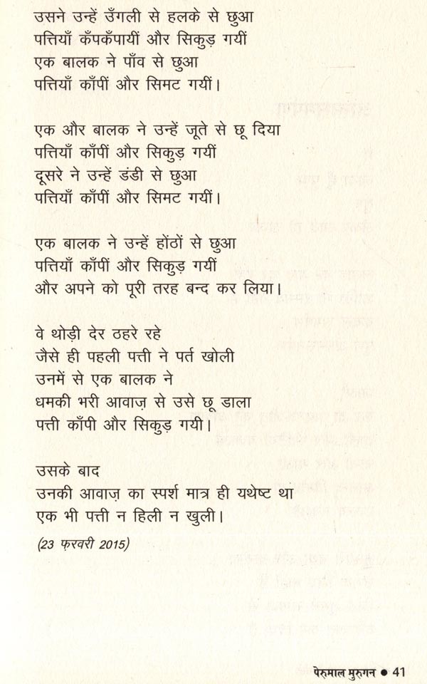 मैंने अपने पिता को, जो पढ़ना-लिखना नहीं जानते थे, दस्तखत करना सिखाया था। मेरे पास उनका एक भी फोटो नहीं है बस उनके दस्तखत हैं जो उन्होंने मेरी दसवीं कक्षा की रजिस्ट्री पर किये थे। उन दस्तखतों को देखता हूँ तो मुझे ऐसा लगता है जैसेकि मैं उन्हीं को देख रहा हूँ। श्रीनिवास ने उन हस्ताक्षर को बहुत ही सुन्दर ढंग से फिर से बनाया और उसे तमिल संस्करण के मुखपृष्ठ पर जड़ा। मैं उनकी इस सृजनता के लिए उनका आभारी हूँ।