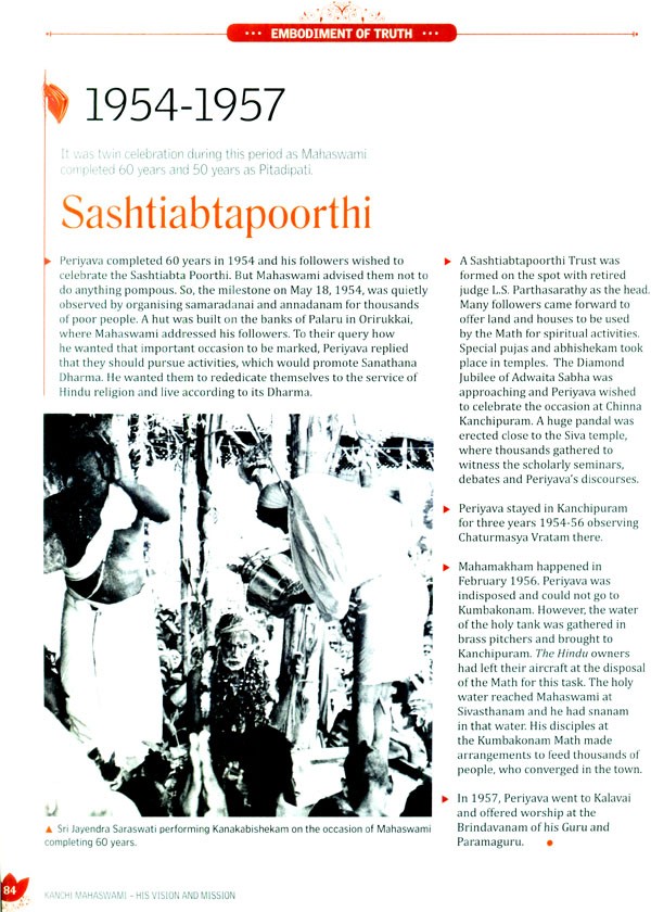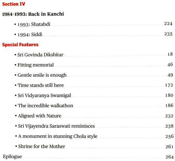 This volume covers his life, travel and discourses from 1942 until his passing in 1994, aged 100. It describes in detail his travels and activities in Tamil Nadu, Andhra Pradesh and Karnataka, capturing his discourses and his advice to people. His message on the day India gained Independence, his advocacy of the right to religion as a fundamental right in the Constitution and his thoughts on important issues of the times have been dealt with in detail as also Sri Jayendra Saraswathi as the 69th pontiff and the induction of Sri Sankaran Vijayendra Saraswathi as the 70th pontiff. In addition, there are features on the imposing memorial built in his honor and descriptions of his day-to-day life and activities.