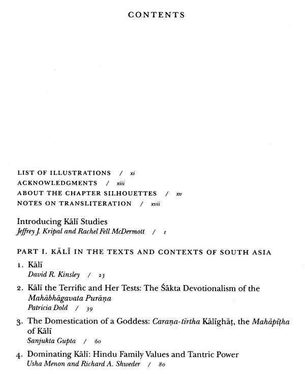 To arrive at a contemporary visualization of the Corpus Kali, I began looking for a model whose life and art spoke of an intense sexual energy. The Lolitaesque renditions of Kali as seen in Indian calendar art and popular posters were simply not reasonable models of inspiration. I see her as a dancer, always moving in relationship to a chronology of timelessness. In the dancer and choreographer Martha Graham, I have found an appropriate conceptual model for Kali. Her dances and technique come in part from a deeply sexual source. The image on the cover of the paperback edition of this volume is a homage to the Kali in Graham. Kali luxuriates in a very Graham-like expression of movement that thrusts the glory of her being out at us. It sings its eroticism right down to the particular velvet dark-blue that contains her energy in perfect equipoise. Kali's dark, luminous color and the expression on her face at once make her accessible emotionally and yet distance her from intimate communion. Visualizing the Goddess in this way stills the nervous system; one is becalmed under the fiery yet benevolent stare of the Devi, the luxuriant Goddess, the Mother and exemplar of in-tense feelings. Continuing to see her in the round, I have also created a series of fourteen drawings that appear as silhouettes throughout the book. These silhouettes help project the depth of Kali's force. She helps one be-long, particularly in the nascent dawn of late capitalism. There is much to see and understand.