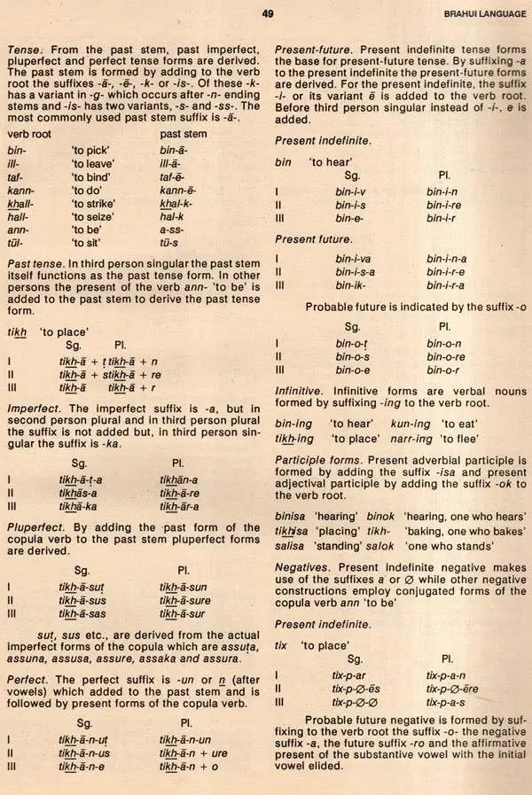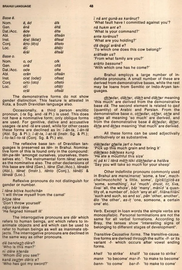 "Brahui a people mainly in Western Pakistan (Baluchistan and Sind) and also as neighbours or intermingled with the Baluchi population in several areas of Iran and Afghanistan. Total population about 600,000 (1967 estimate). The Brahui language has no writing system and is related to the Dravidian languages slthough it does not duplay a close relationship with any languages of Southern India. The language is divided into a series of dialects. Their religion is Istam of the Sunnite sect. Their occupations are semi-nomadic and nomadic cattle raising and so some extent, farming A small group of Brahui living in in Turkmen USSR is gradually merging with the Balochi.