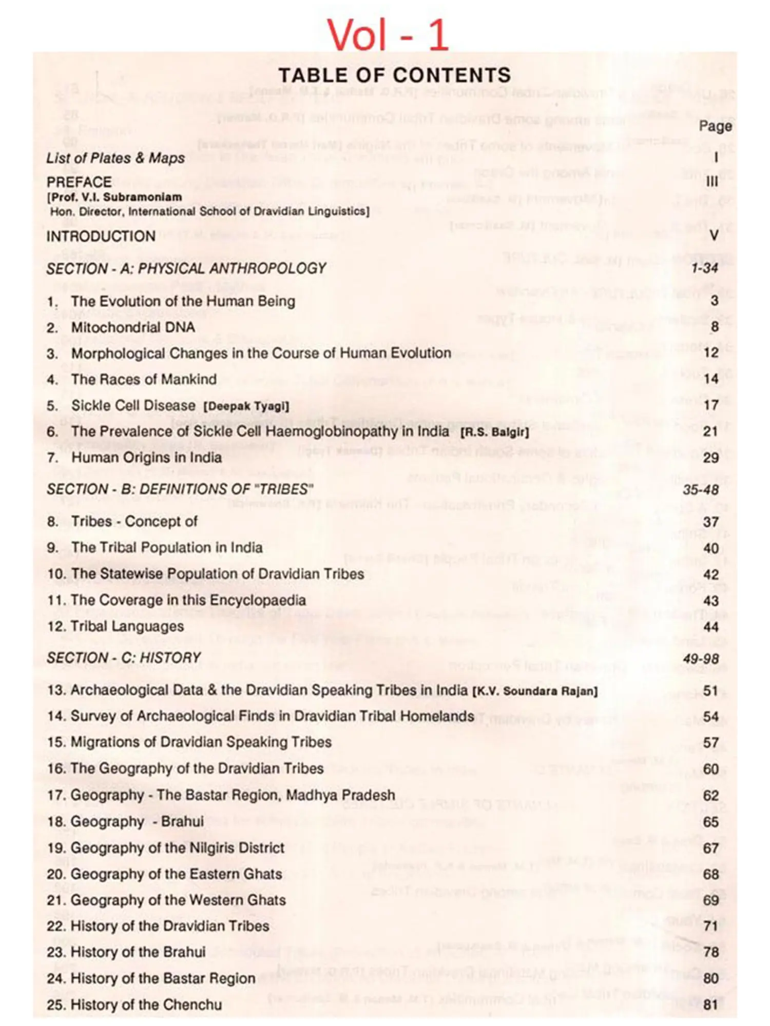 ISDL had devoted attention to the various studies undertaken by different scholars both in the academic institutions as well as els of the Dravidian Languages. These are generally without scripts and often relegated to the position of elsewhere on the "Tribal communities speaking one or another "dialects" of a dominant literary language in the vicinity These communities represant uniquely impor tant stages in the history of Dravidian Languages and Cultures. The early consolidation of the various studies on them appeared to be of critical importance because the process of change among them is rapid. It was therefore decided that an Encyclopaedia of Dravidian Tribes is an urgent necessity. It is envisaged as a three-volume compilation: this, the first, contains an over-all "schematic" coverage of the broad cultural characteristics spanning several of these communities, the emphasis being on these characteristics rather than on the individual communities. The second and the third volumes will be a community by community survey.