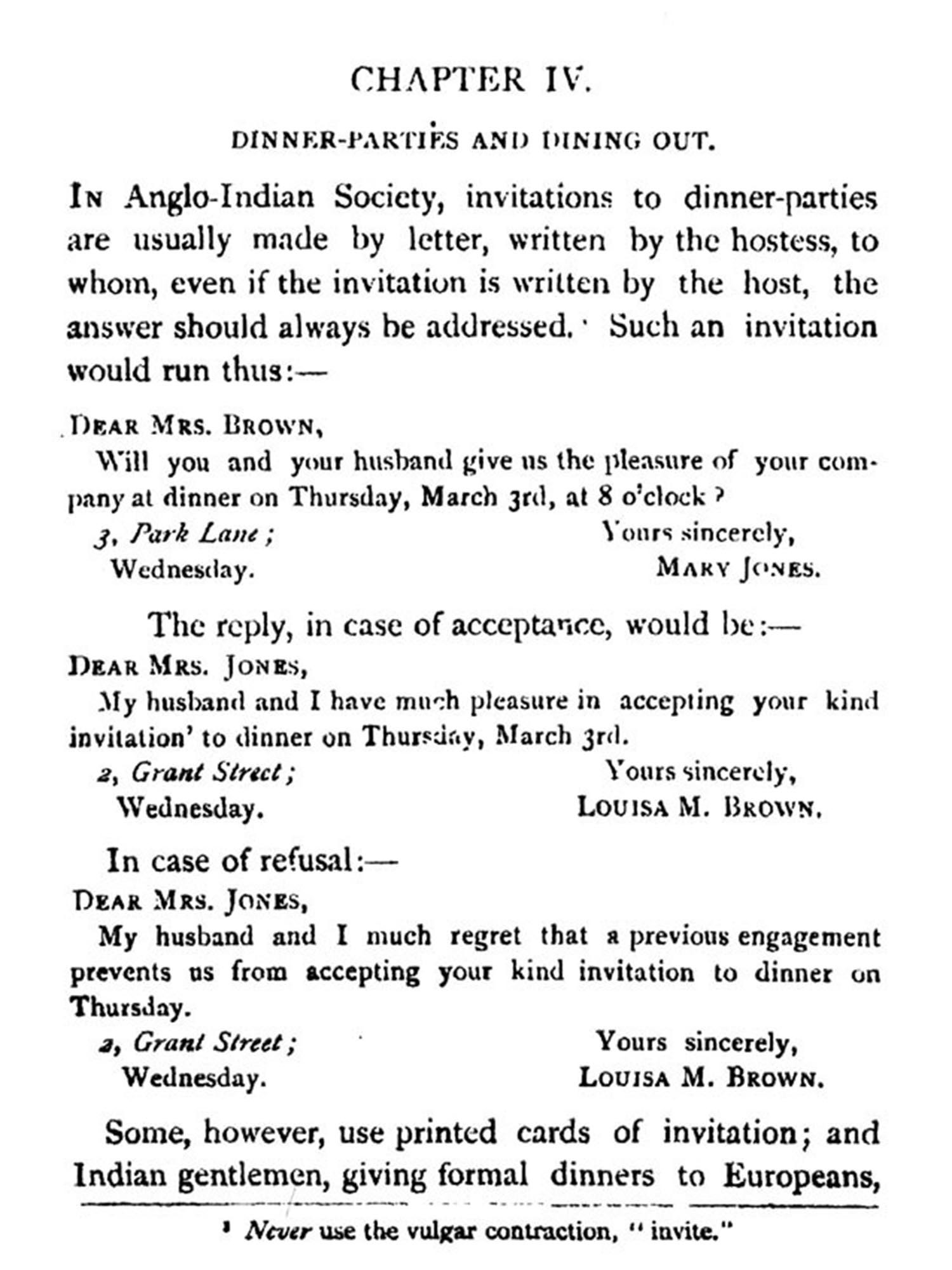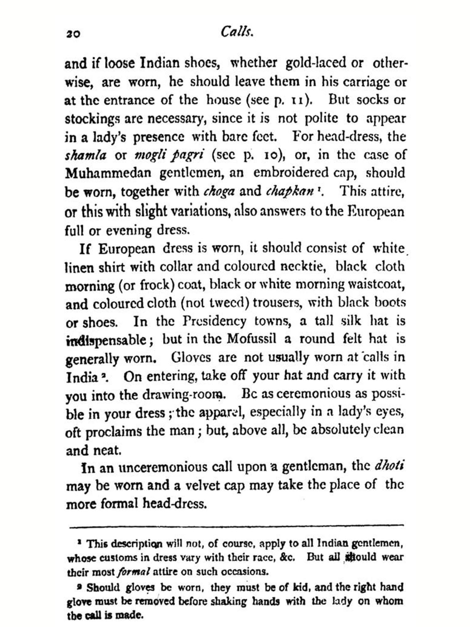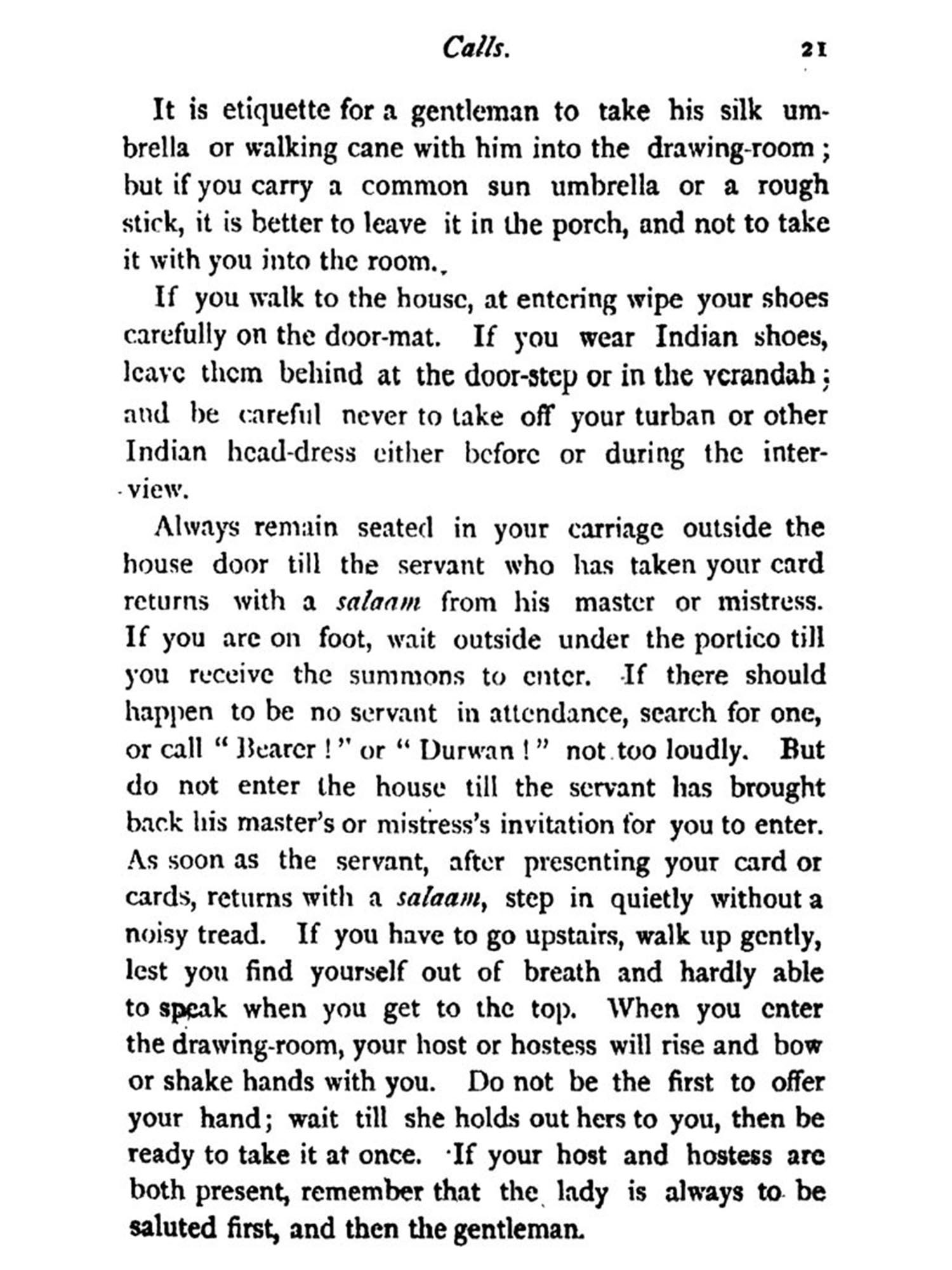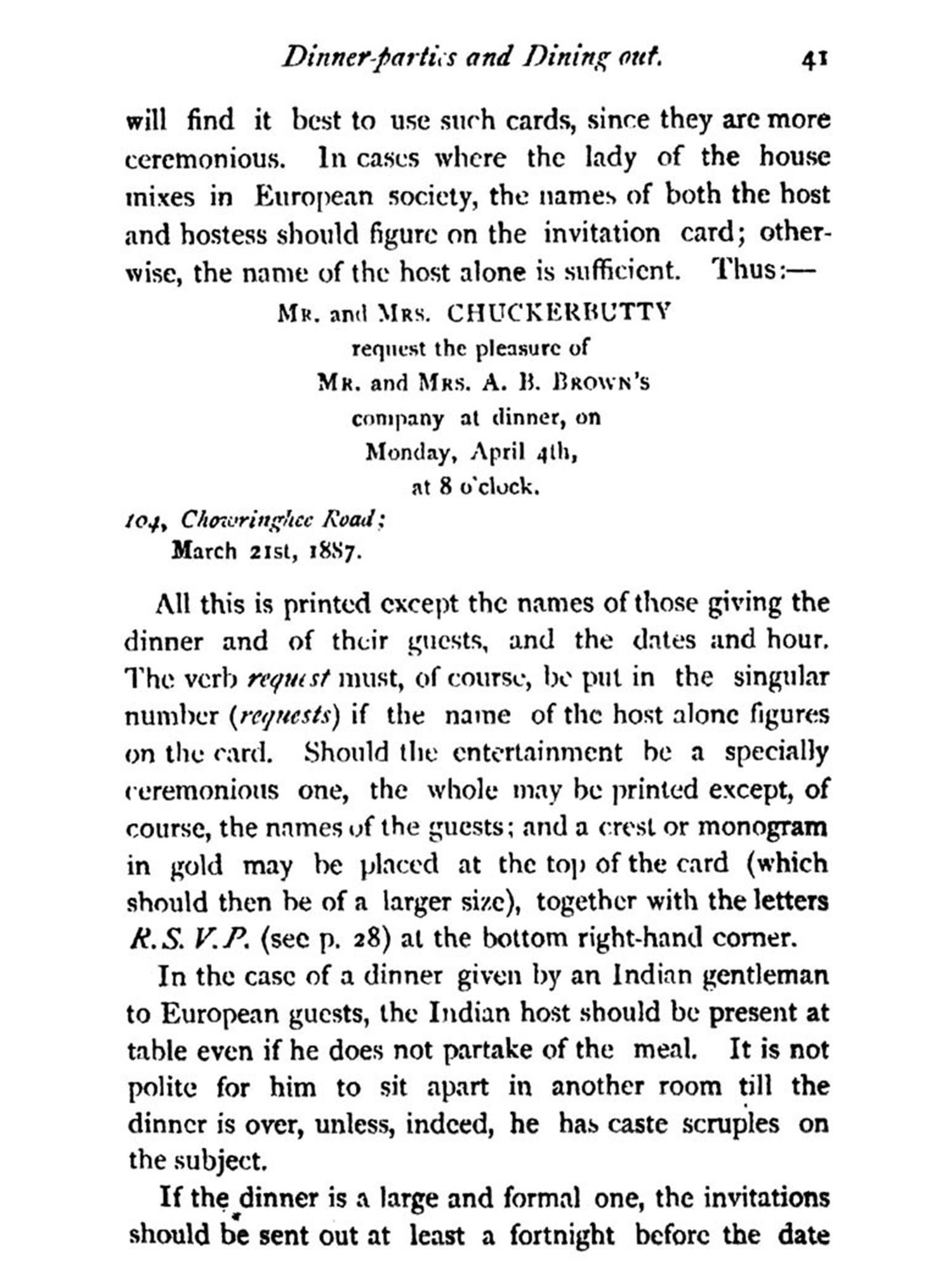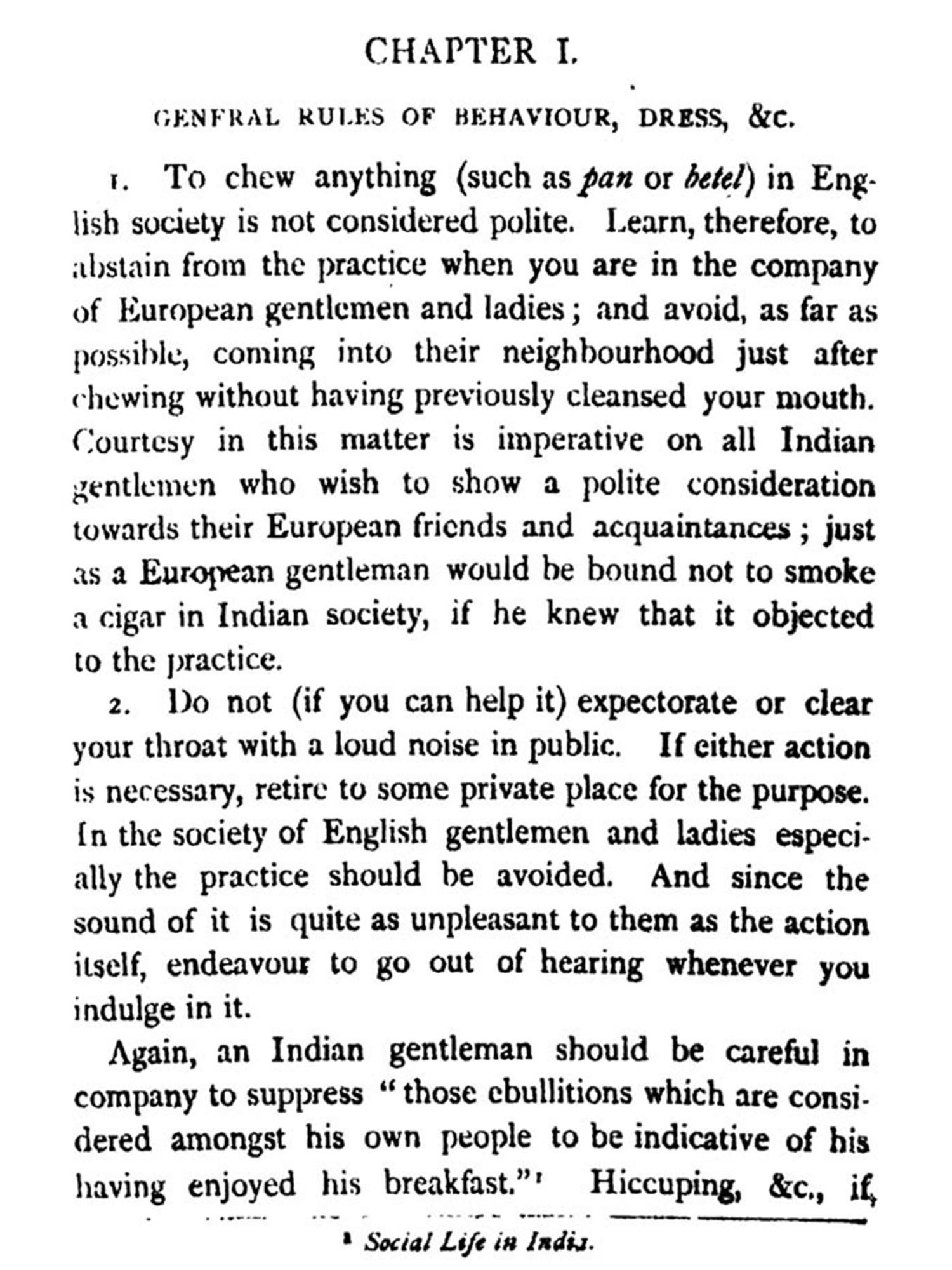 To the Indian gentleman, particularly, who desires to inix in English society, a knowledge of the rules of English etiquette is important, because in its details the etiquette of one community often differs widely from that of another; and it is quite possible that tastes and habits that are approved in Indian, may be discountenanced in European, society.