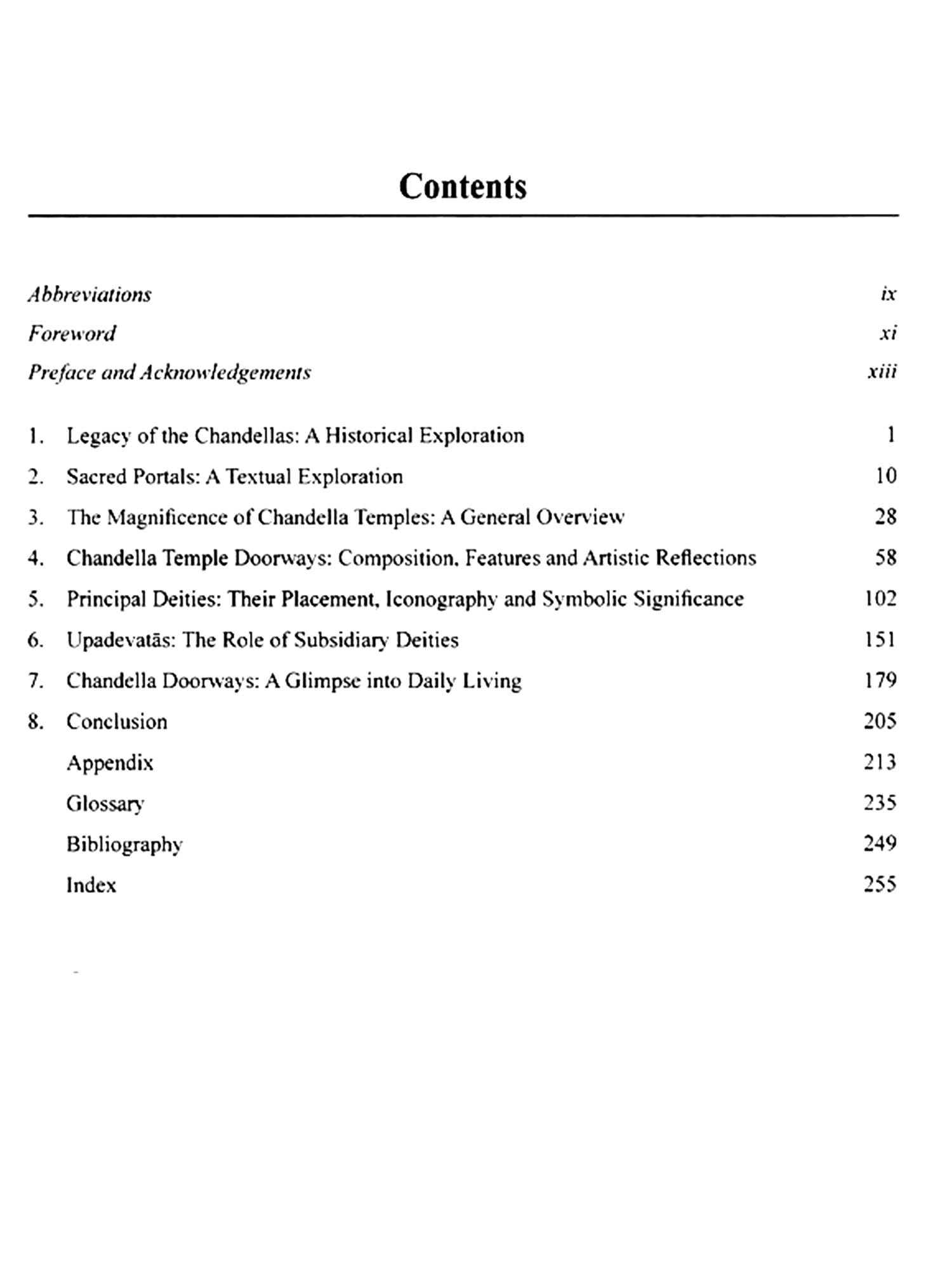 The present research work is a study of sculptures carved on different parts of the doorways, such as the lintel (uttaranga), the door jambs (dv ara-s akh a) and the threshold (udumbara). It is an attempt to throw light on the religious, iconographic, socio-cultural and artistic features and the symbolic significance of figural depictions on different parts of the doorways of the temples built during the period of the Chandella rulers. The period of the Chandellas (9th-12th century C.E.) witnessed the construction of magnificent temples at Khajuraho and Ajayagadh of Madhya Pradesh and Mahoba, Kalanjar, Devagadh, Dudhai, Chandpur, Madanpur and Gairaha of Uttar Pradesh. This study shall cover the temples that have intact doorways that made significant cultural and artistic contributions and the doorway fragments especially lintels which indicate the existence of temples, their dedication and religious significance.