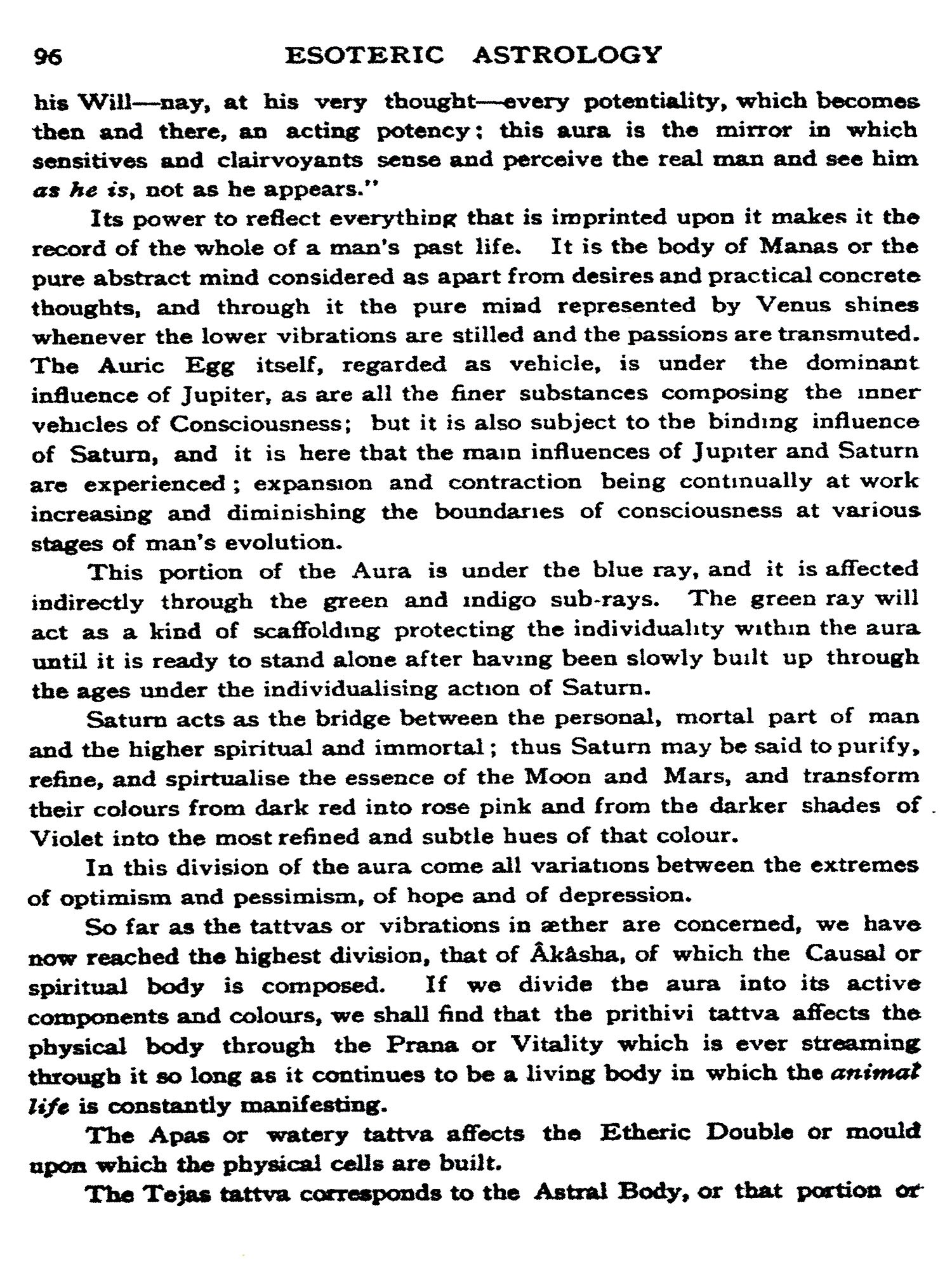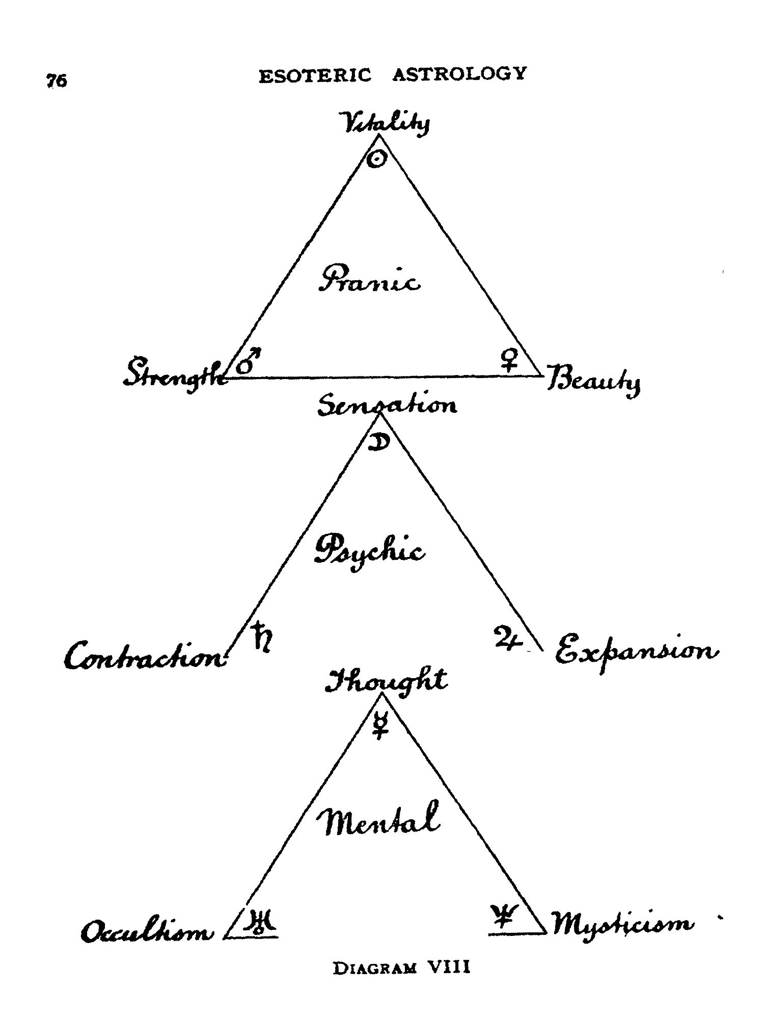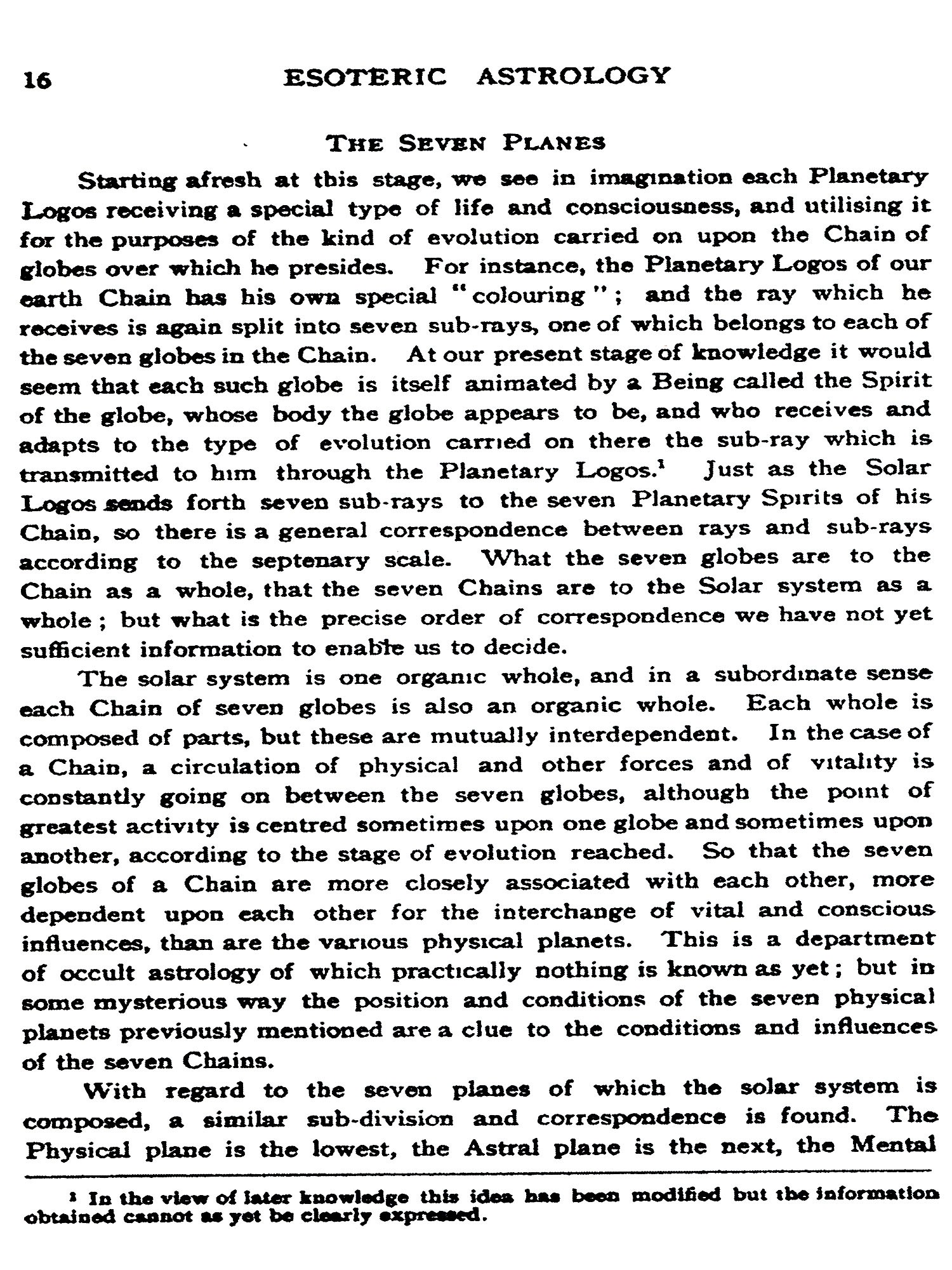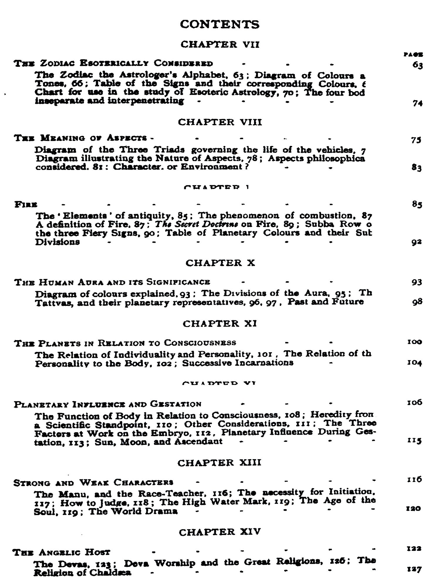 We may define Esoteric Astrology as that side of the subject which views all stellar phenomena from the standpoint of unity; whilst Exoteric Astrology begins its study from the side of diversity and separateness, The Esoteric Astrologer looks upon the whole expression of life as proceeding from one central and primal source, and therefore seeks to understand the subject from the point of view of the One flowing forth into the many. In the solar system the Sun is the centre of all and the starting point of his philosophy, for to him all things come forth from the Sun; and it is the solar life in which all things live and move and have their being. Coming forth from this centre are the life currents which pass through the material organisms of every living thing on earth. This life descends and ascends, through each of the seven planets, and is transformed in the process for the use of evolving entities, and adapted to the stage they have reached in the scale of evolution; the seven planets being either directly or indirectly connected with the seven principal substances in the human body.