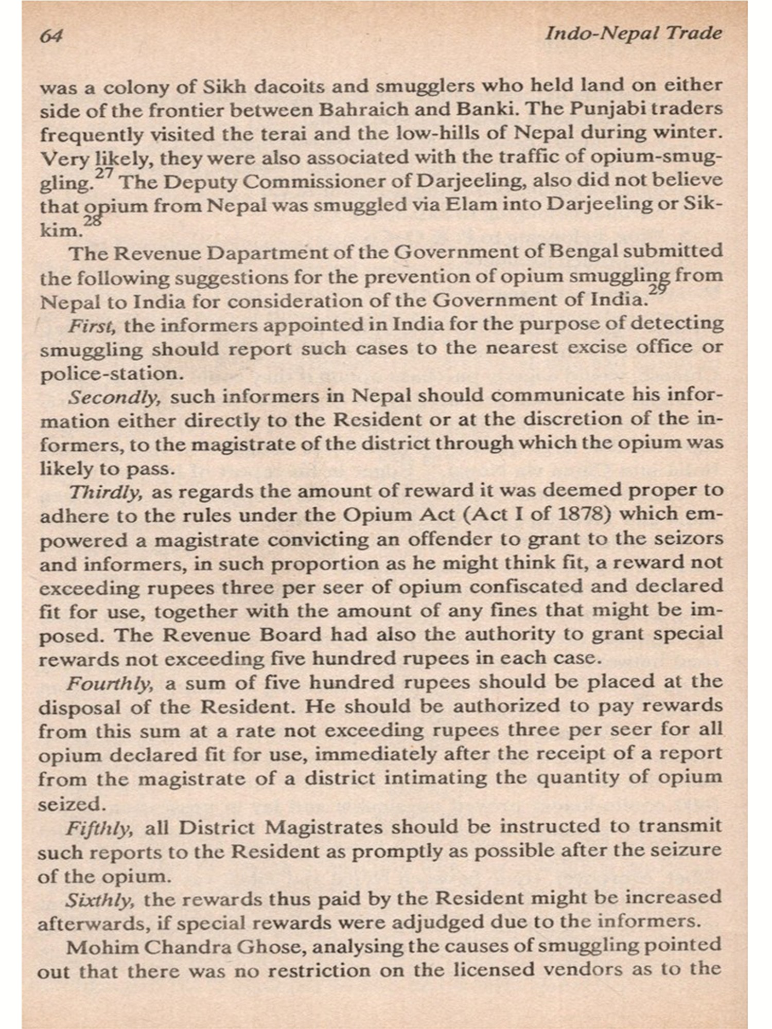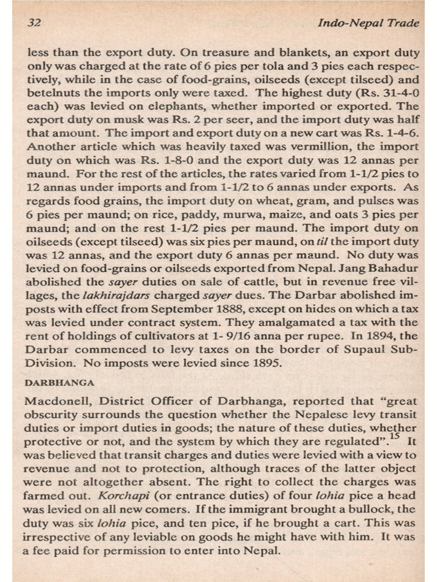 I am indebted to late Professor Narendra Krishna Sinha, who had urged me to explore the various aspects of Indo-Nepal trade at the grass root level. Carlo Valdettaro, an Italian scholar well versed in Nepalese numismatics, reminded me of the outstanding value of trade routes. Mr. Madhav R. Bhandari, formerly Consul-General, Royal Nepalese Consulate General in Calcutta, graciously expressed that my studies should "unveil the firm historical foundation in which the totality of relations between Nepal and India is deeply rooted." Mr. M.K. Bhattarai, now First Secretary, Royal Nepalese Embassy, New Delhi, always takes helpful, benign and encouraging interest in my research works. I am grateful to all of them.