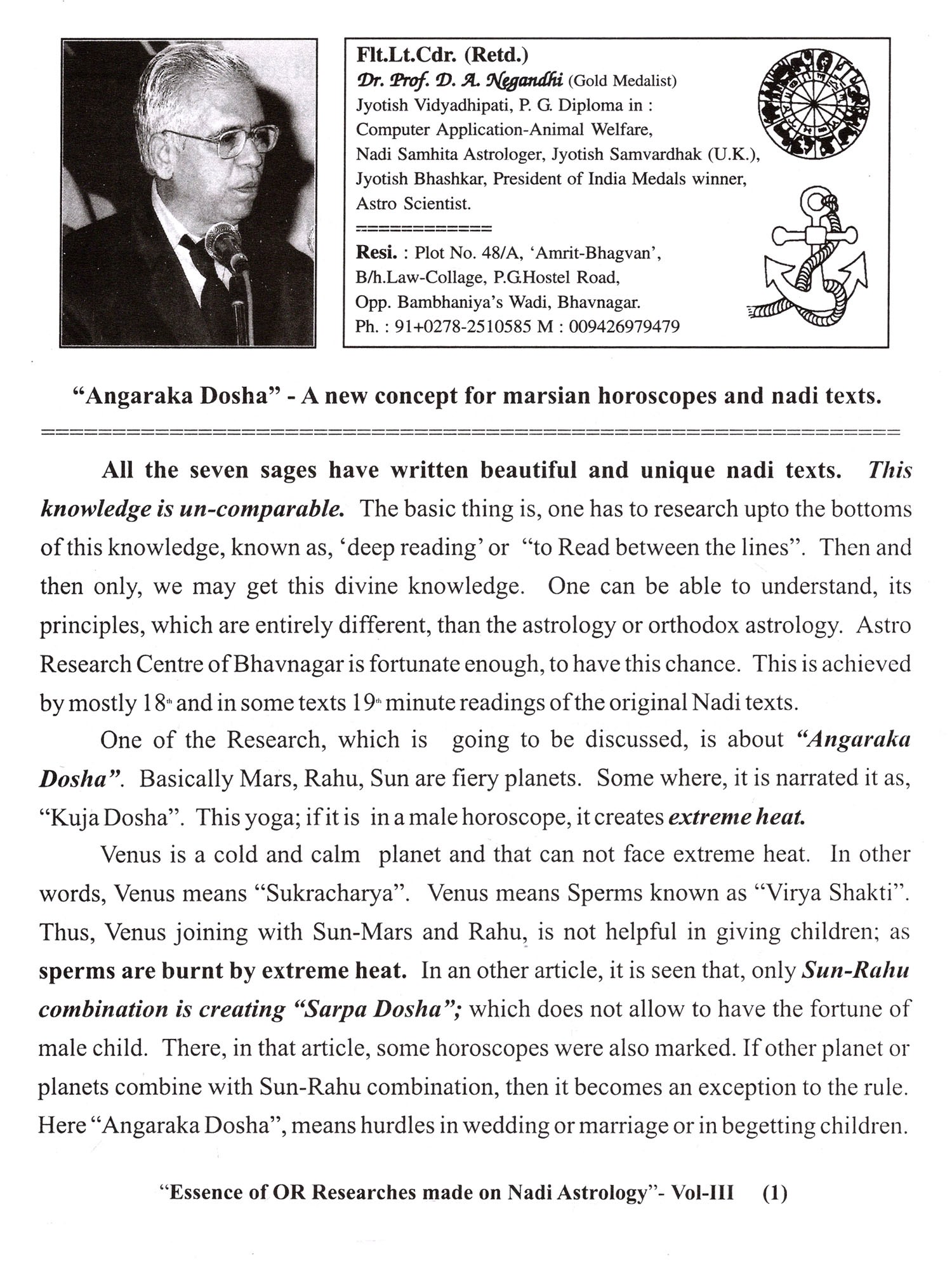 The growing interest in Jyotisha, the world over has led to extensive literature, appearing on the subject, covering basically parasari astrology. However, there is a branch of jyotisha, not as known or predicted but nevertheless, quite convincing in the delineation of horoscopes; that is also catching the imagination of the avid astrology enthusiast. This branch, Nadi astrology, has a different approach in that. It does not take into account the Ascendant, the pivotal factor in parasari Jyotosha, but revolves round the progressions of the planets, primarily the major planets, with reference to the planetary positions at birth. Dr. D. A. Negandhi, with years of experience in this branch, shares his insights in it, through this volume. Dr. Negandhi's efforts, come as a boon taking the reader, through the nuances of Nadi astrology at a time, when there are many misconceptions on this subject. The examples and illustrations drawn from his case studies, help in driving home, some of the more difficult points.