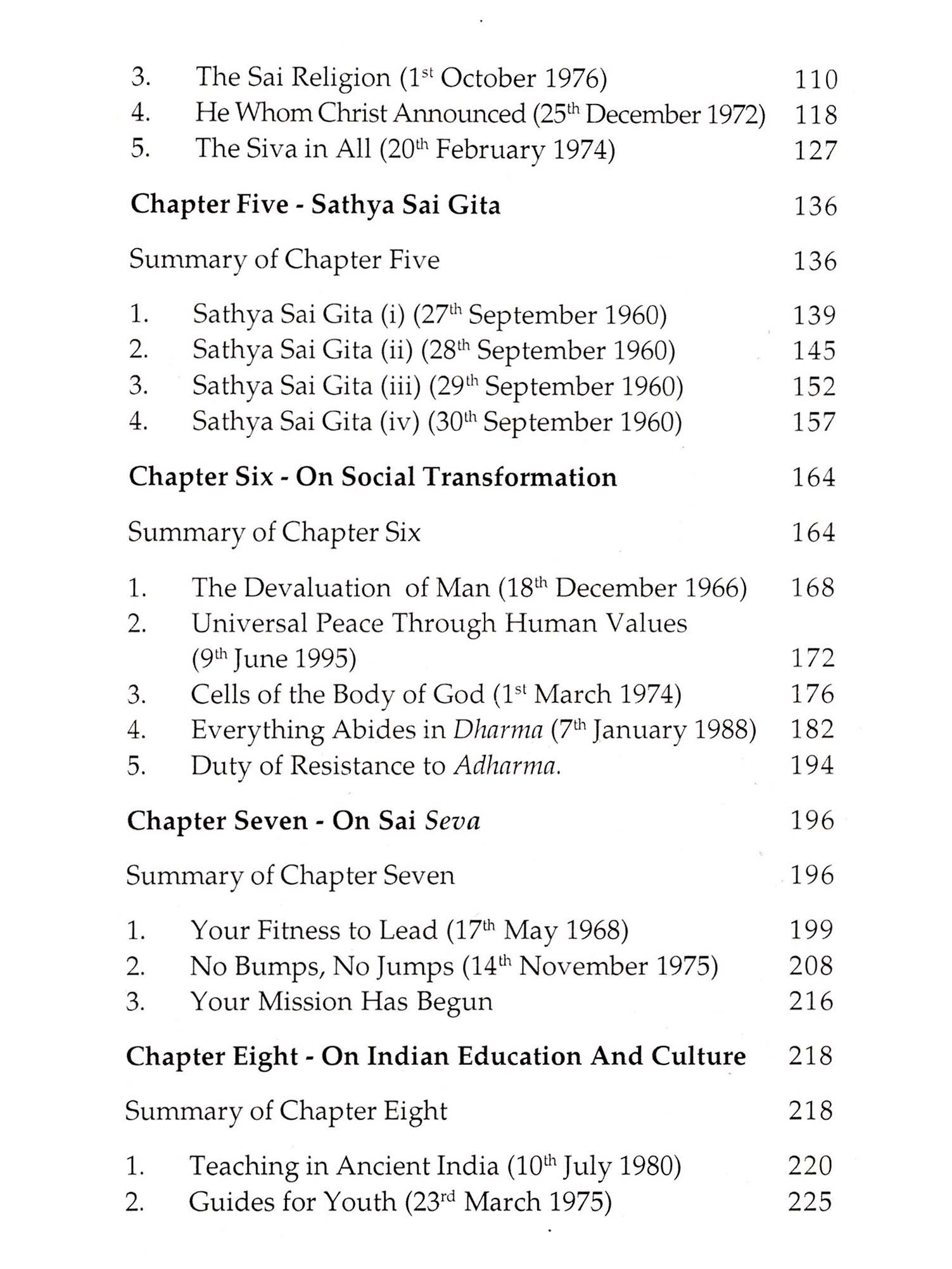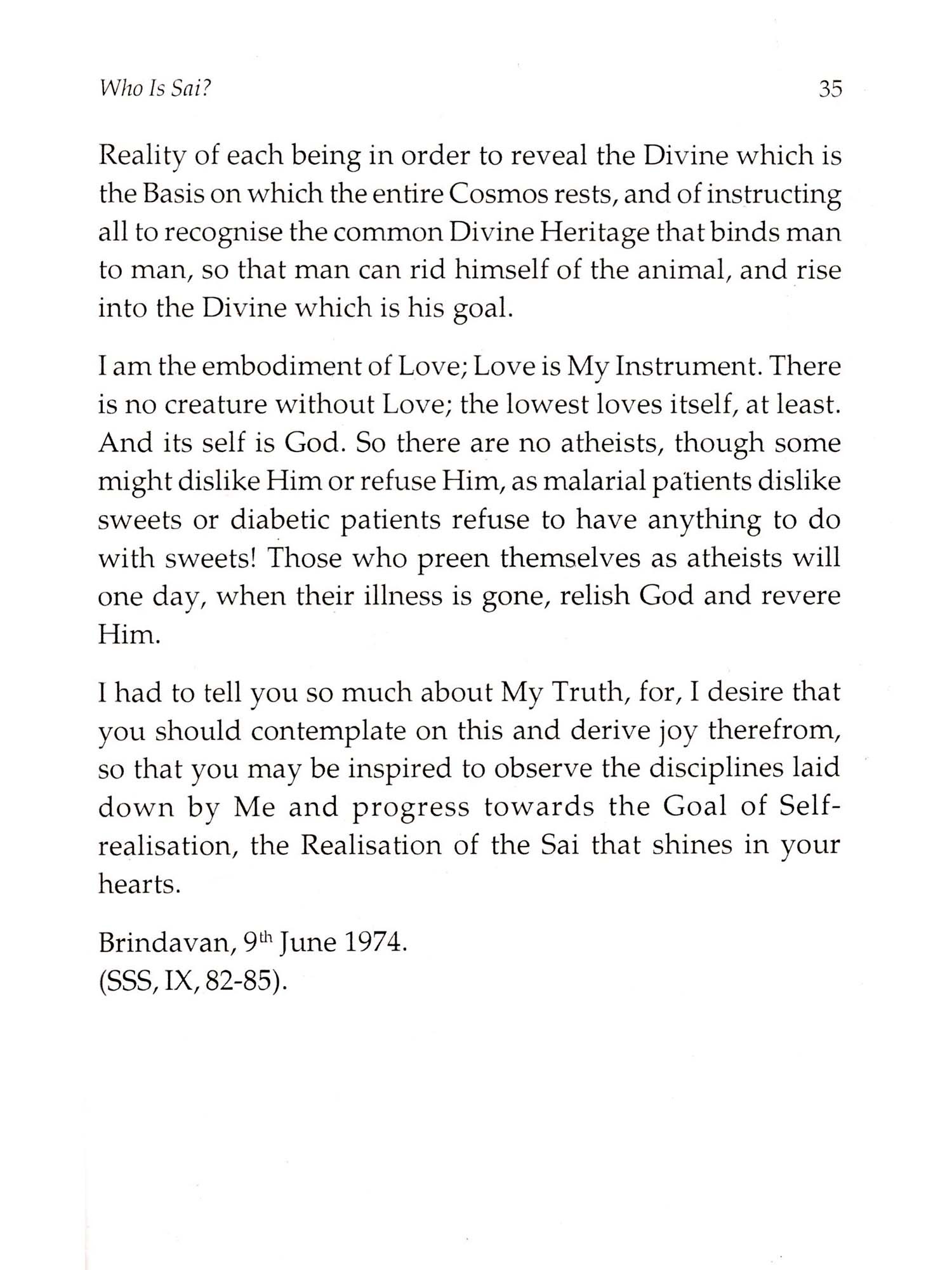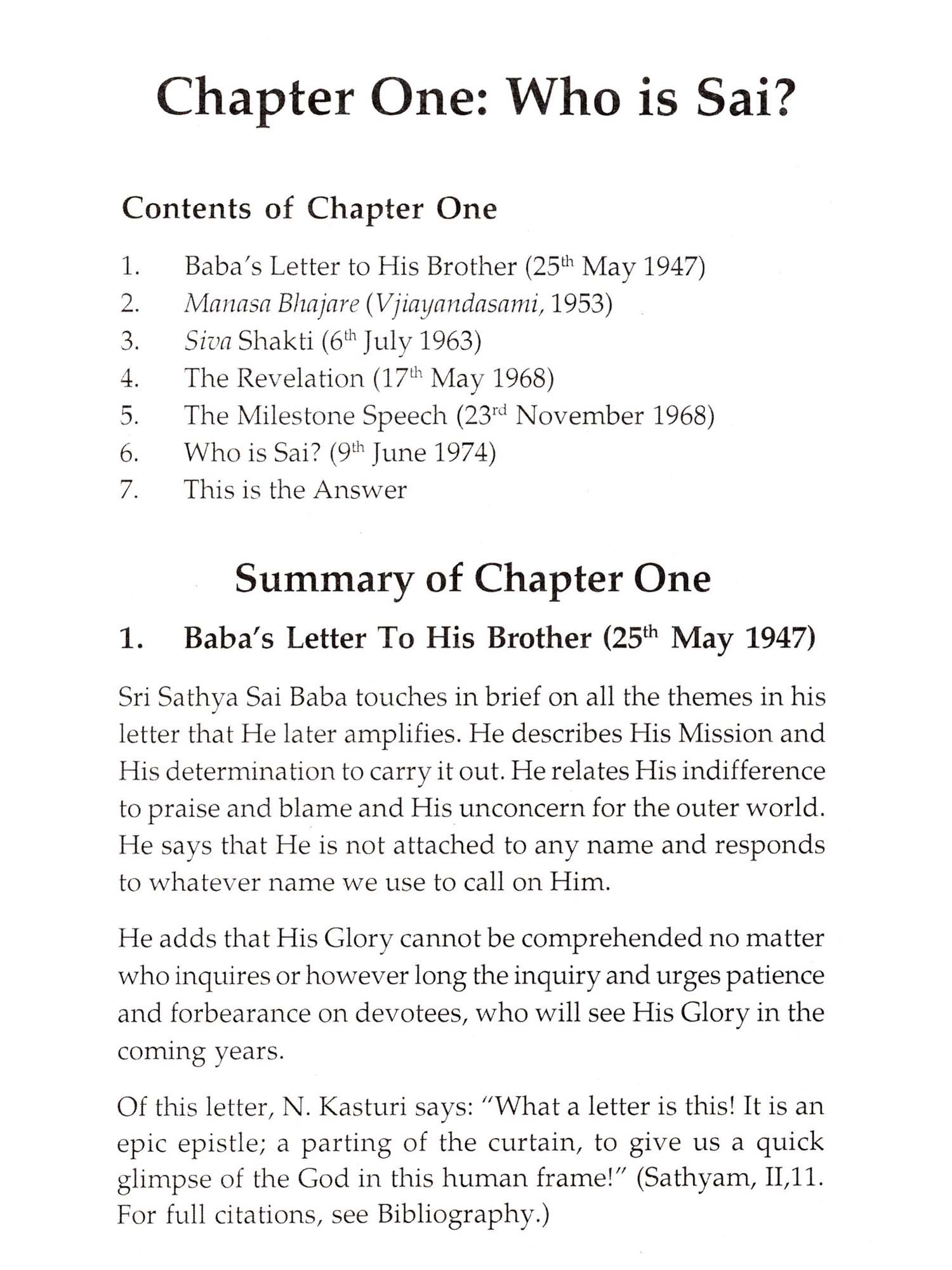 The book you hold in your hands is not an ordinary book. It may be unlike any you have ever read. Its author, Sri Sathya Sai Baba, is unlike anyone you may ever meet or hear about. In Sanskrit, the word for such a one as Sai Baba is "Purnavatar," which means a full and complete Incarnation of the Lord. The last such appearance of perfect Divinity among us is said to have been Lord Krishna. Here is how Sai Baba describes Himself: I am lever] new and ever ancient. I come always for the restoration of Dharma (righteousness), for tending the virtuous and ensuring them conditions congenial to progress, and for educating the 'blind' who miss the way and wander into the wilderness. (SSBEL, 64. For full citations, see Bibliography.) The present Avatar has come invested with the totality of cosmic power. (SM, 236) I am the Divinity that is your Reality. (SSS, X, 133.) I am all deities in one. (Sathyam, III, 282.) This Form... is all Forms of all Gods. (SSS, VI, 212.) This is a Human Form in which every Divine Entity, every Divine Principle, that is to say, all the Names and Forms ascribed by man to God, are manifest. I am everything, everywhere, omniscient, omnipotent, and omnipresent. (SM, 243.) (SSS,VI,211.) Sai Baba speaks quite freely of His identity and His Mission, as you will see in these pages. He says that He has come down (an Avatar - a "descent" of God) to raise human consciousness above the warring, raping, pillaging, destructive and downward spiral that humanity has brought itself to. He has come to turn it back from its worship of self and pleasure, technology and ease, money and comfort. Sai Baba offers this metaphor to explain the reasons for His Presence: When there is a small disturbance, a police constable is enough to put it down; when the trouble is threatening to develop into sizable proportions, a police inspector is sent; when it grows into a riot, the superintendent of police himself has to quell it, but when, as now, all mankind is threatened with moral ruin, the inspector general comes down, that is, the Lord comes down with His army of saintly men and seekers. (LBSSSB, 213) Sri Sathya Sai Baba has come down to see that Earth does not erupt into thermonuclear conflagration and to raise the consciousness of humanity until a Golden Age is inaugurated for all the inhabitants of the planet. He says: 1 am acting a role now in this human form. The Function-less and the Role-less has come, taking on a Function and assuming a Role. (Sathyam, II, 39). (I have) to deal with (a) crisis which is world-wide and world-shaking.... Immorality has put on the garb of morality and is enticing man into the morass of sin. Truth is condemned as a trap: justice is jeered at; saints are tortured as social enemies. Hence this Incarnation has come, to uphold the True and suppress the False. (SSS, VI, 265.) The Mahapurushas Igreat beingsl, the Mahatmas [great souls), the Inanis [sages], the Yogis [enlightened ones)...