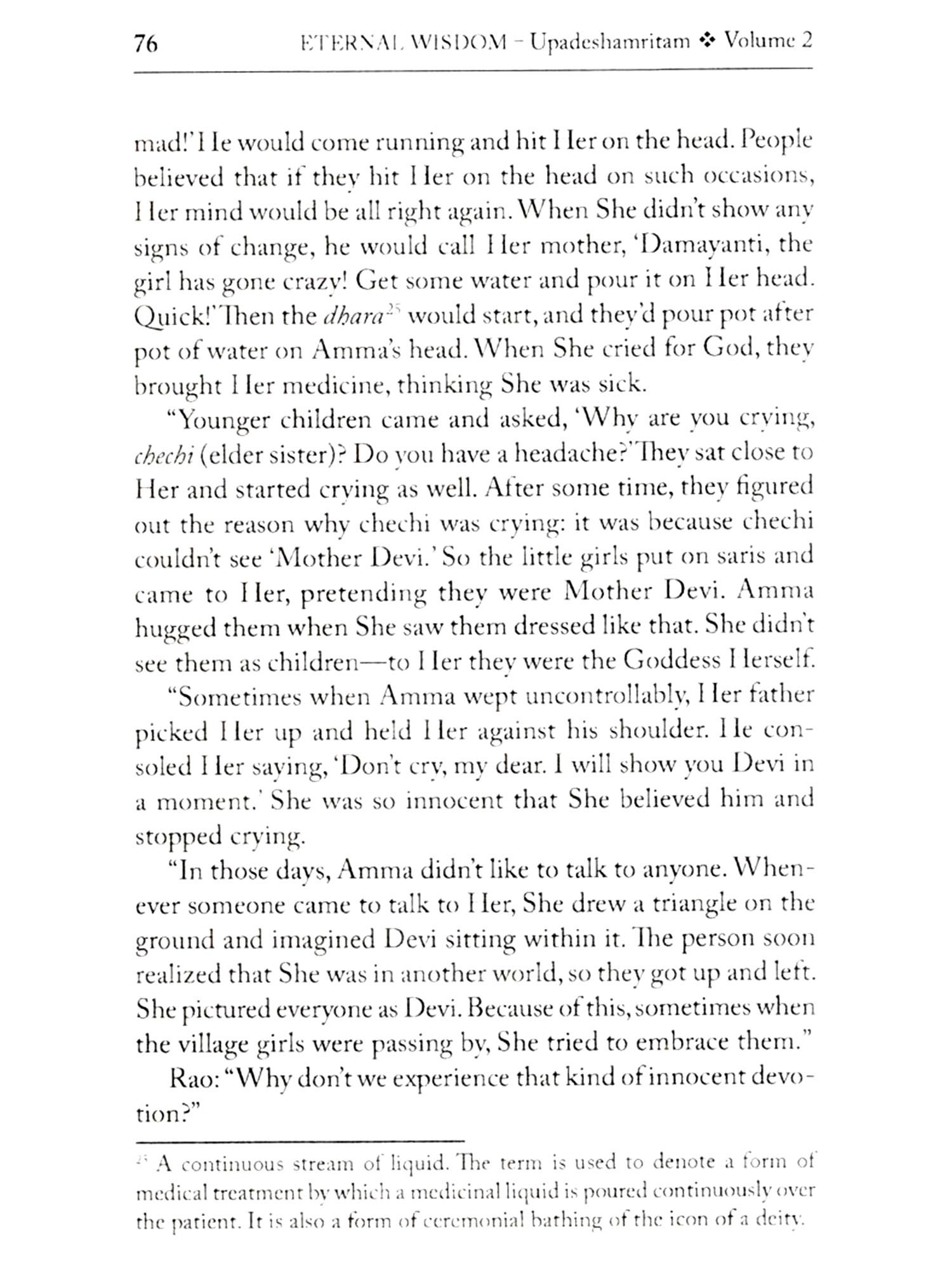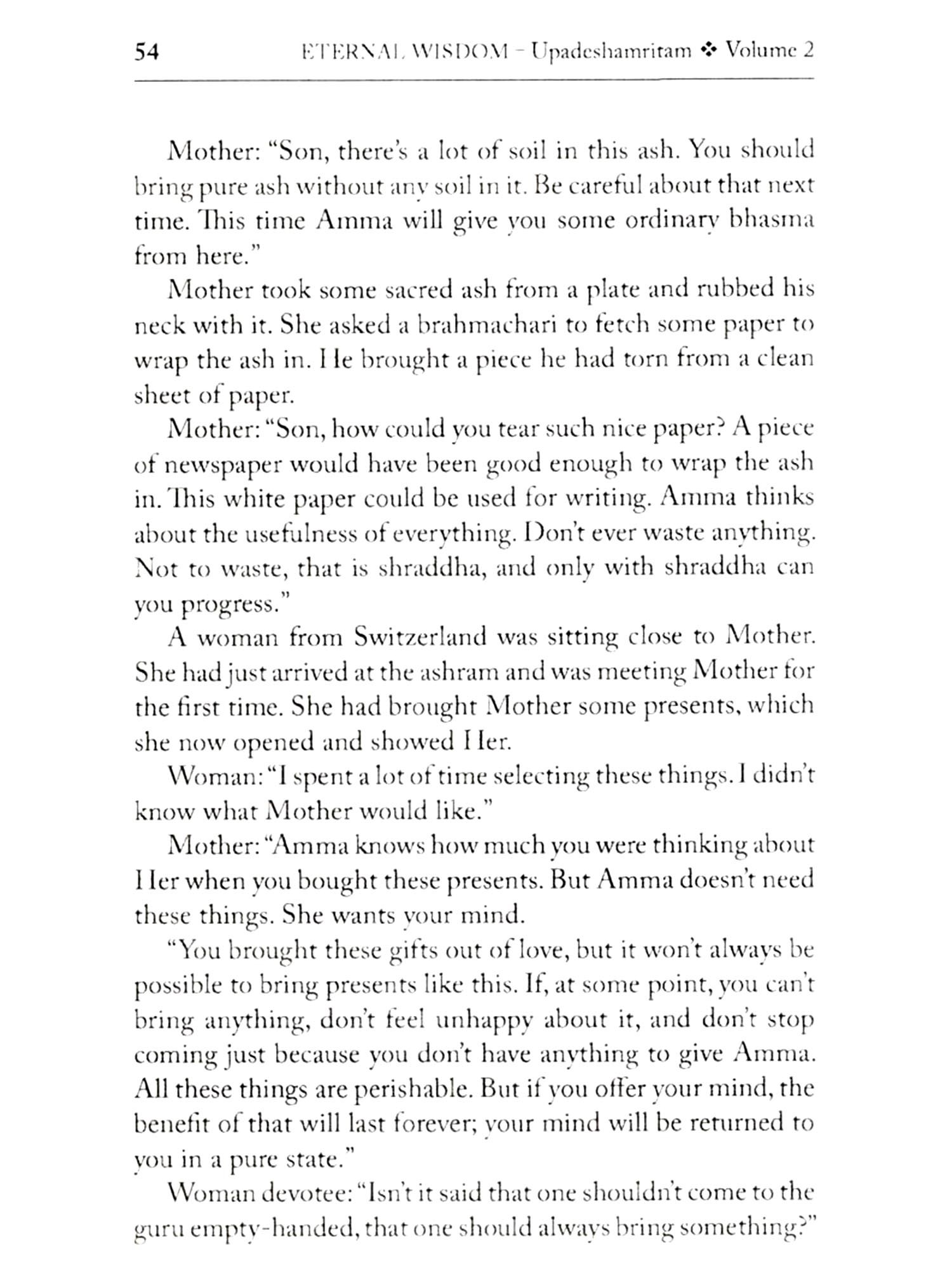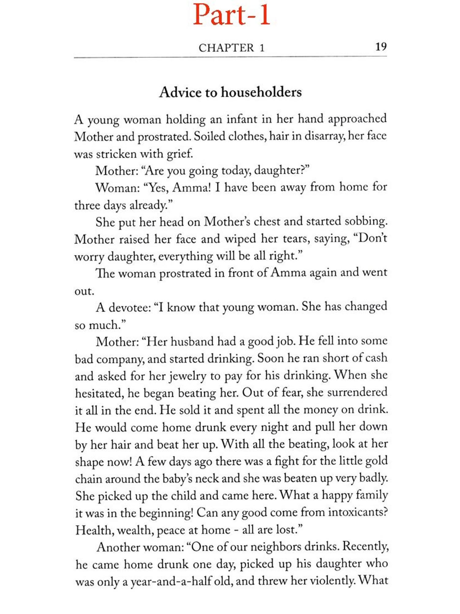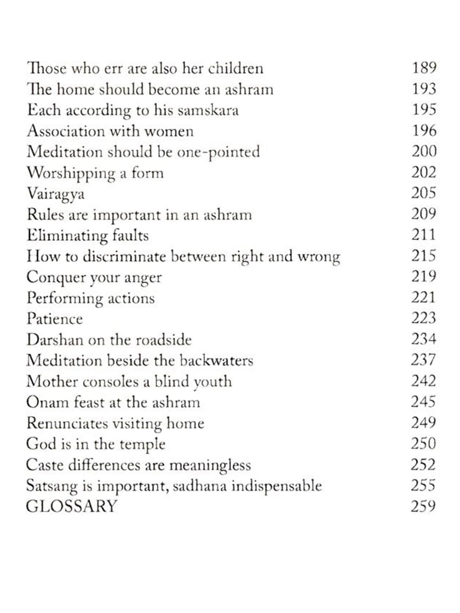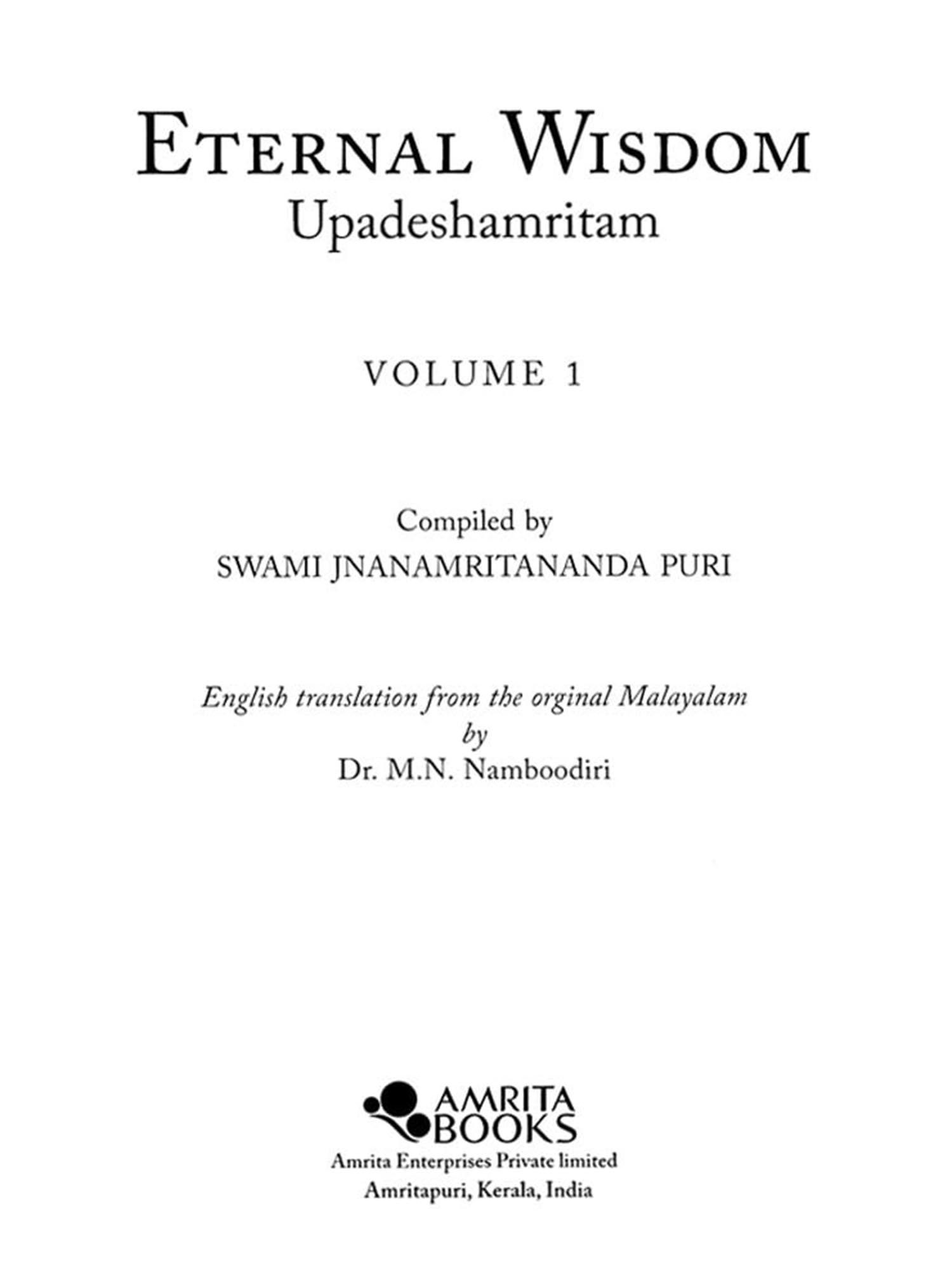 Rare indeed are the mahatmas (great souls) endowed with the vision of seeing the entire universe within the Atman (Self), and the Atman within the universe. Even if they are recognized, they may not be inclined to communicate with us or counsel us, immersed as they are in the eternal silence of the Self. Therefore, it is our great fortune when a fully realized mahatma is ready to advise and discipline us with the tender love of a mother, and the inexplicable compassion of a guru. Throughout the world today, the darshan and the nectarous words of Sri Mata Amritanandamayi Devi are effecting transformations in the lives of hundreds of thousands of people. This book, though incomplete, is a precious collection of conversations between the Holy Mother and Her disciples, devotees, and inquiring visitors during the period from June 1985 to September 1986.