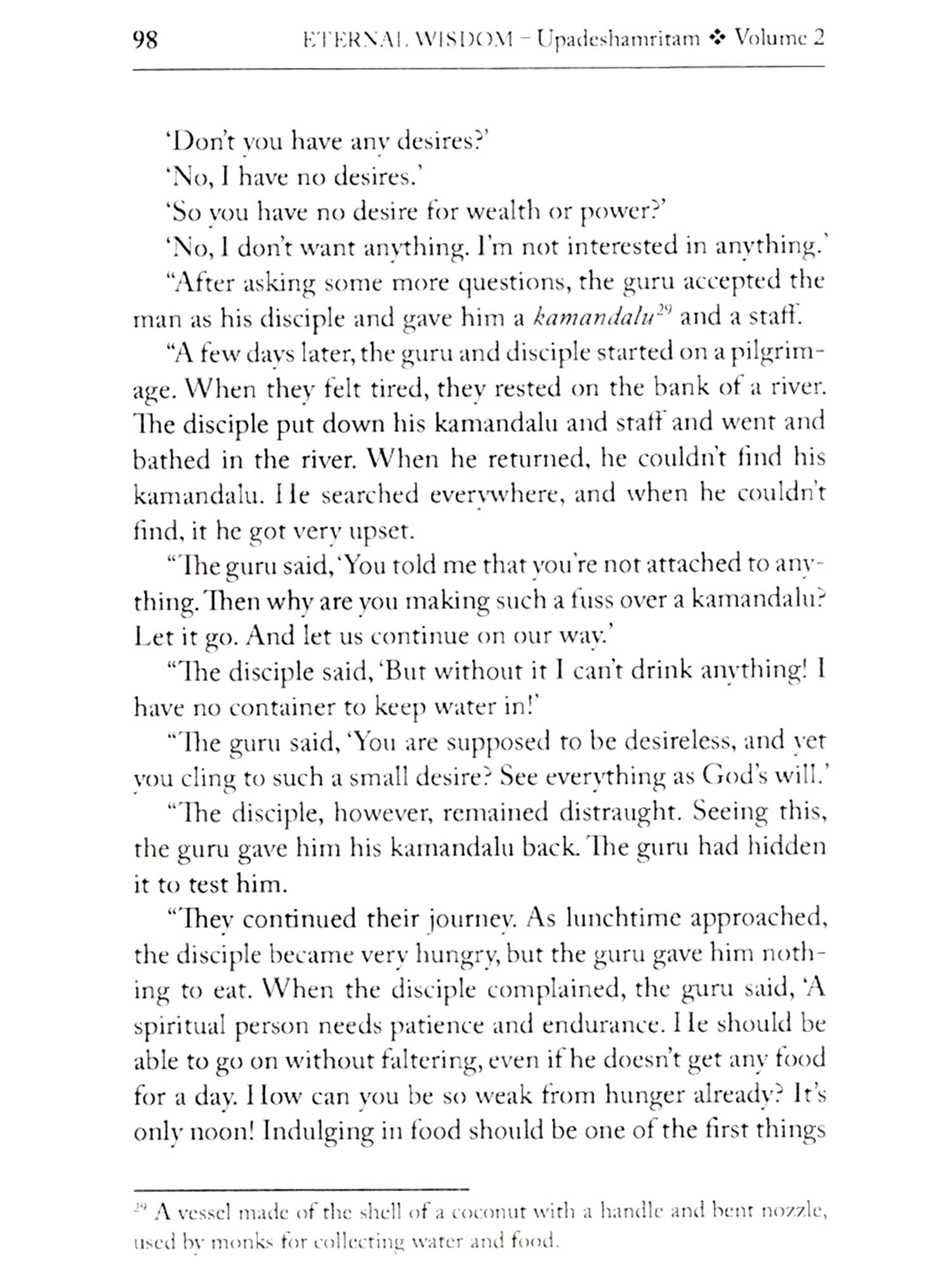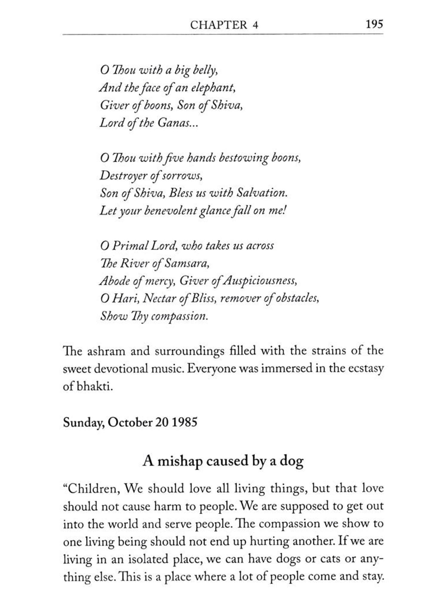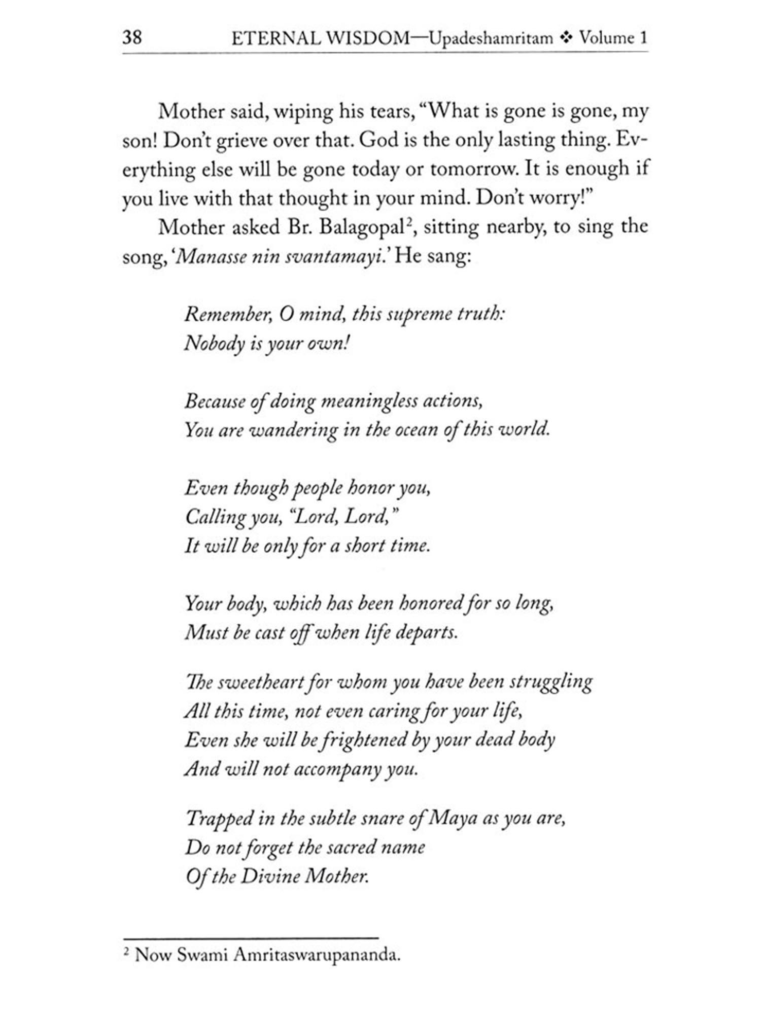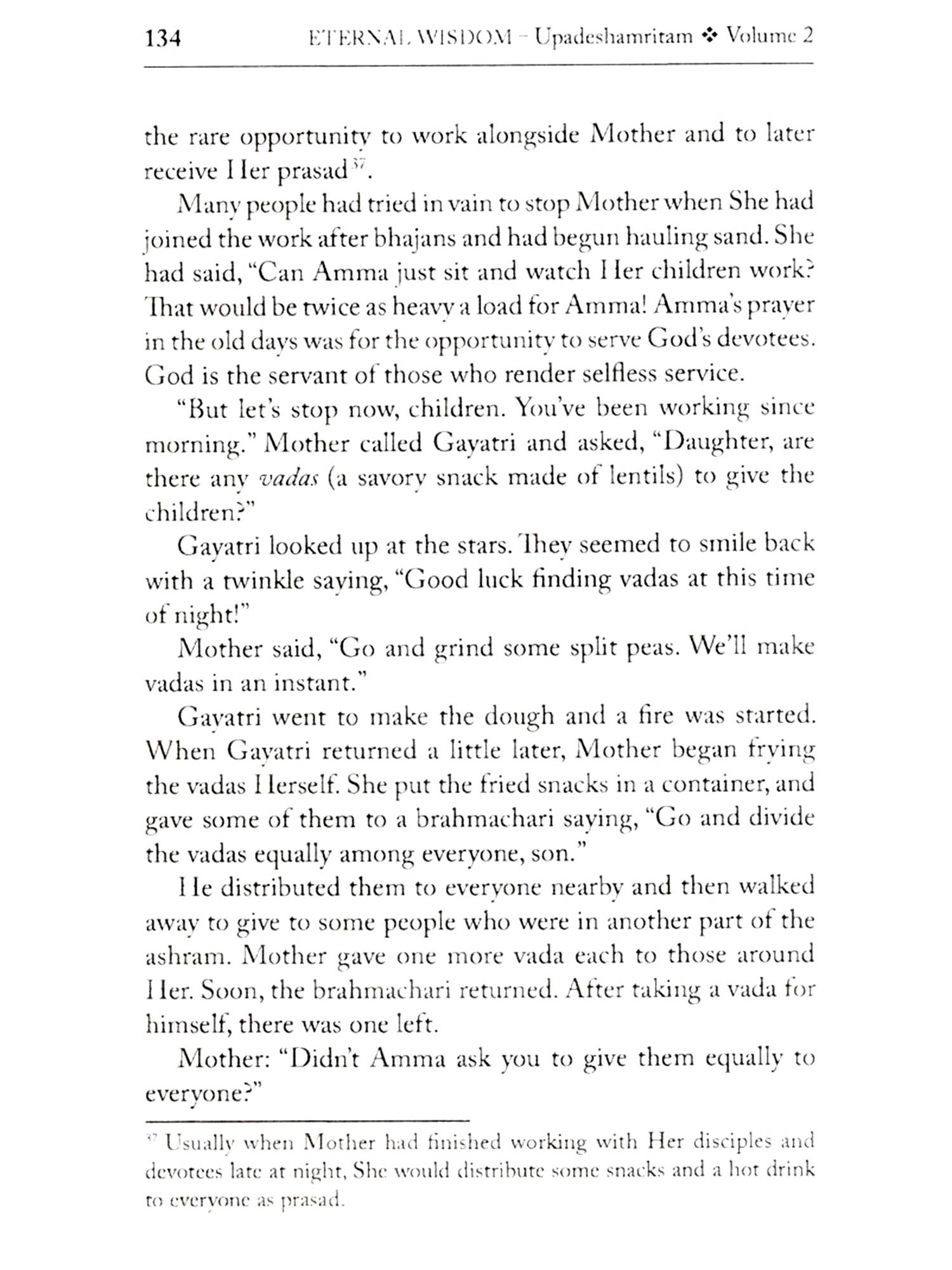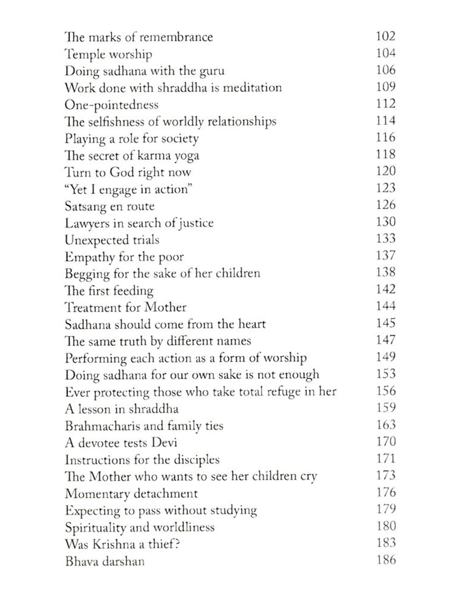 Rare indeed are the mahatmas (great souls) endowed with the vision of seeing the entire universe within the Atman (Self), and the Atman within the universe. Even if they are recognized, they may not be inclined to communicate with us or counsel us, immersed as they are in the eternal silence of the Self. Therefore, it is our great fortune when a fully realized mahatma is ready to advise and discipline us with the tender love of a mother, and the inexplicable compassion of a guru. Throughout the world today, the darshan and the nectarous words of Sri Mata Amritanandamayi Devi are effecting transformations in the lives of hundreds of thousands of people. This book, though incomplete, is a precious collection of conversations between the Holy Mother and Her disciples, devotees, and inquiring visitors during the period from June 1985 to September 1986.