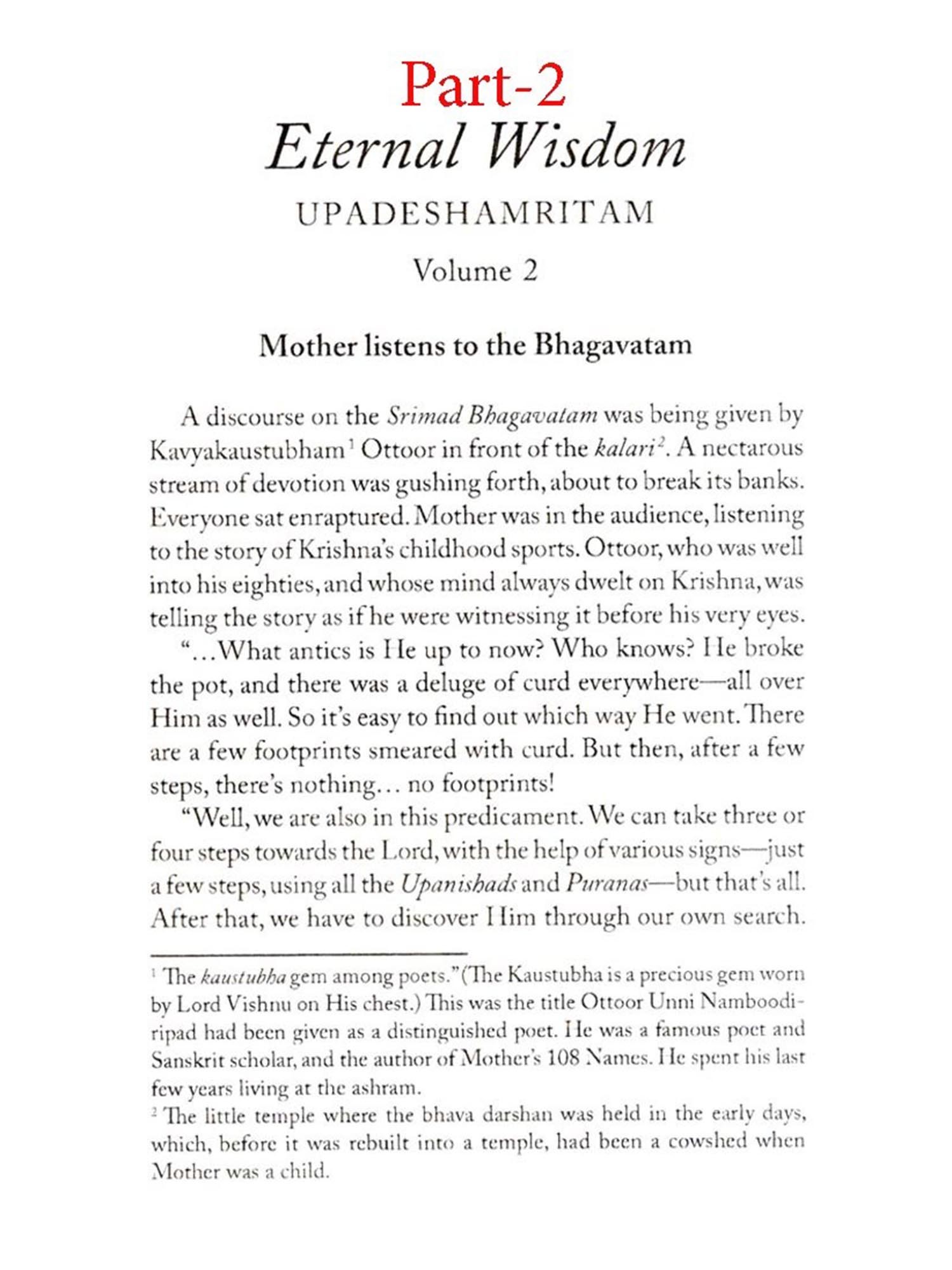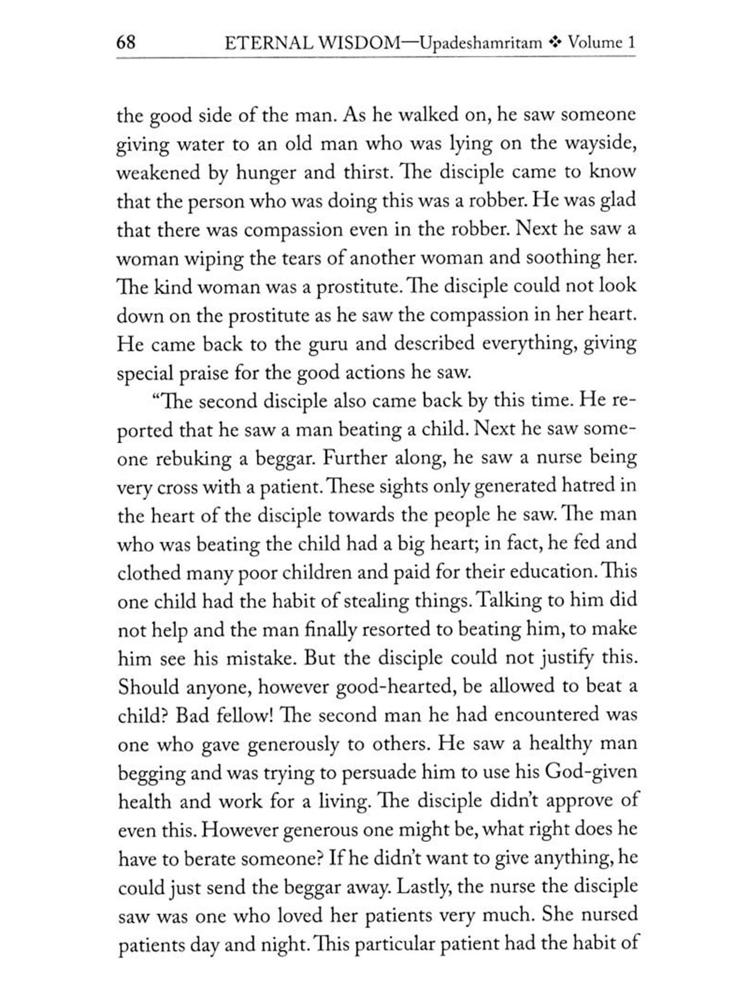 Selfless love of God gives way to a form of devotion that is driven entirely by desires. Man gives undue importance to an intellect that seeks the yield of immediate profit, while discarding the lasting glory promised by true wisdom. Lofty spiritual principles and noble experiences do not shine in the lives of the people, but are confined to mere words. It is at such a juncture that Mother speaks to us in a language of untainted devotion, a language of the heart, of wisdom, and of the love that is Her entire life. Her ambrosial words have both an im-mediate and eternal relevance.