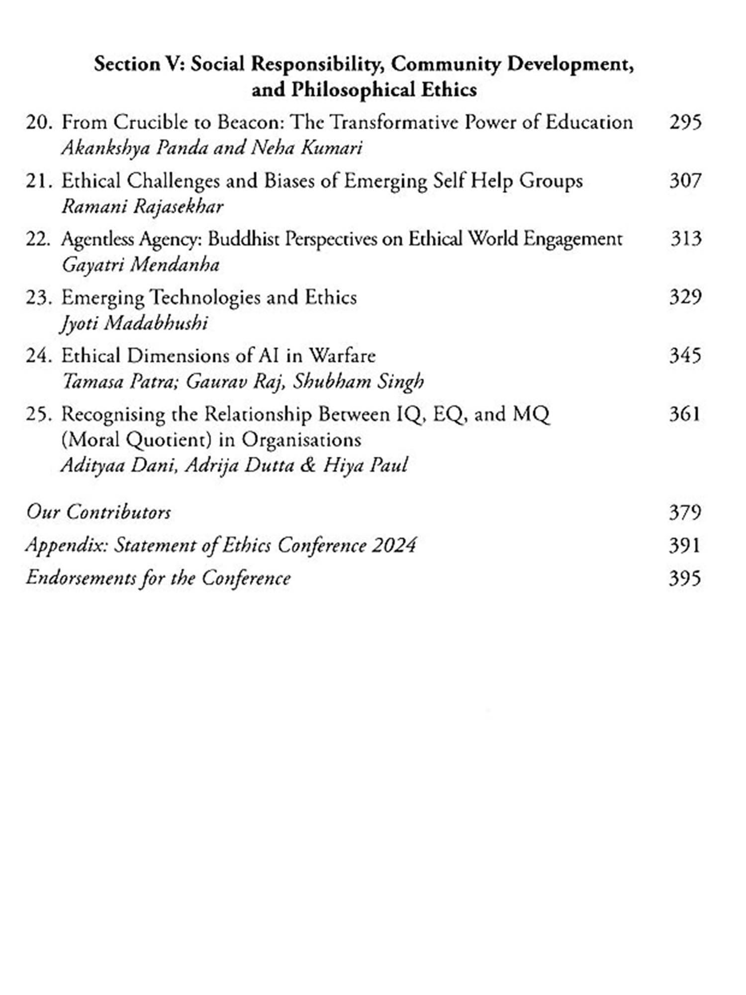 Drawing inspiration from industry pioneers like J.R.D. Tata and Ratan Tata, the volume emphasizes the importance of ethics in business. J.R.D. Tata once remarked, ""I do not want India to be an economic superpower. I want India to be a happy country, ""reflecting his belief that economic success must be accompanied by ethical conduct and social responsibility. Similarly, Ratan Tata highlighted the importance of integrity in leadership, stating. ""If you want to walk fast, walk alone. But if you want to walk far, walk together. ""These quotes underscore the Tata legacy of ethical business practices, serving as guiding principles for the discussions presented in this volume.