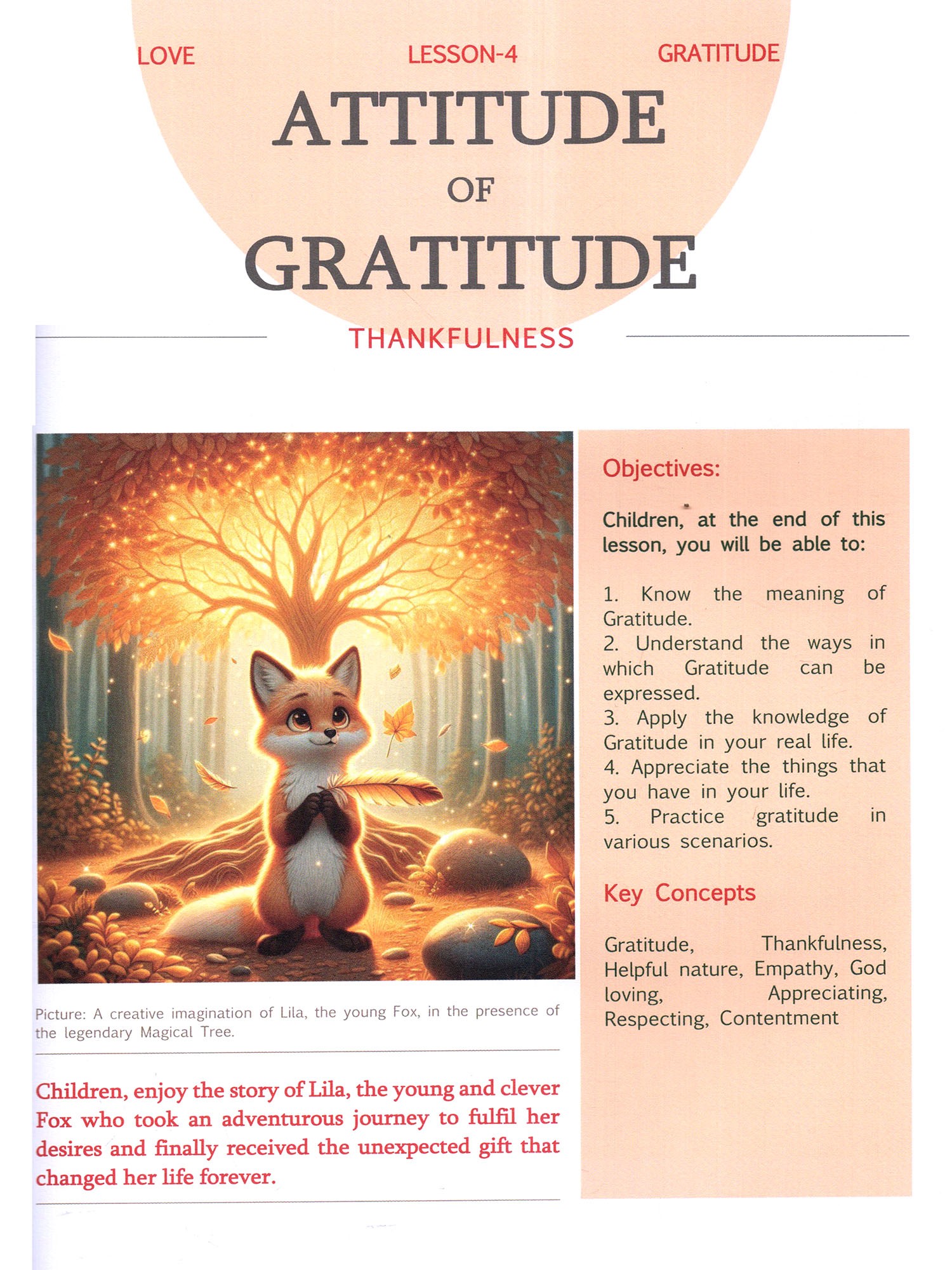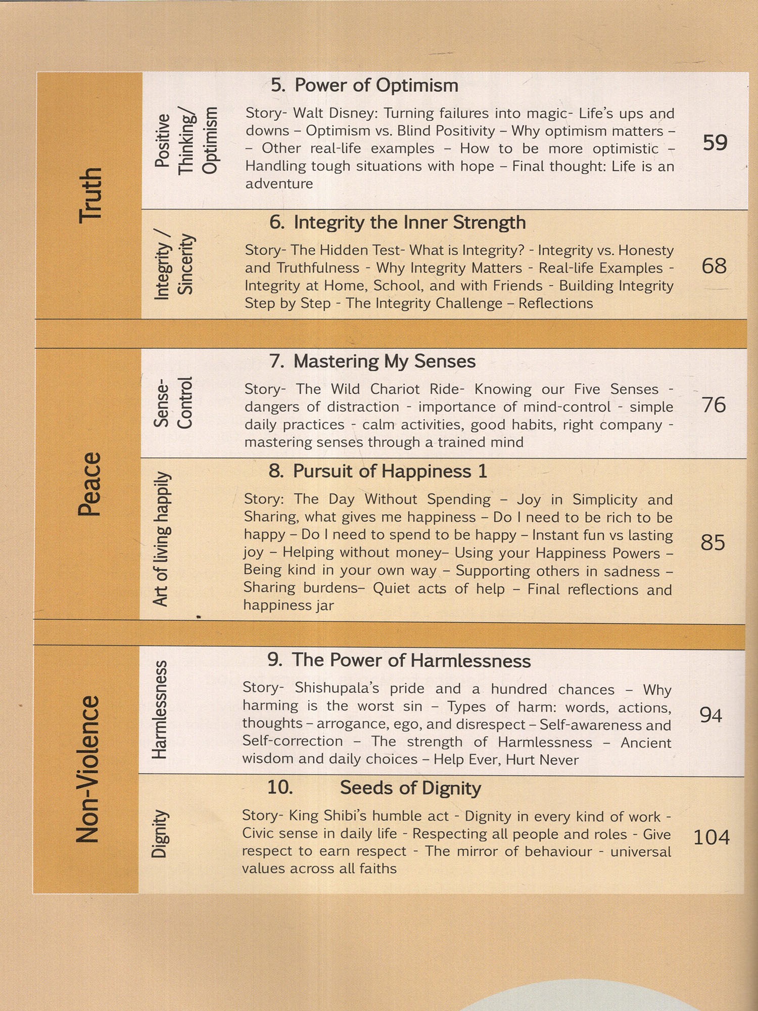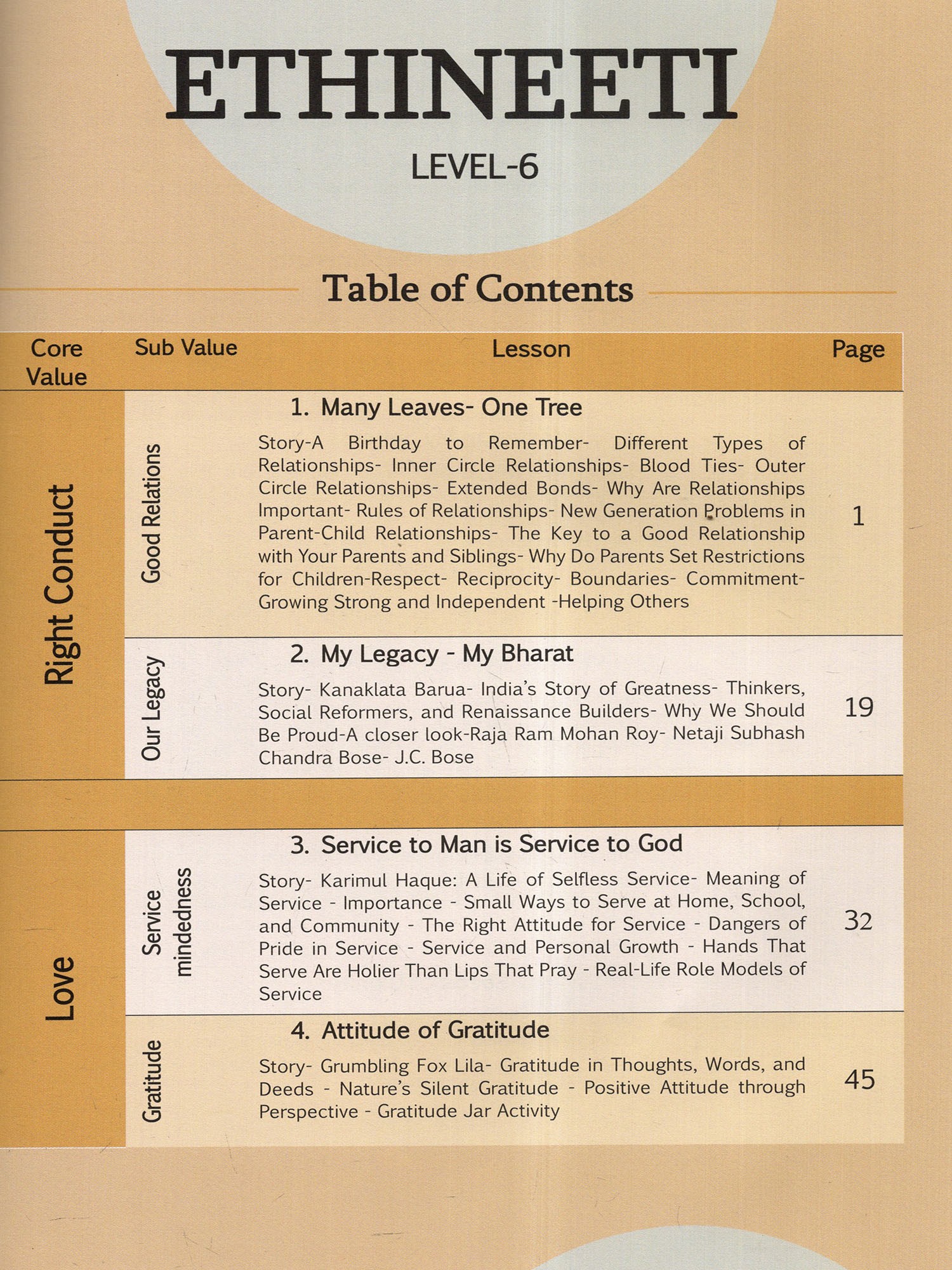 Level 6: Designed to deepen emotional intelligence, Service Mindedness, Gratitude, Optimism, Sense-control, Dignity, Happy Living, Harmlessness in pre-teens.