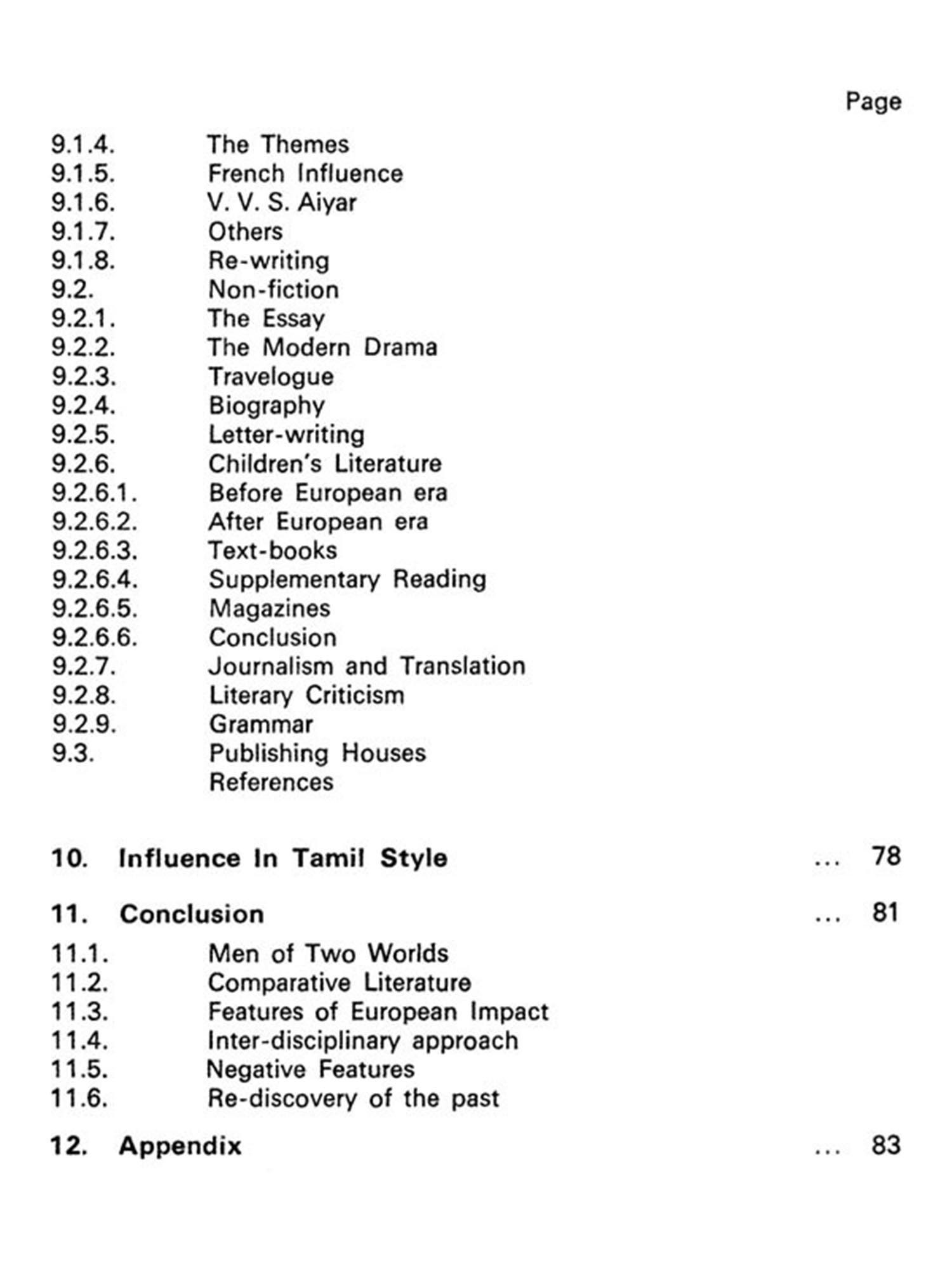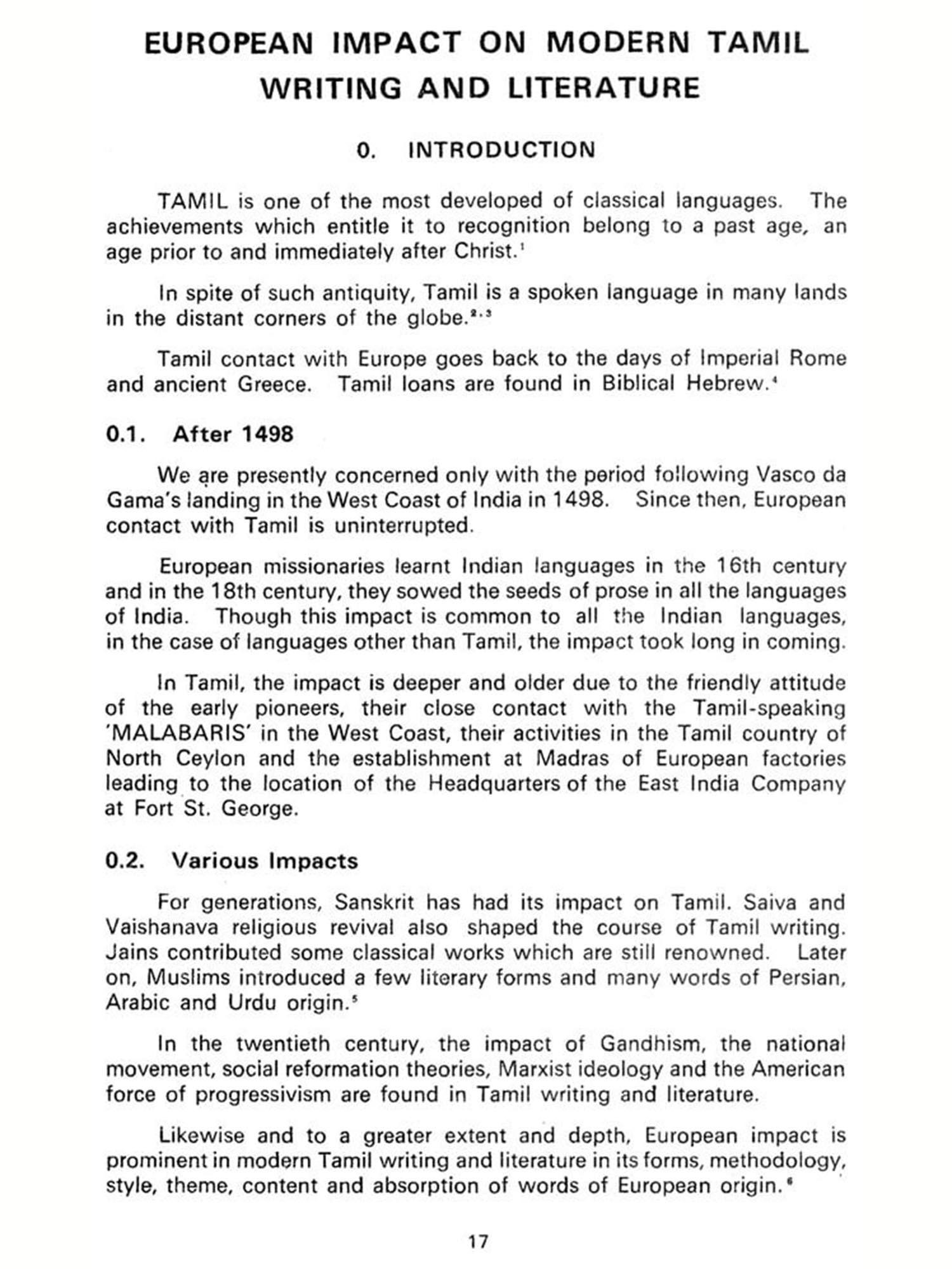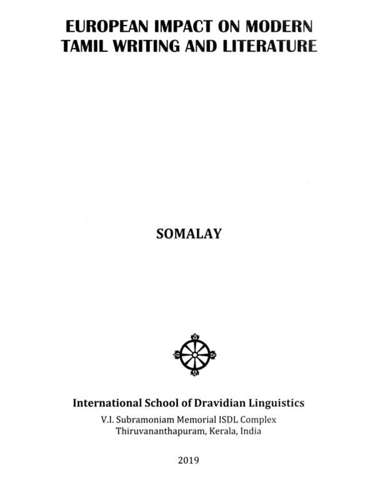 Dravidian Linguistic Association of India published Thiru Somalay's survey paper entitled 'European Impact on Modern Tamil Writing and Literature' in 1976. As it is found out of stock, the International School of Dravidian Linguistics took the initiative to reprint it by utilizing the grant received from the Director, Department of Tamil Development. Somalay's book is an outcome of papers presented in the Third International Conference - Seminar of Tamil studies held at Paris in 1972. These papers covers a wide-ranging area like Script, Printing, Lexicography, Linguistics and Textual Criticism, Tamil Prose before and after the European Advent, Dravidian consciousness, European impact on Modern Tamil Poetry and Modern Tamil Prose writing. The style of narration is quite impressive and fare. He could arrange the datas in a systematic way and present his findings. On the whole Somalay's work underlines the need of a detailed study on European impact on Dravidian Culture language and literature.
