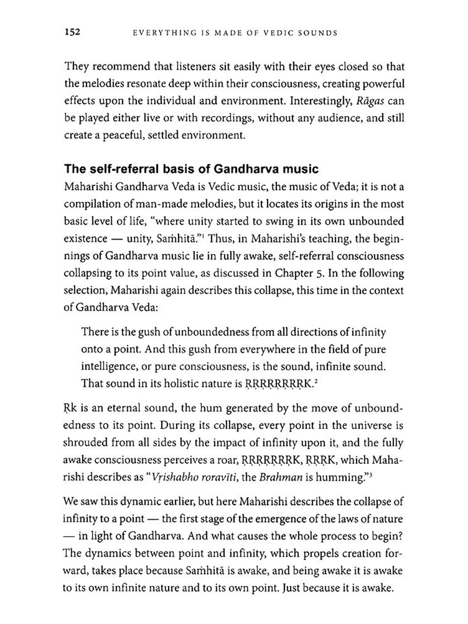 Everything is Made of Vedic Sounds explores how the silent ocean of consciousness, at the most fundamental level of creation, moves within itself, interacting with itself to create an infinitely dynamic structure of pure sound-Vedic sound that eternally hums within the silent ocean of pure consciousness.