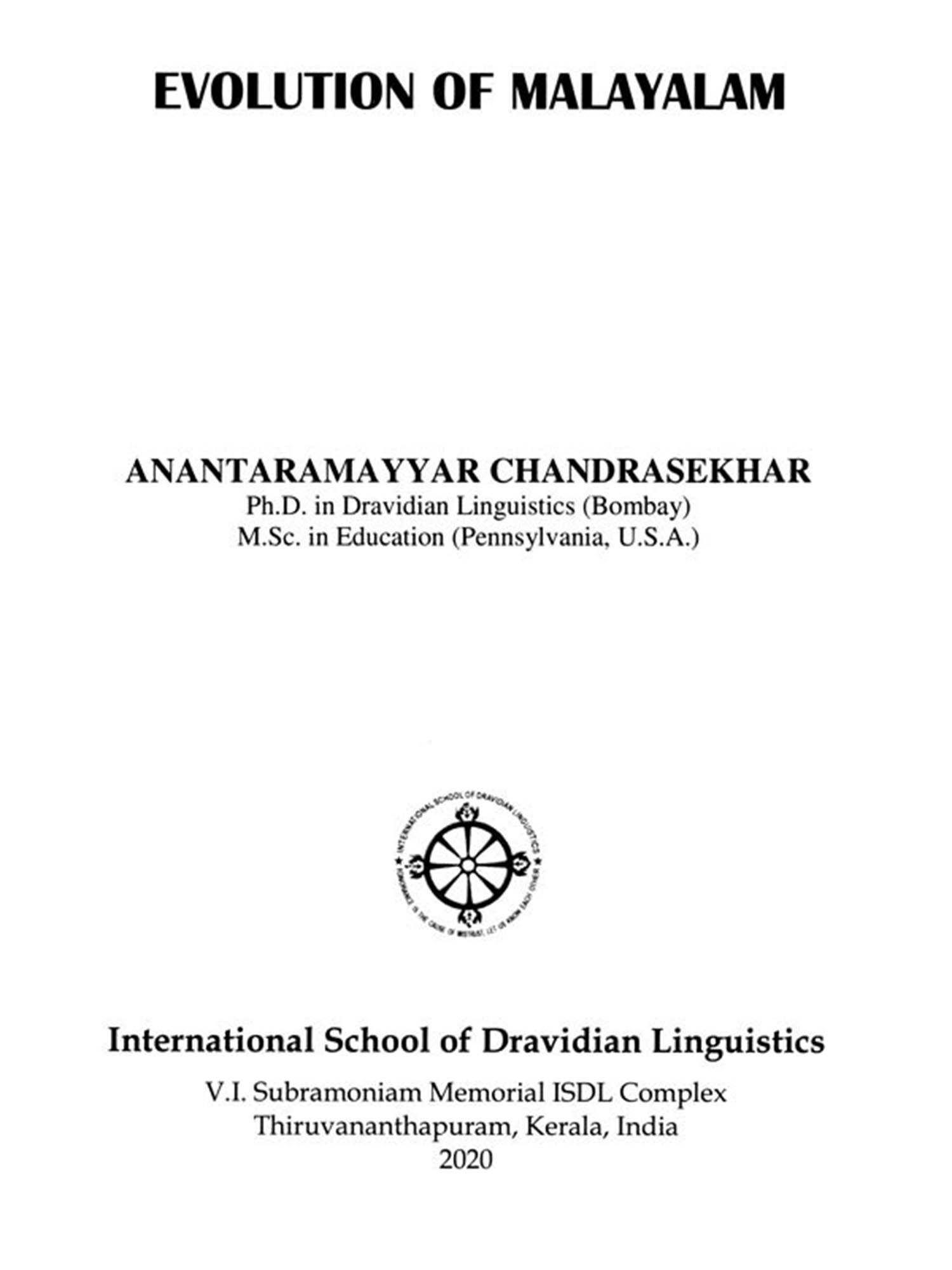 'Evolution of Malayalam' by Anantharamayyar Chandrasekhar (A.C. Sekhar) is an analysis of the grammatical structure of the earliest phase of the Malayalam language. Later half of the 9th C.E. to 12th century C.E. is treated here as the earliest phase represented chiefly by 34 inscriptions viz., 4 belongs to erstwhile Malabar, 5 from erstwhile Cochin state and the remaining are from Travancore state. It is the first linguistic treatise on Malayalam inscriptions. On the whole, this book is an attempt to contribute datas for a historical grammar of Malayalam language. The entire data consists approximately 7000 words which represent the language of nearly four centuries.