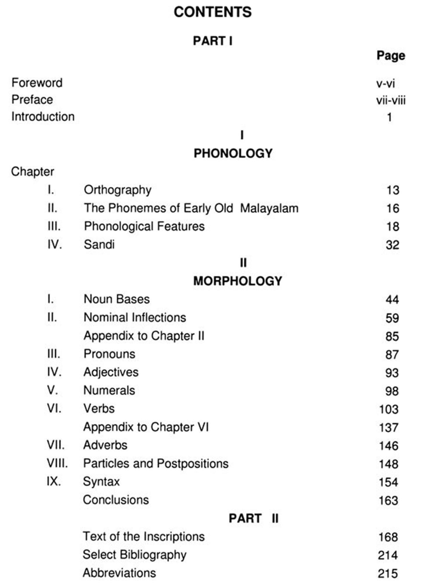 The content of this monograph is broadly divided into two parts having chapters on Phonology and Morphology along with an introductory chapter in Part I and Text of inscriptions in the second part. Under the title Phonology, chapters on Orthography, Early old Malayalam phonemes, Phonological features and Sandhi are seen treated. Analysis on Noun bases, Nominal inflexion, Pronoun, Adjectives, Numerals, Verbs, Adverbs, Post position and Syntax are seen in the chapter on Morphology. Appendix to nominal inflections and verbs follows subsequently. Thus 'Evolution of Malayalam' had 16 chapters dealing with different aspects of Malayalam linguistics.