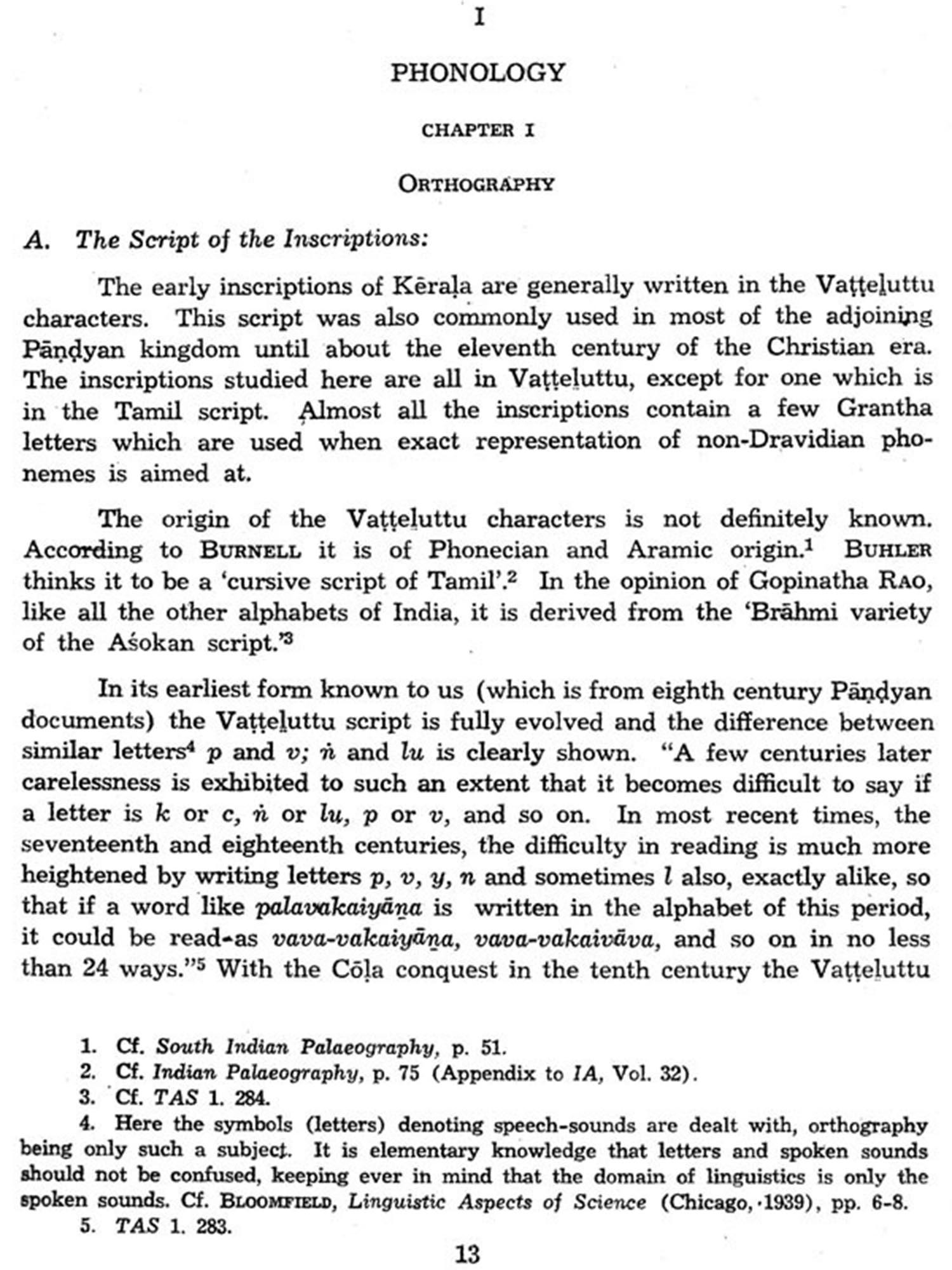 The following study attempts to present a picture of the Malayalam language as it was during its earliest known period. This period, which has been described as the Early Old Malayalam period, may be said to begin roughly in the last quarter of the ninth century of the Christian era (which coincides with the third quarter of the first century of the Kerala era known as the Kollam era), and end in the first quarter of the thirteenth century of the Christian era (or in the last quarter of the fourth century of the Kollam cra). During this period the speech of Kerala is characterised by a large number of forward developments, particularly in the fields of phonology and morphology. By the end of the fourth century of the Kollam era, the developed forms are so numerously represented as to justify the marking of definite stage in the development of Malayalam with the beginning of the the century. This study which pertains to the earliest phase of Malayalam, herefore, ends with the close of the fourth century of the Kollam era.
