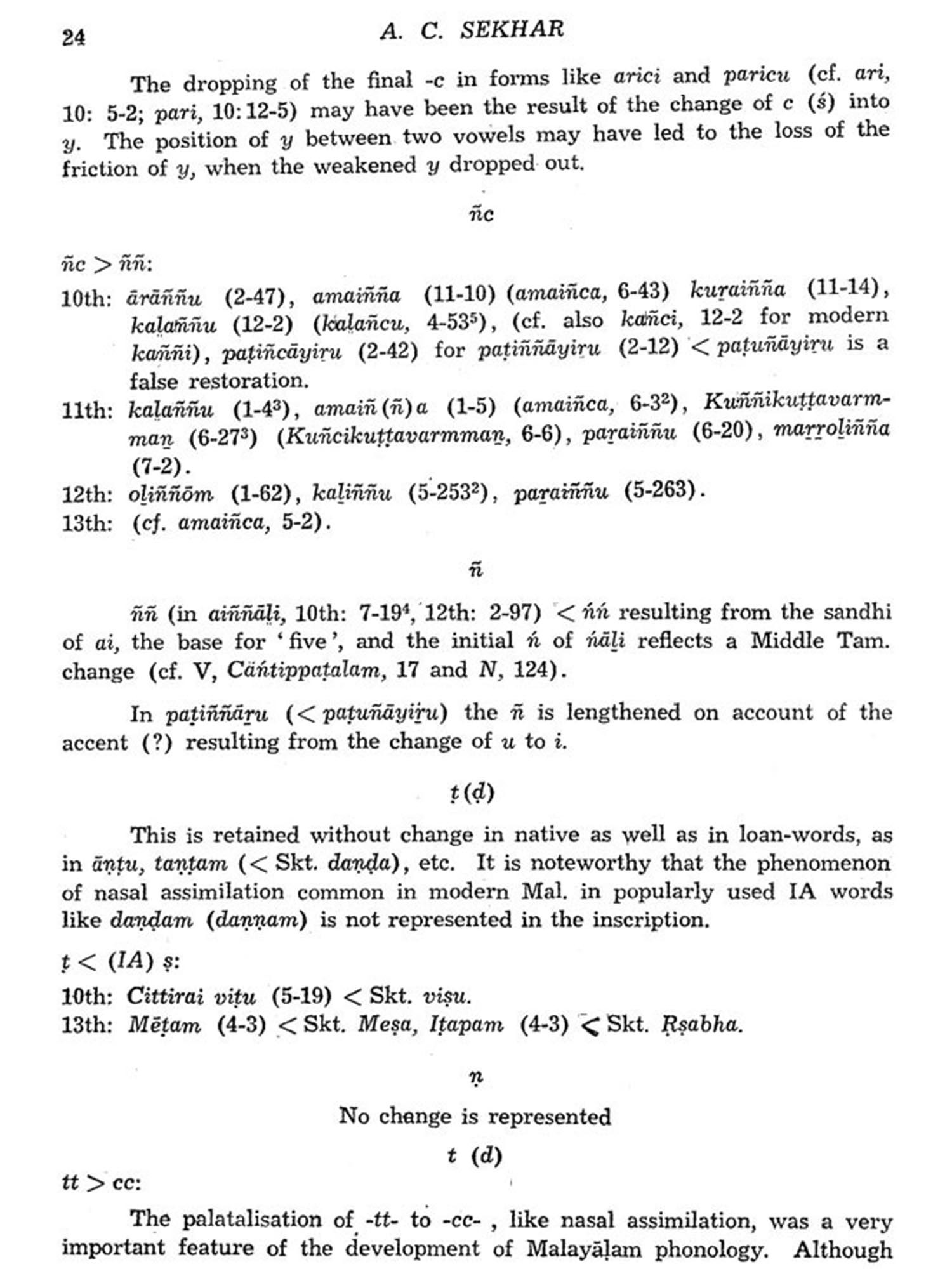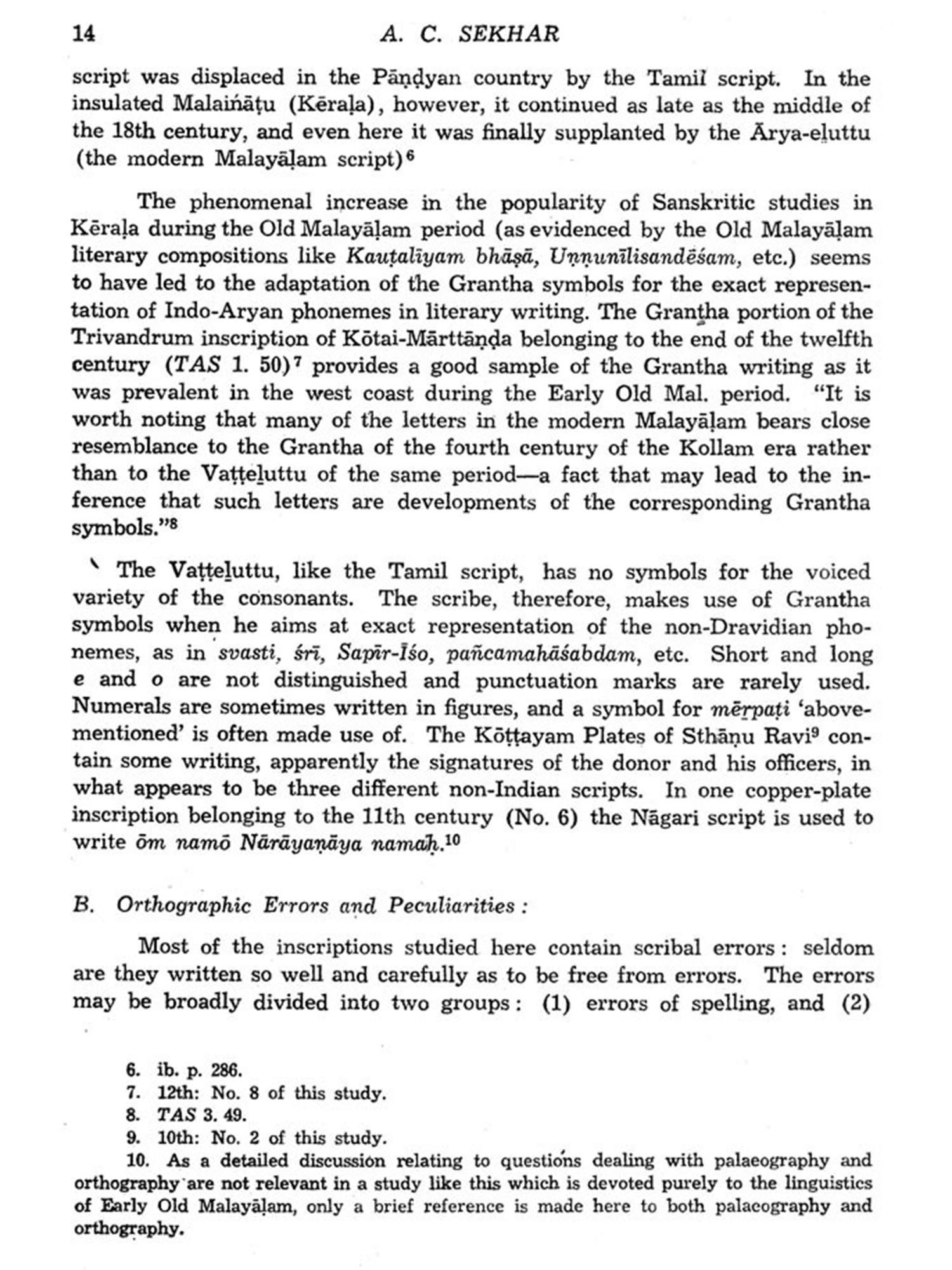 The analytical study of early old Malayalam inscription by A.C. Sekhar clearly exposes the linguistic fact that the Malayalam speech forms maintained an individuality of its own even before the period of early inscriptions in Malayalam.