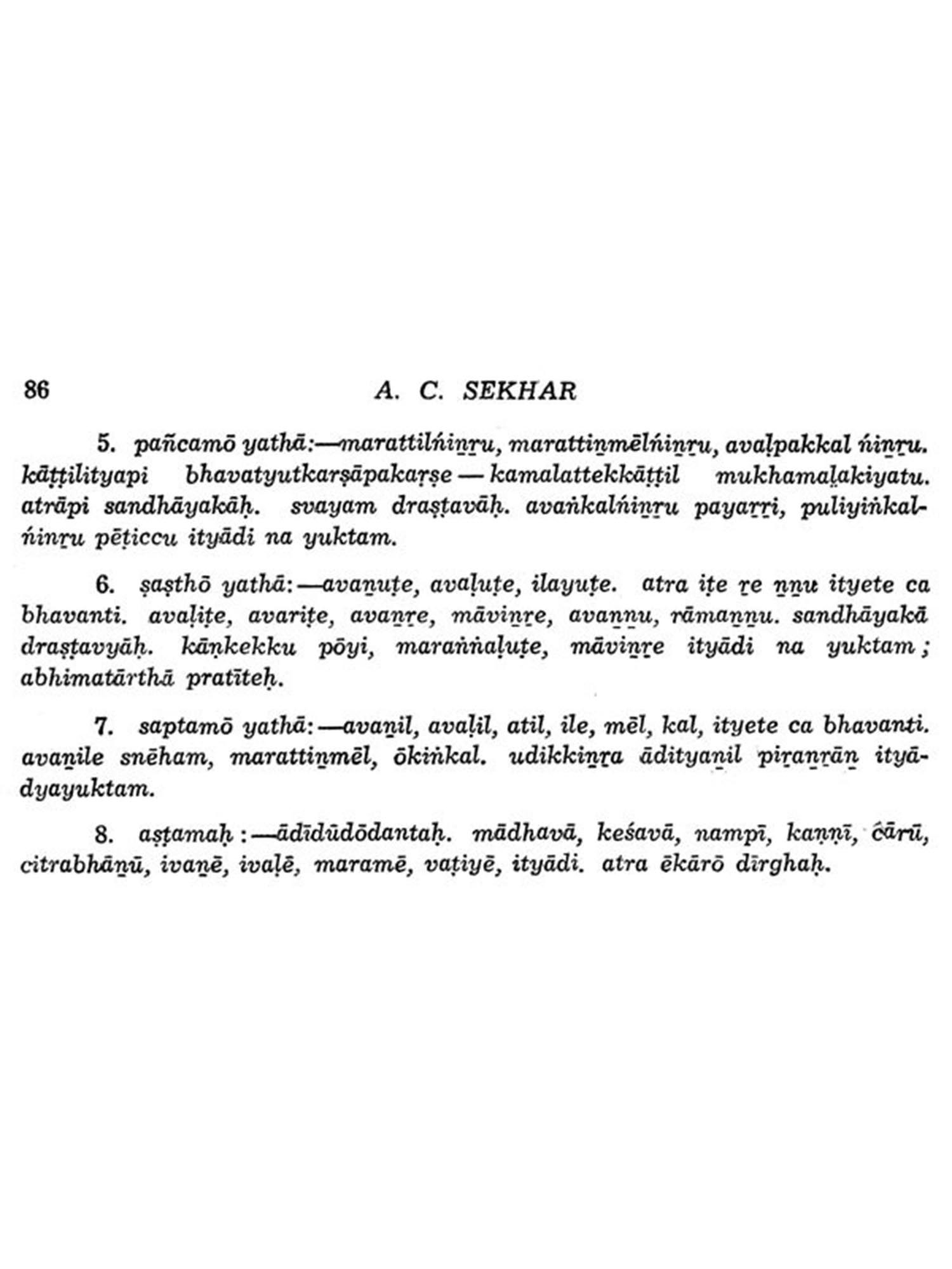 A.C. Sekhar is of the opinion that Malayalam did exist in the speech of the west coast people even before 9th century C.E. Most of the observations arrived in this study concur with the views of L.V. Ramaswami Aiyar. To elucidate the points in discussion A.C. Sekhar is particular in quoting the views of prominent linguist like A.R. Rajaraja Varma, Robert Caldwell, L.V. Ramaswami Aiyar and Hermann Gundert. He is also not reluctant in quoting from ancient grammatical treatises like Tolkappiyam, Lilatilakam etc.