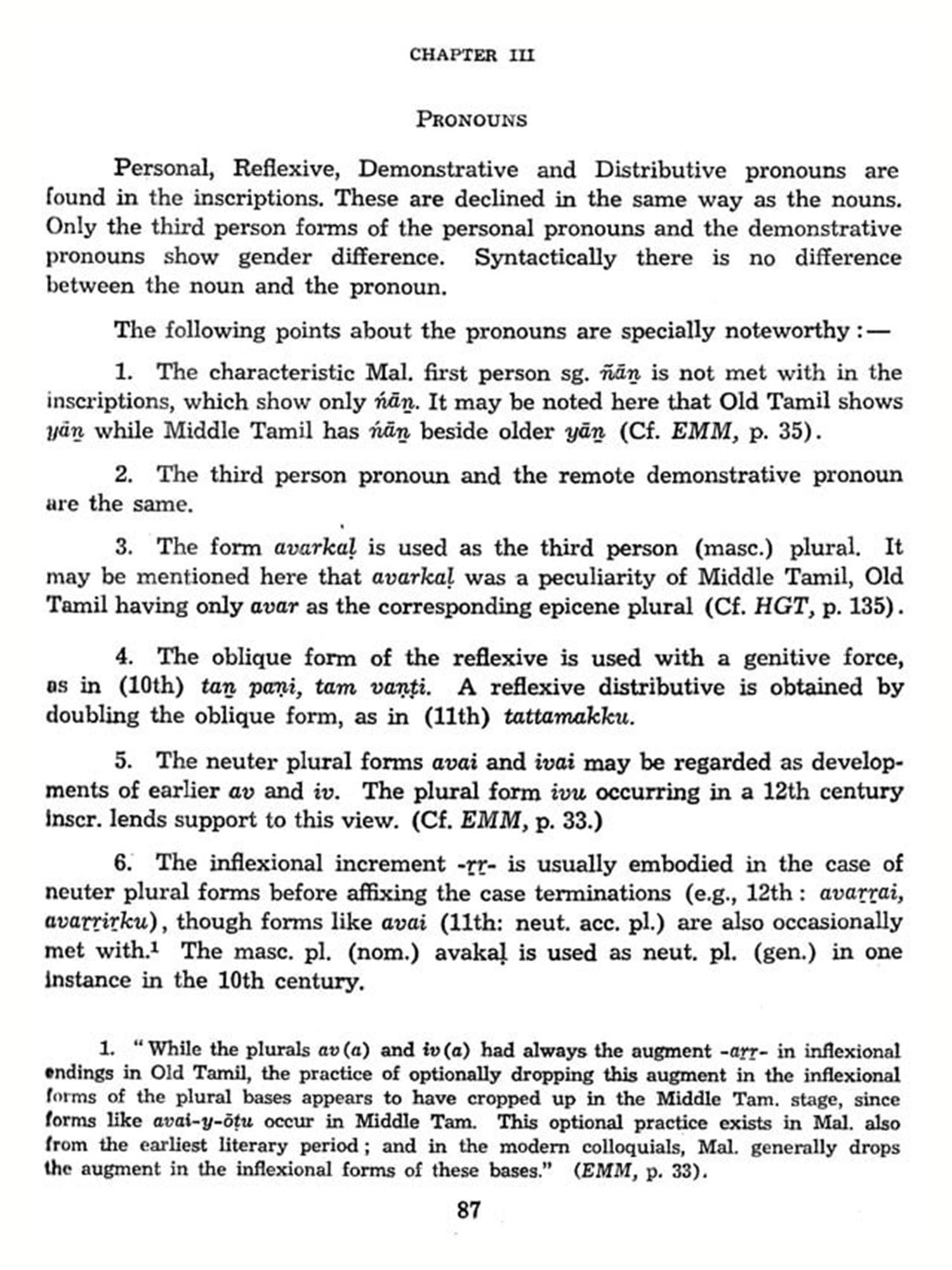 Reviewing the earlier linguistic studies in Malayalam, it should be stated here that GUNDERT, the pioneer of modern Malayalam linguistic studies, has brought together in his grammar published nearly a century ago, considerable material of value for an understanding of the growth and structure of the Malayalam language. Though the main purpose of his grammar is only descriptive, he has, with the scanty material at his disposal, attempted to envisage a few historical perspectives. In more recent times, A. R. Rajaraja VARMA, in his Kerala-paniniyam, has given us a fairly sound general picture of the Malayalam language both in its historical and descriptive aspects.