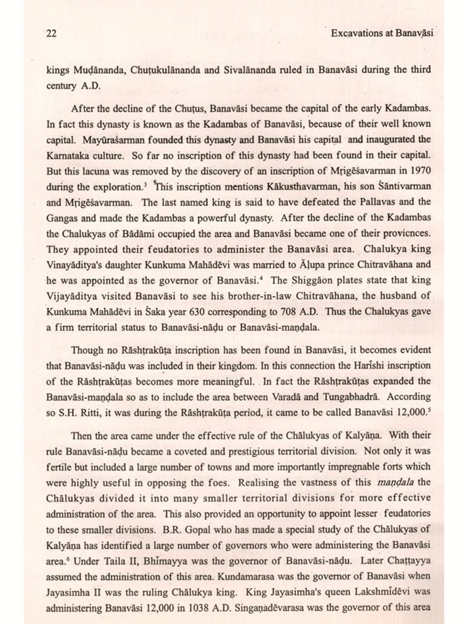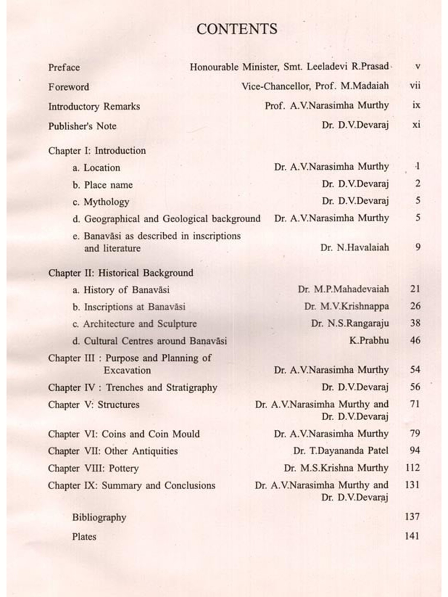 It is natural that such a glorious and religious place attracted Sanskrit and Kannada poets alike. To the great poet Pampa, Banavasi epitomised the finest aspects of Karnataka culture and he expressed a desire to be reborn here atleast as a bee. Due to natural and historical reasons, most of the early structures, houses and temples lay buried under the mother earth. The archaeologists under the guidance of late Dr. M.Seshadri conducted excavations here and brought to light the ancient glory through the brick structures, inscriptions, terracottas, coins, beads, pottery and other antiquities. I congratulate the team of archaeologists from the Directorate of Archaeology and the Mysore University, particularly Dr. D.V.Devaraj and Prof. A.V.Narasimha Murthy for planning and publishing the report in an excellent manner. It is the endeavour of our government to enrich the culture of Karnataka by bringing out publications on different aspects of the heritage of Karnataka. I am sure that the present publication is one more step forward in that direction.
