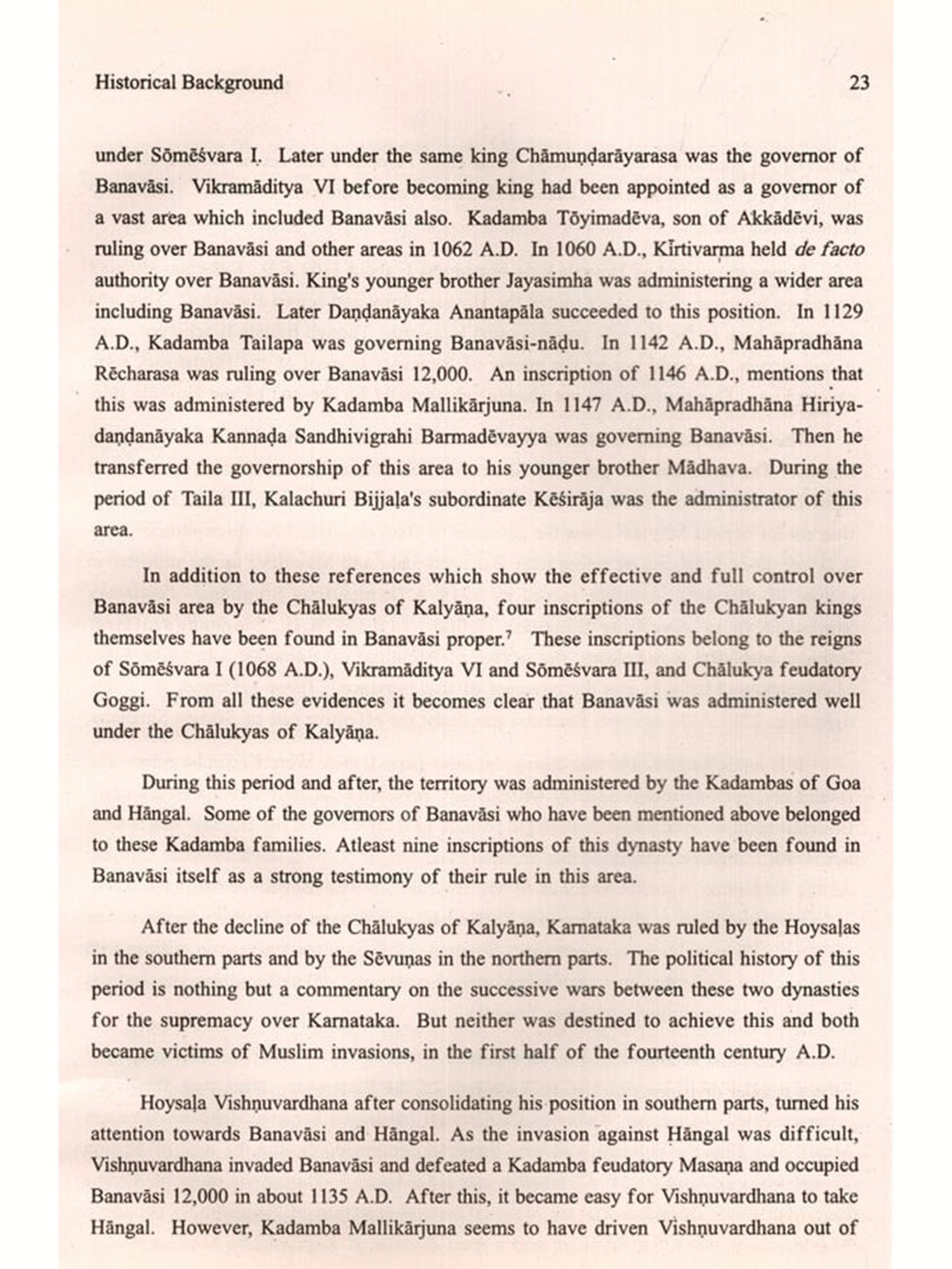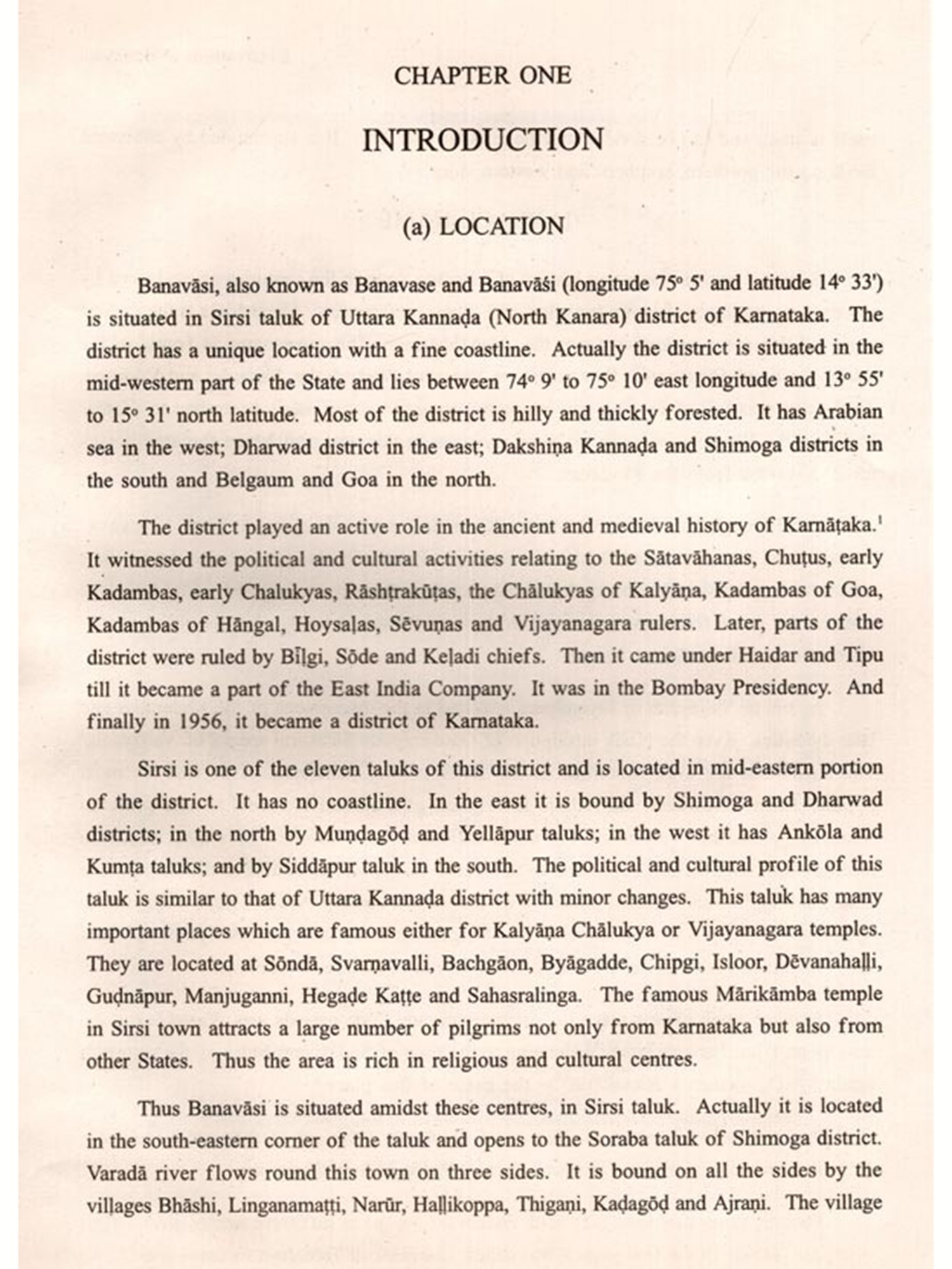 Banavasi is one of the celebrated ancient cities not only of Karnataka but also of our country. It had attracted the attention of the great ruler Aśoka more than two thousand years ago and Buddhist monks from Banavasi were invited to attend the inauguration of the Mahastûpa at Ceylon. Even the Greek writer Ptolemy had a good knowledge of this city. Attracted by the natural beauty, fertile soil, fine climate and rich resources, the successive Karnataka dynasties like the Sätavahanas, the Kadambas, Chuțus, Chalukyas, Hoysaļas, Sēvuņas, Vijayanagara rulers and Söndă chiefs ruled here. This land became sacred because of the presence of Madhukēśvara, the presiding deity of Banavasi.