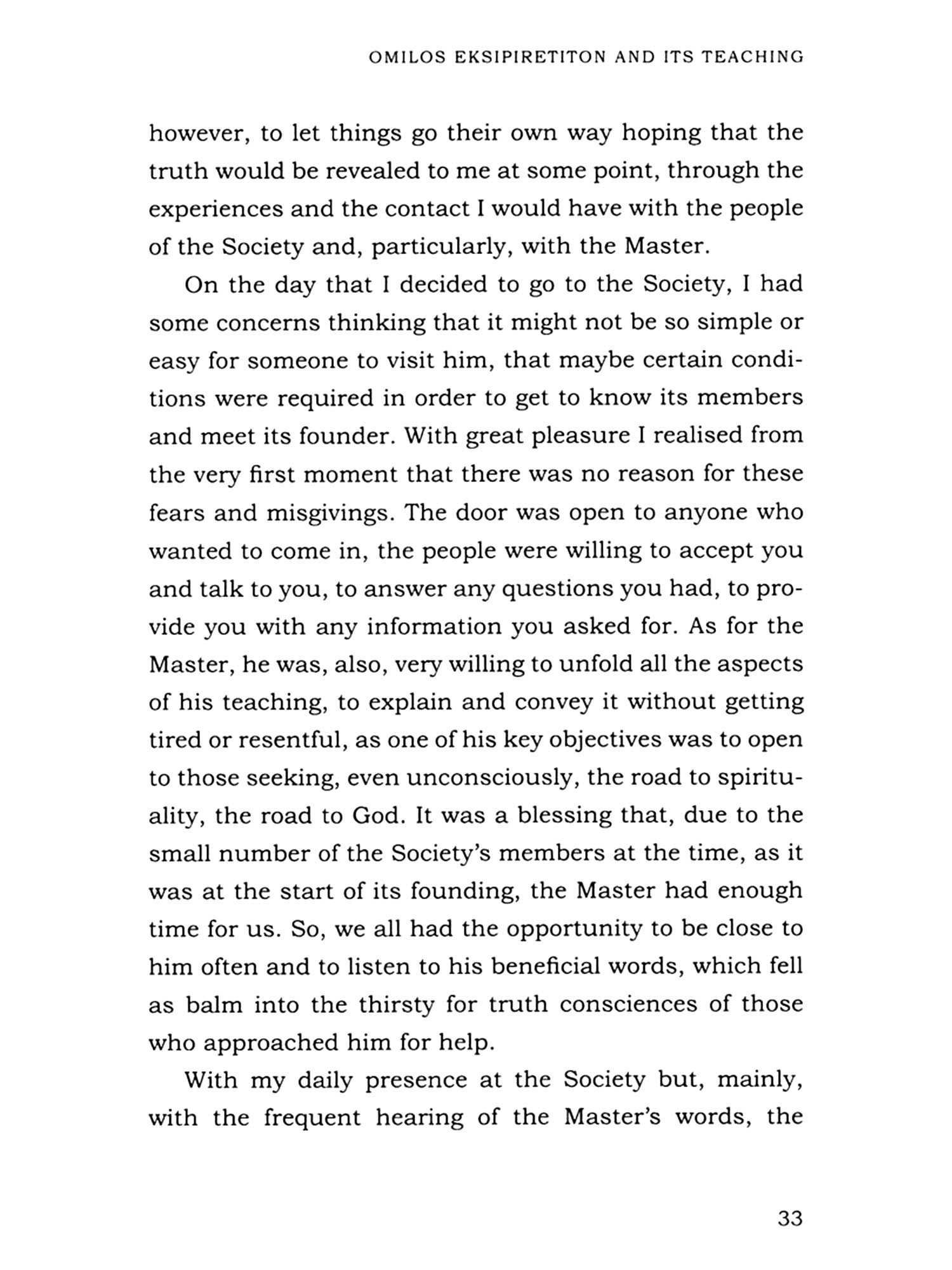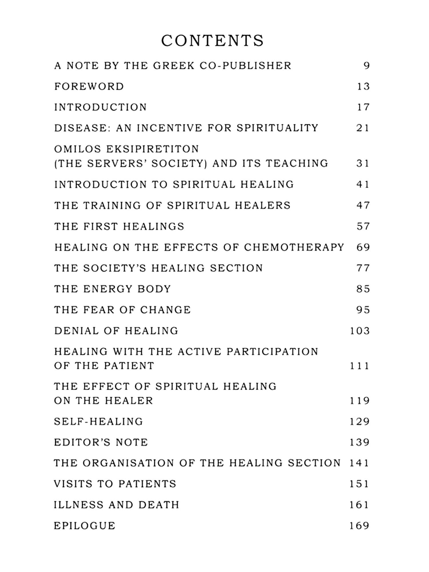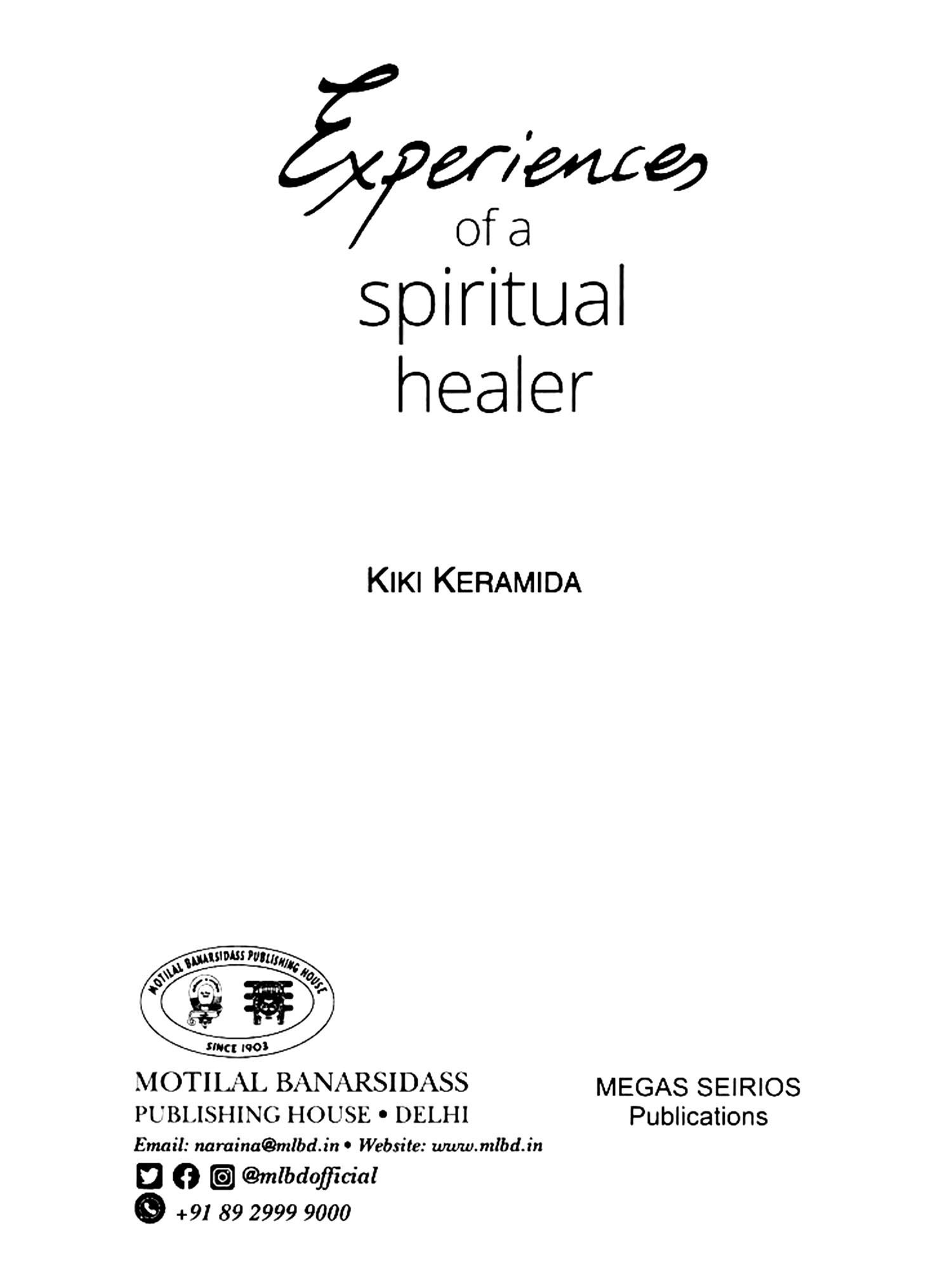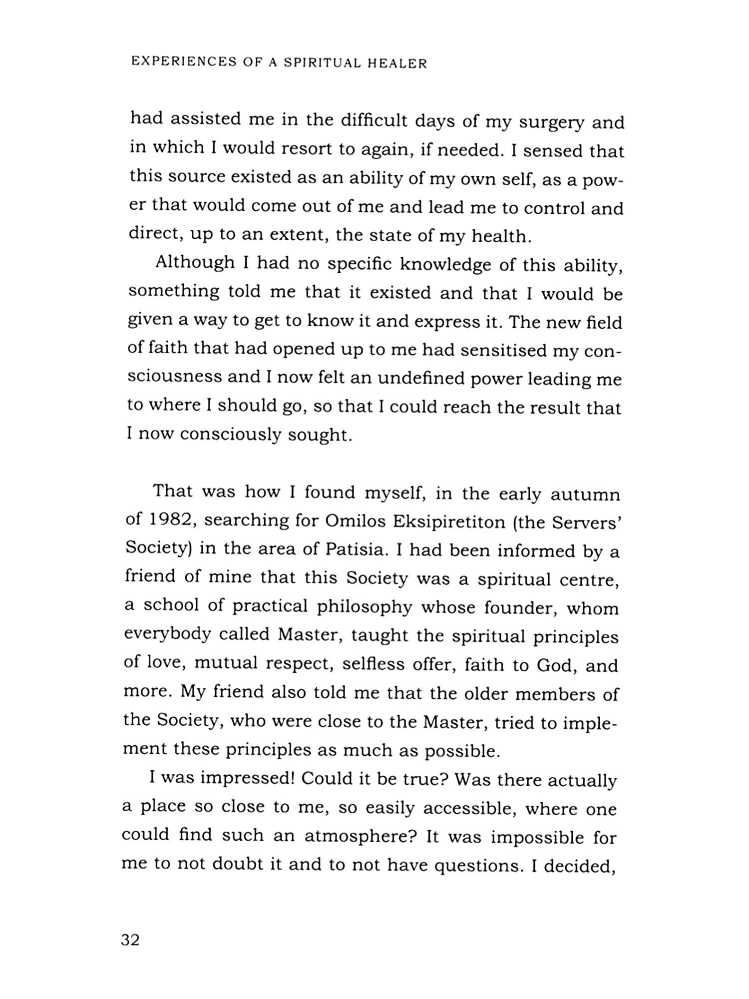 When I received the first manuscripts of Mrs Kiki Keramida's book, I was pleasantly surprised. I did not know that she had begun writing a book, I only knew that she was considering the issue, wanting to follow the prompts of the Master, who had advised her to write down her personal experiences from spiritual healing. The Master, poet and philosopher Dimitris Kakalidis is the founder of the spiritual centre "Omilos Ekspiretiton (The Servers' Society)". Throughout his entire life, alongside his writings, the Master taught the Society's members proper human relationships, self-knowledge and spiritual principles. As discussed in the following chapters, spiritual healing was also part of his teachings, followed by those who were interested in this vocation.