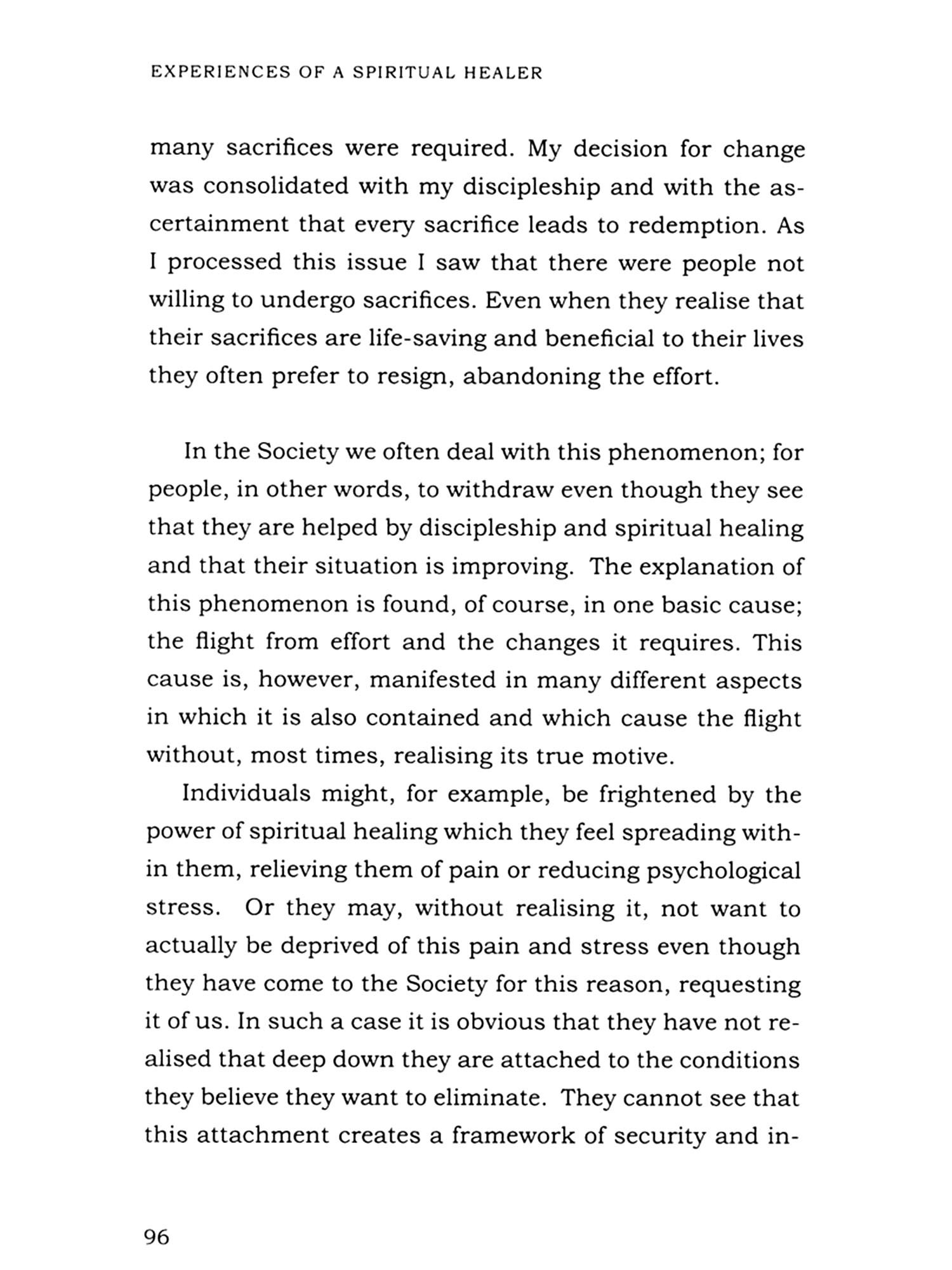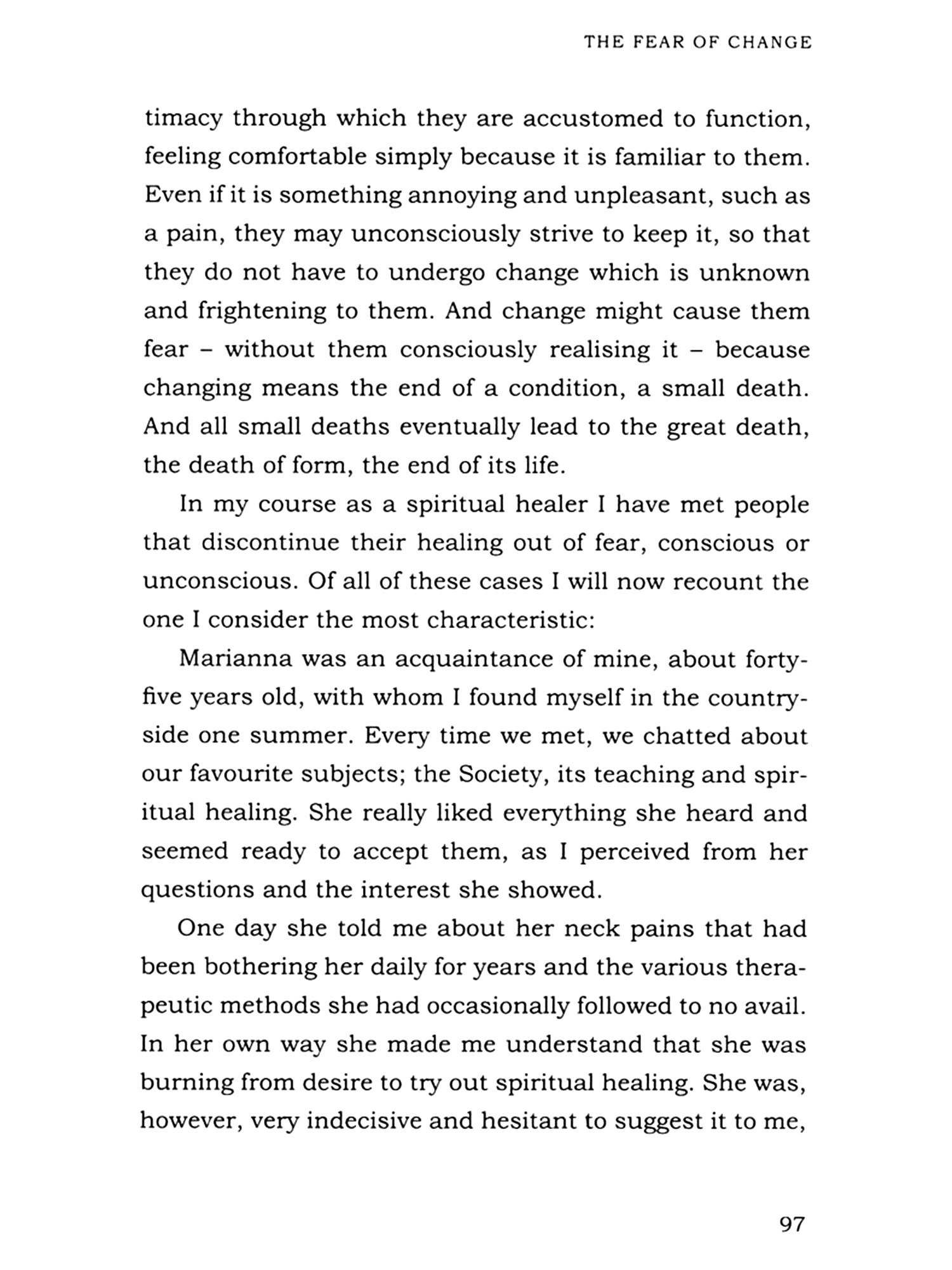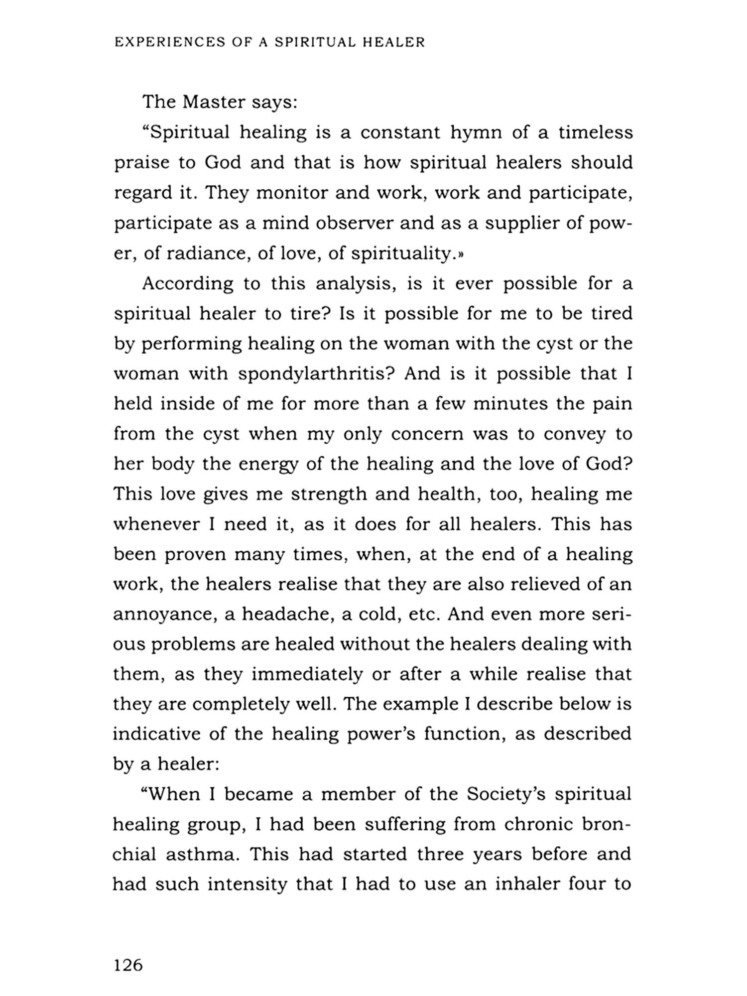 Mrs Kiki showed a particular interest in spiritual healing from the beginning of her discipleship. Because of this, soon she was entrusted with the responsibility of organizing the healing section which had started to operate within the Society under the Master's guidance. From that time she devoted herself completely to this project. She set up the groups of healers, dealt with the monitoring of patients who asked for the help of spiritual healing and she undertook the task of conveying to those who wanted to become healers the teachings she received from the Master as head of the healing section. Her experiences from her contact with patients, from the healings that she and others performed, as well as from her personal course as a spiritual healer were significant, as will become apparent in the following chapters.