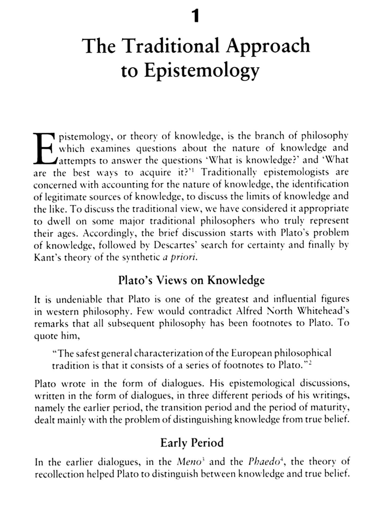 In the first chapter, the traditional approach to epistemology has been discussed briefly focusing on the views of Plato, Descartes and Kant, the three major traditional epistemologists who truly represent their ages.