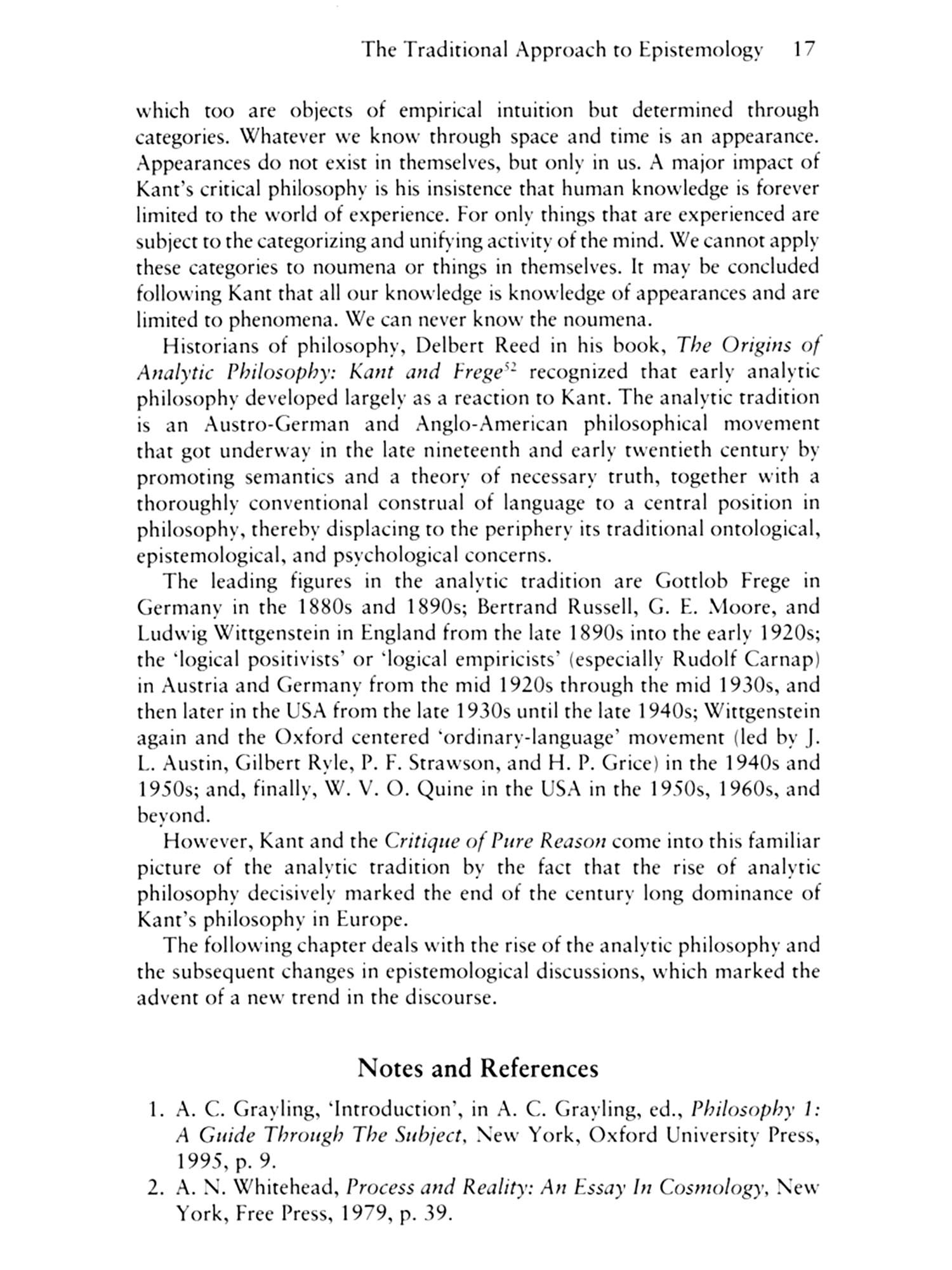 The second chapter traces the introduction of the analytic movement in epistemology, whereby the justified true belief analysis of knowledge comes to the fore. After elucidating the responses to ""The Gettier Problem', Quine and Rorty's views have been discussed, which provided new directions in accelerating a new trend in epistemology, namely that of social epistemology.