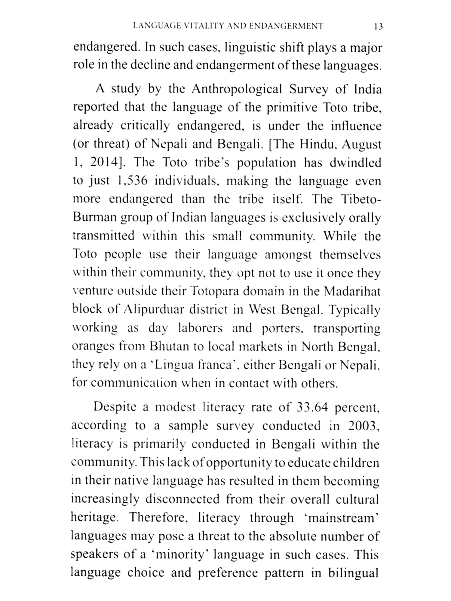 This book is an outcome of that tireless endeavour of ILSR. Professor Amitava Das undertook a colossal study of some of the languages of the linguistic minorities of West Bengal to understand the dynamics of linguistic and cultural shift and how to resolve issues related to the medium of education, literacy programme, language maintenance and revitalisation especially in tribal areas of West Bengal with special reference to Santāli and Mundā. The study, based on the field survey conducted in the years 2010-12 supported by the census data from 1991 to 2011, tries to delineate and highlight the changing scenario of these communities regarding their linguistic and cultural shift that have been instrumental in this state over the preceding two decades prior to 2011.