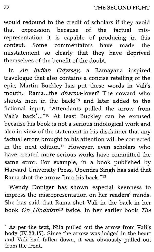 One of the important episodes in the journey was the killing of Vali. The view that the action had disgraced him is at least as old as the vulgate Mahabharata. In the context of Drona's death, for Yudhishthira's act of deceiving him though without literally uttering a lie, Arjuna* admonished him when he said (or was made to say by a later interpolator), "The ill-fame, in consequence of the slaughter of * Ironically, Arjuna too was accused of taking the victim unawares, in the Mahabharata war when he cut Bhurisravas' arm, an act which, in Bhurisravas' view, "killed" him. (Mahabharata, VII.118.4-15, Critical Edition). If the words extracted above were his and not an interpolation, his moral right to comment on Rama's alleged covert killing of Vali is questionable.