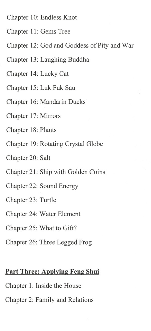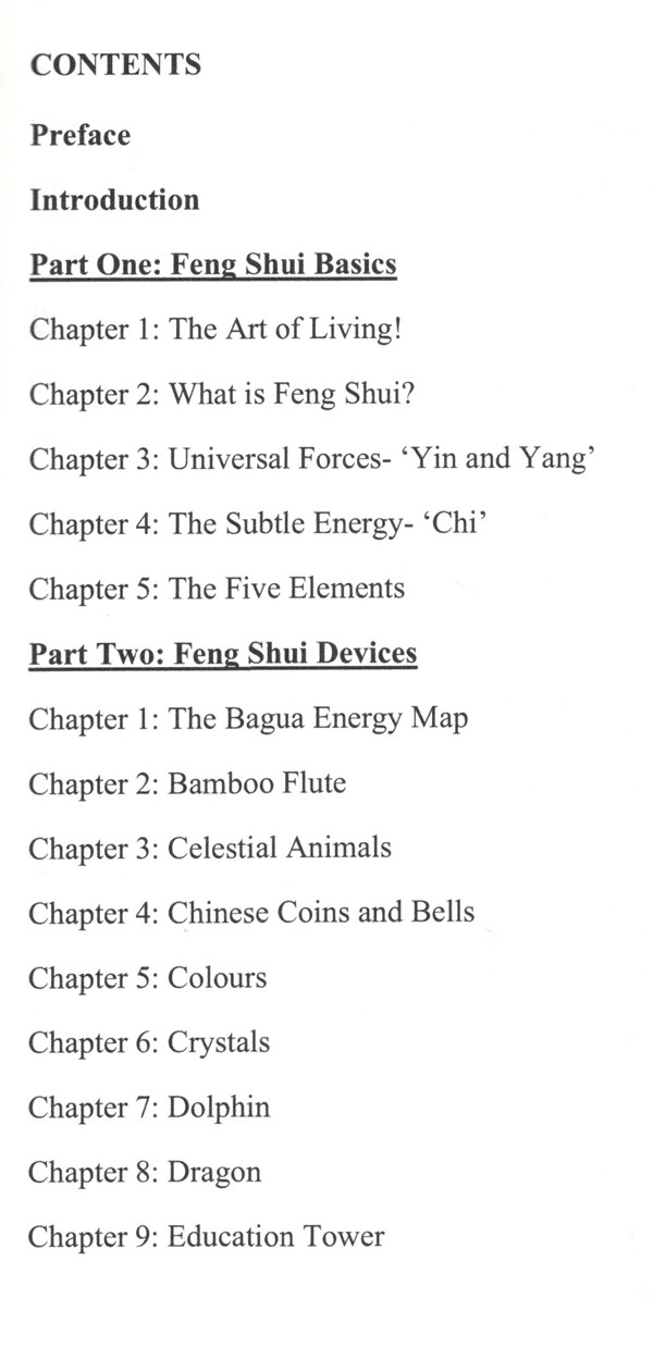 The book is divided into four parts. Part-1 contains five chapters and will enable you to fully grasp the basics of Feng Shui. The author believes that unless you know the fundamental principles you cannot fully benefit from any art or science.