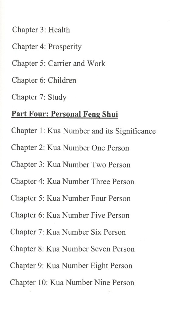 Part-3 is about the applications of Feng Shui to various aspects of life such as Carrier, Family and Relationships, Education etc. The seven chapters of this part give useful suggestions which can transform your life magically. Part-4, through its ten chapters describes the concepts of 'Personal Feng Shui' based on the Kua numbers. Each person has a personal Kua number as per the year of birth according to Chinese Lunar calendar. This part of the book will enable you to calculate your Kua number and learn about your personal auspicious and inauspicious directions. By avoiding inauspicious directions and strengthening the auspicious ones you can enrich your life and save yourself from many troubles.