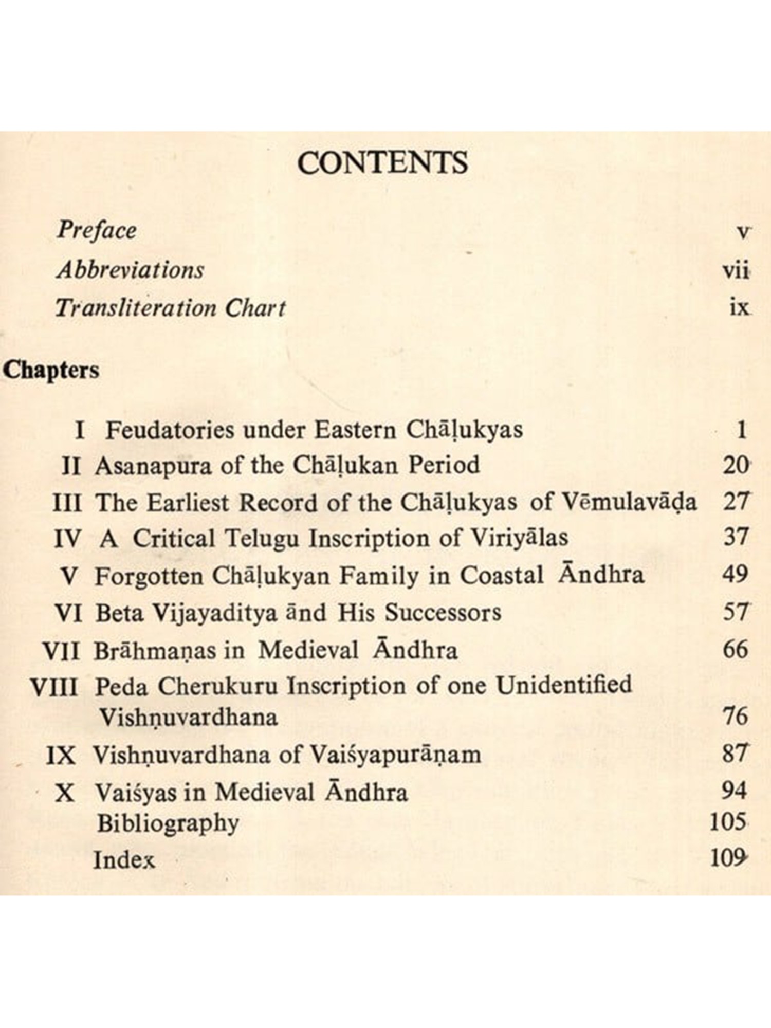 The present book is purported to present chapters on various aspects on the history and culture of the Andhras. The history of the Chalukyas in Andhra may be rightly stated as the history of Medieval Andhradesa for thousand years beginning with the conquest of Vengi in the first quarter of seventh century A.D. by the Badami Chalukya king Pulakesi II and ending with the total disappearance of the Chalukya authority in Andhra at the end of sixteenth century. It was in their regime that a major portion of Andhradesa was united politically and culturally. Telugu literature was born and spread in their patronage; and the Andhras developed their own styles in the spheres of art and architecture due to their encouragement. In all their success it became necessary on their part to believe and depend upon some subordinate officers and feudal chiefs like Pattavardhanis and Katakarajas who devotedly followed them and guarded their interests. The history of those feudal families is studied in detail in the first chapter.