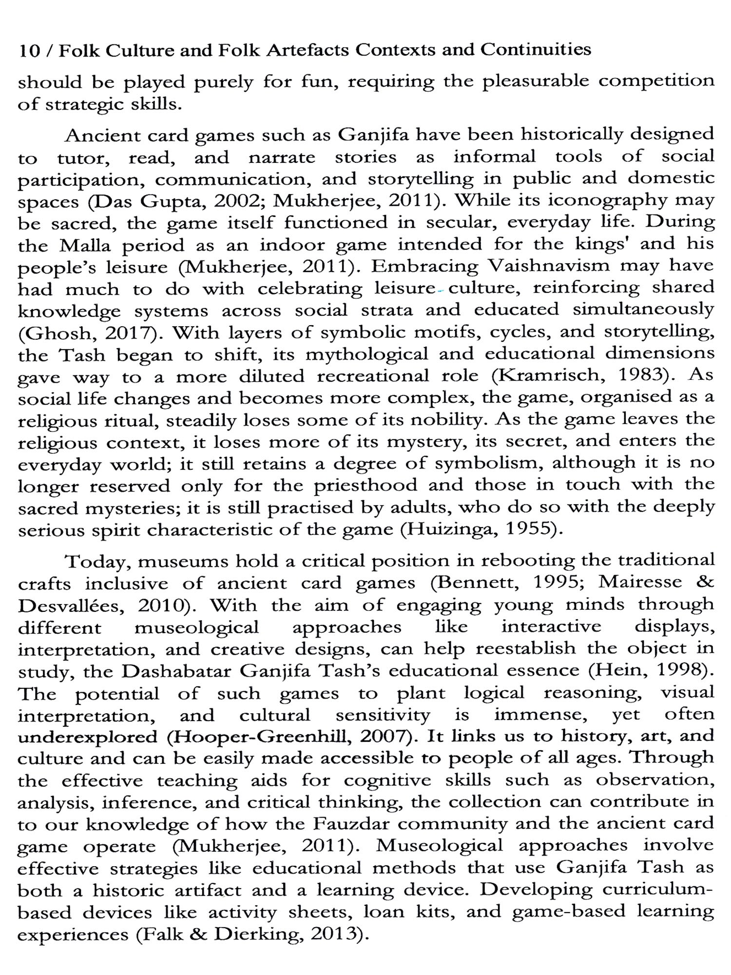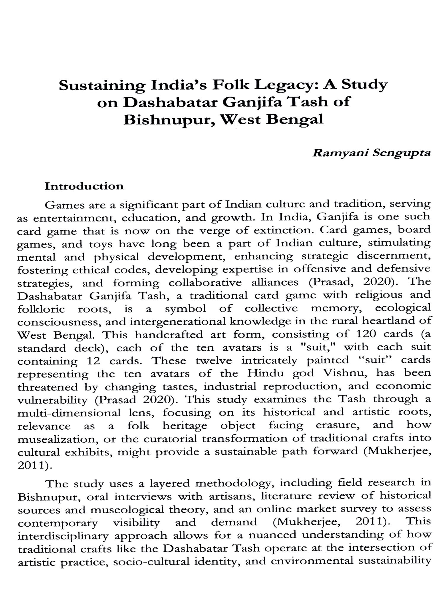 The volume opens with material heritage associated with social practices and community identities. Ramyani Sengupta's article on Dasahabatr Ganjifa Tash of Bishnupur, West Bengal illustrates how folk artefacts embody cultural identity and communal traditions while serving as vehicles of storytelling. Sustained through generational transmission by the Fauzadar family, this craft highlights both the resilience and vulnerability of folk heritage in the face of modernization.