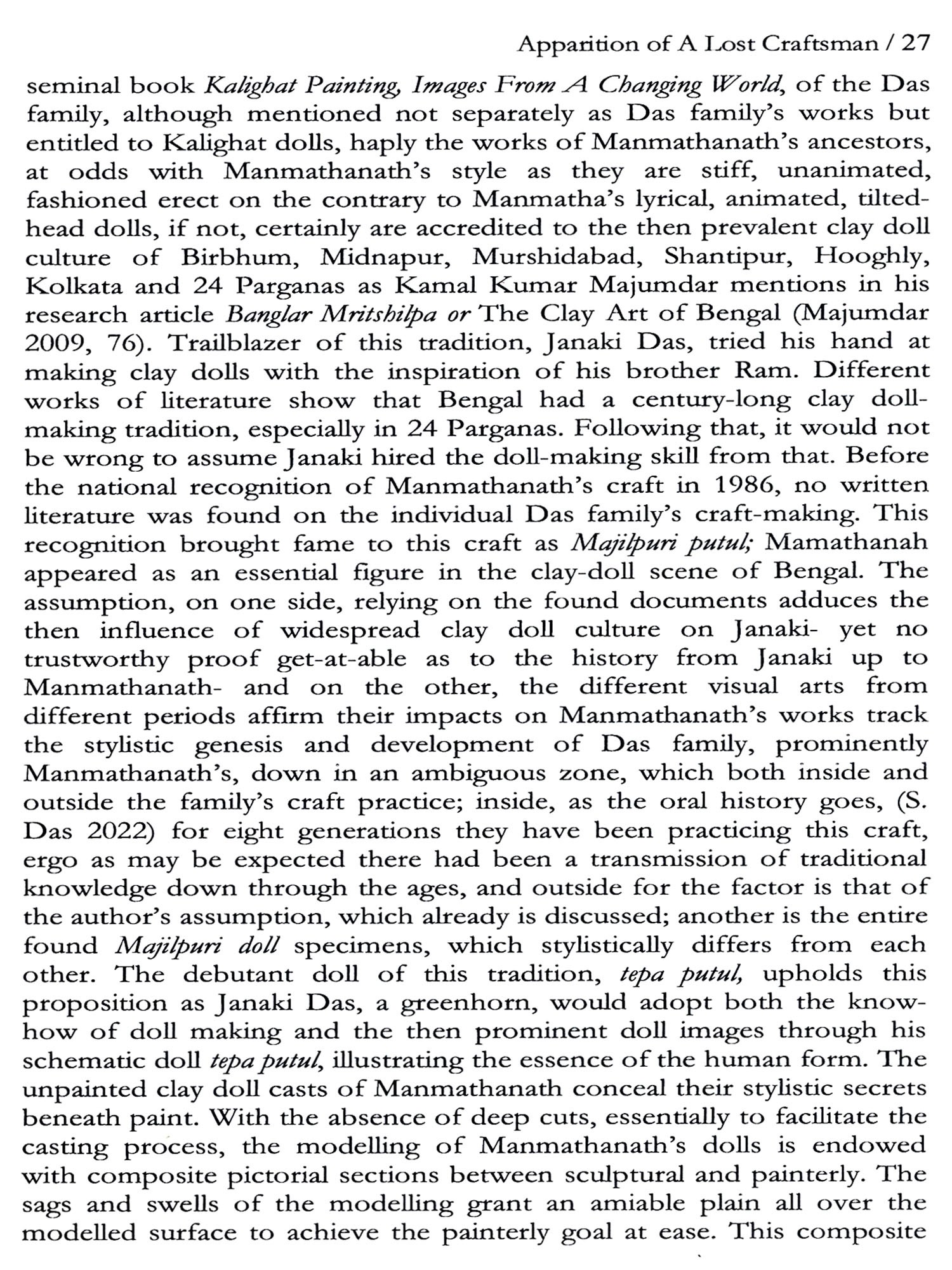 In the landscape of Indian folk art, which is most often understood as a collective practice, the clay dolls of Jaynagar Majilpur stand out as a rare case centred on the creativity of a single artisan. Located in southern West Bengal near the Sunderbans, Jaynagar Majilpur is home to the tradition pioneered by Manmathanath Das, who was posthumously awarded a national honour in 1986. His repertoire of nearly thirty-five types of dolls ranged from Hindu and Islamic figures to regional deities, from Calcutta's nineteenth-century Babus to everyday rural life, drawing subtle influence from the Kalighat style. After his death, his family continued the practice, inheriting his moulds and sustaining the distinct style of painting and brushwork. Today, these dolls embody a layered symbolic identity that reflects both continuity and cultural hybridity. As Guruprasad Dey and Shatarupa Thakurata Roy argue in this chapter that the Jaynagar tradition can be read through a post-colonial lens as a synthesis of artistic idioms and as a living example of how folk art negotiates changing contexts of meaning and appreciation.