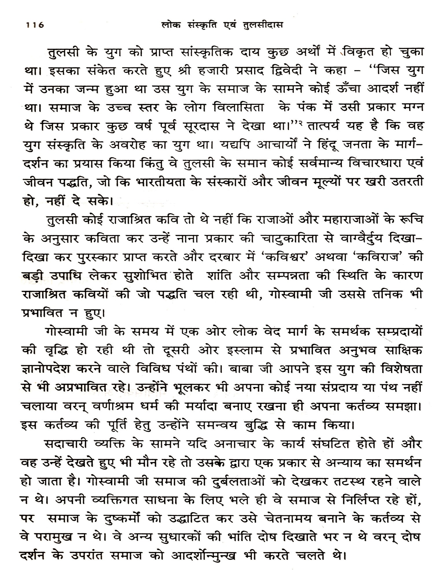 यद्यपि तुलसी आज से लगभग पाँच सौ वर्ष पुराने हैं परन्तु उनकी सामाजिक चिंताएँ वर्तमान में भी उतनी ही सार्थक है। वास्तव में उनका संपूर्ण चिंतन मानव मात्र की चिंता से जुड़ा है। उनकी चिंताएँ समाज के शाश्वत प्रश्नों से जुड़ी है जिनके लिए उन्होंने समकालीन सामन्ती समाज से संघर्ष किया। वस्तुतः आज के समय में तुलसी को पढ़ना अपनी संस्कृति व साहित्य से अवगत होना व अपने सांस्कृतिक मूल्यों का परिचय पाना है। उनकी कृतियों में लोक संस्कृति अति प्रभावशाली व सशक्त है।