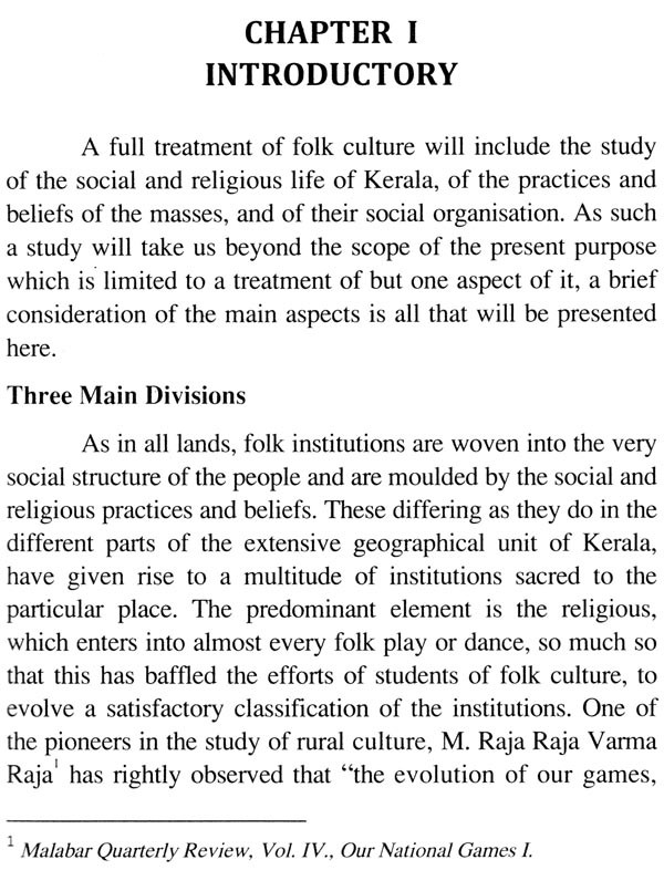 With the publication in 1936 of Dr. Chelnat Achyutha Menon's "Ballads of North Malabar", under the auspices of the University of Madras, a new era has dawned for the study of the folk culture of Kerala. In many respects it marks a turning point in Kerala folk studies, for barring a few notable exceptions; folk culture has made no serious appeal to scholars of Kerala. The researches that are now being conducted under the aegis of the Madras University, has raised the subject in the public estimation, and the educated Malayalee is at long last persuaded to accord to folk studies their right place in the cultural life of the country. Dr. Menon and other students of folklore have used the Malayalam term "Natotipattuka!" to signify folk songs. Derived from Natǝ, the Malayalam word for 'country', as distinct from 'town', the term natotipattukal, emphasizes the rural character of the songs, and their country-wide distribution. For the same reason the term, natotikalikal, or simpler still, natankalikaj has been adopted to denote folk plays, and atta-kajikaj to signify plays in which dancing forms the essential feature.