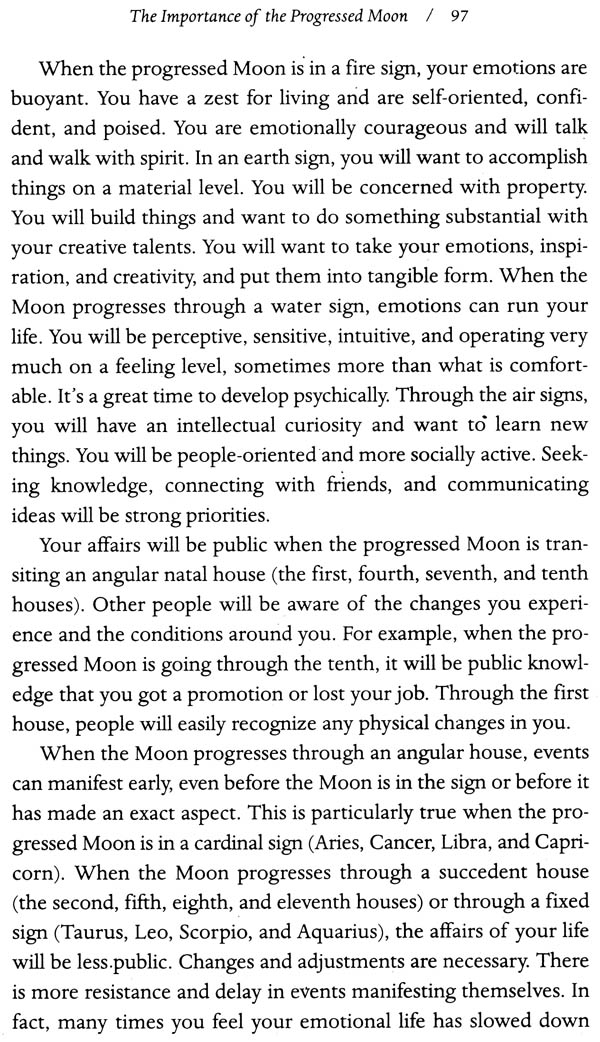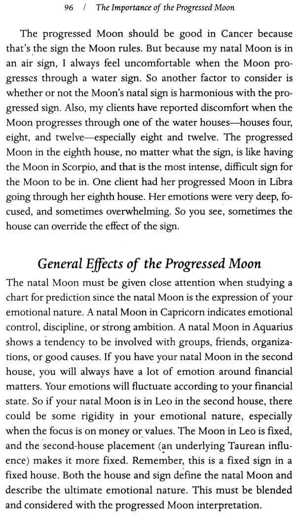 For timing, I use secondary progressions, which I outline below, with an added emphasis on the progressed Moon and the progressed house cusps. I look at progressed planets aspecting progressed and natal planets. I also do a lot of work with transits and stationing planets, with a special emphasis on the lunations (New Moons and Full Moons) and eclipses. This is my system, and it has served me well for three decades. I follow a logical order, which helps me feel organized and comfortable. I encourage each astrologer who reads this book to do the same. Again, here is my method: