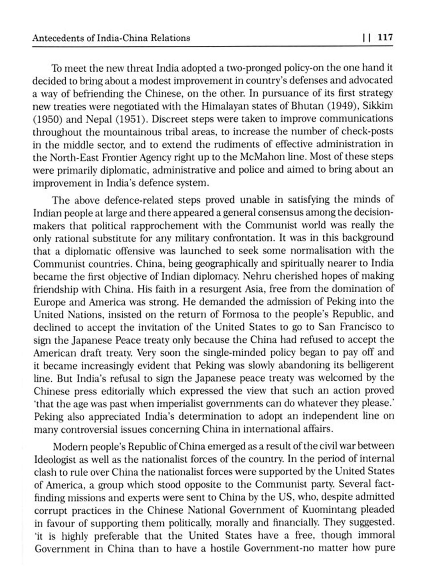 The position of India's foreign policy at the time of independence in 1947 was shaped by the country's colonial past, its geographical location, and its security concerns India's first Prime Minister, Jawaharlal Nehru, laid out the guiding principles of India's foreign policy, which were known as the ""Panchsheel"" or the ""Five Principles of Peaceful Coexistence."" These principles included mutual respect for each other's territorial integrity and sovereignty, non-interference in each other's internal affairs, and peaceful coexistence. At the time of independence, India faced several challenges, including territorial disputes with its neighbours, Pakistan and China, and the need to establish itself as a sovereign nation in the international arena. India's foreign policy was guided by the principles of non-alignment and neutrality, which meant that India did not align itself with any major power blocs during the Cold War India sought to maintain its independence and sovereignty by keeping a distance from the great power rivalries of the time. Country's foreign policy during this period was also focused on promoting decolonization and anti-imperialism, as well as promoting regional integration and cooperation. India played an active role in the formation of the Non-Aligned Movement (NAM), which was a grouping of developing countries that sought to promote their interests in the international arena.