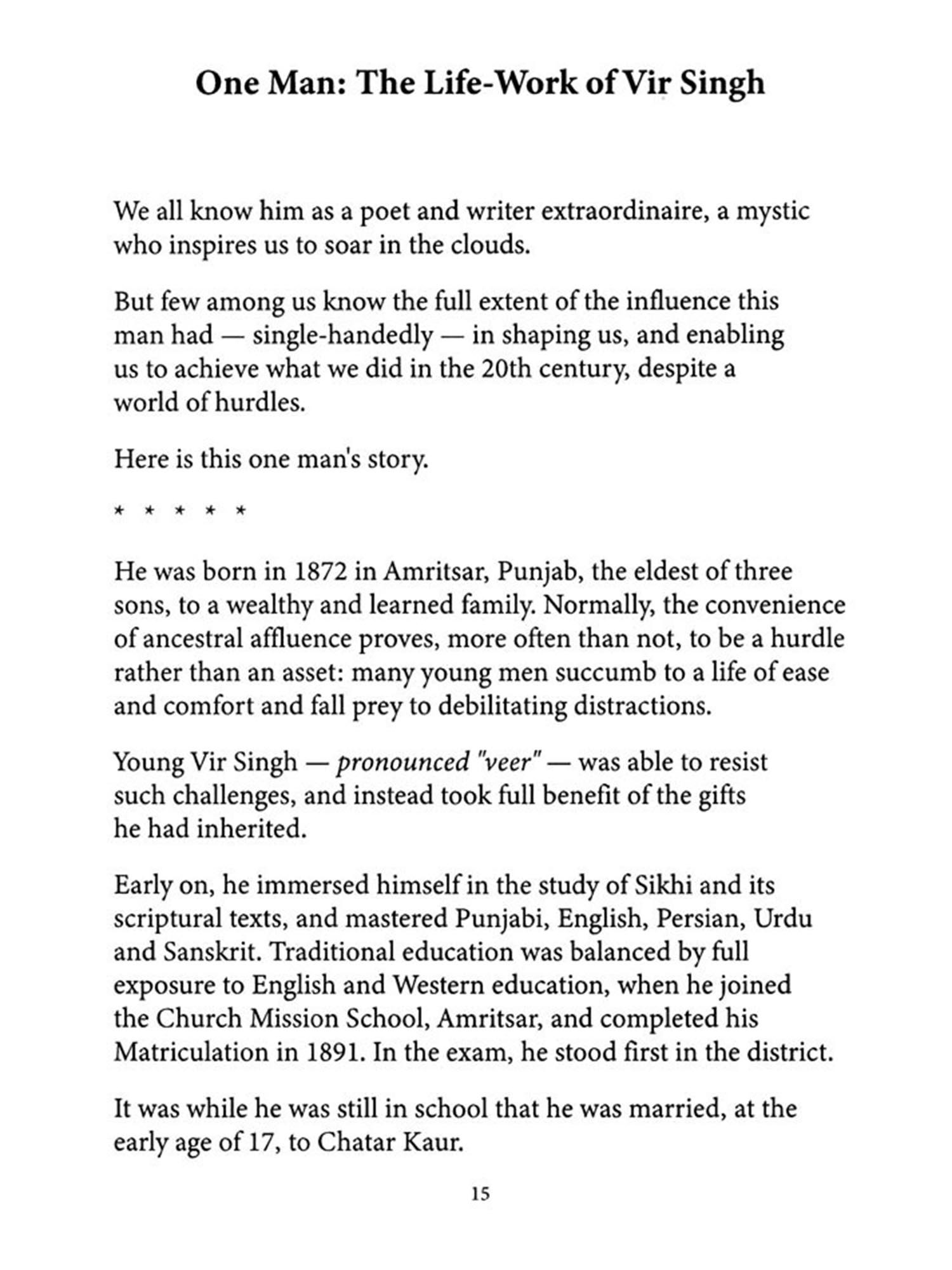 Bhai Vir Singh (1872-1957), a giant in Panjabi literature, is celebrated as "The Sixth River of Panjab." He was a mystic, poet, novelist, essayist, exegete, historian, editor, publisher, and journalist. His identification with Sikhi's significant concerns was so complete that he was canonized as Bhai, the "Brother of the Sikh Order," very early in his career. He was the leading figure in the Singh Sabha Movement, the dynamic Sikh renaissance in the late 19th early 20th century Panjab. Drawing upon the Sikh tradition of Braj literature for his primary inspiration and cultural motivation and upon the Panjabi literary tradition for its linguistic component, he initiated a new literary idiom distinctly different from both. In this writing lay the beginnings of modern Panjabi prose. His command of the science of etymology and the classical and contemporary languages enabled him to publish critical editions of some of the old Sikh texts.