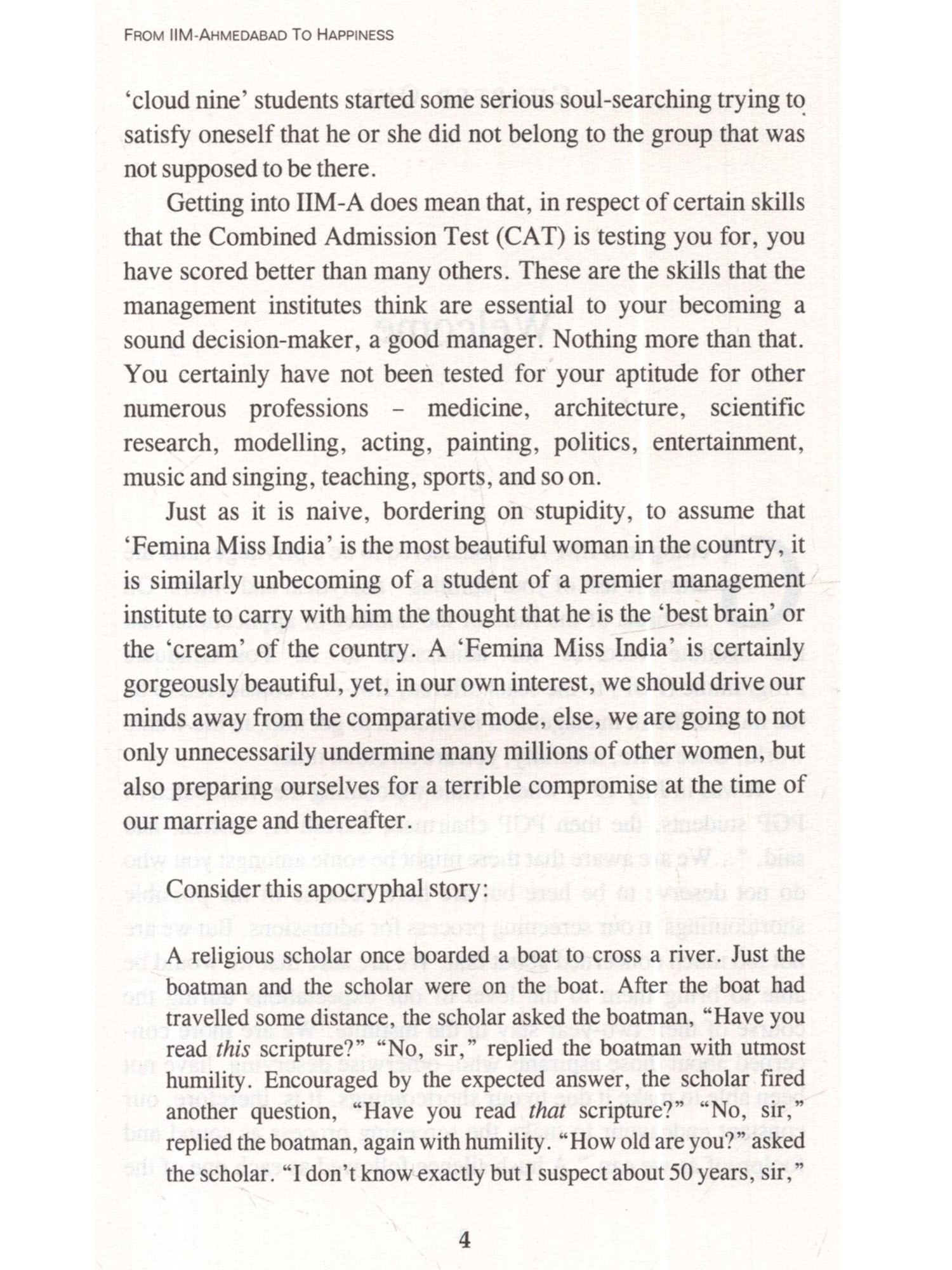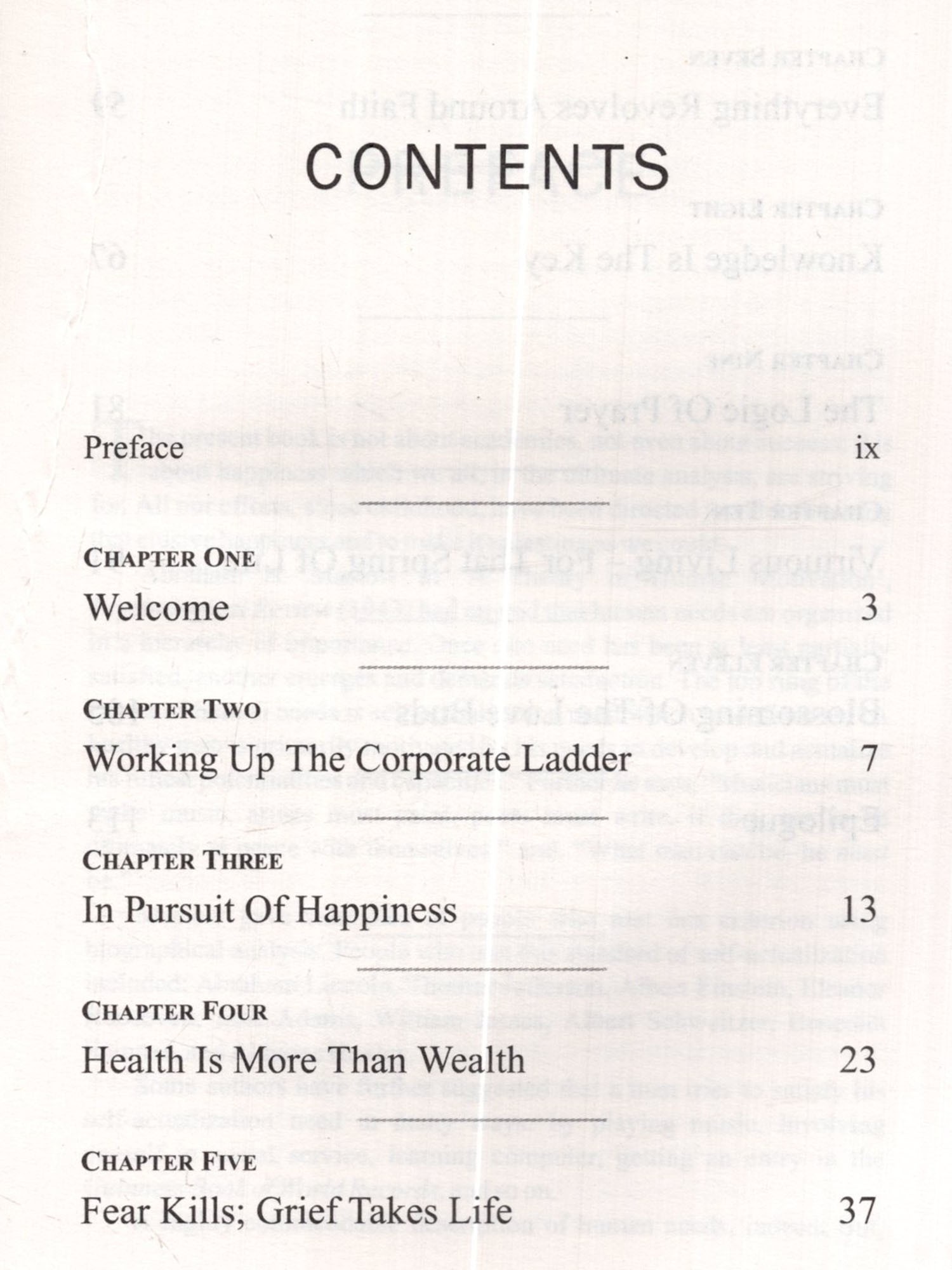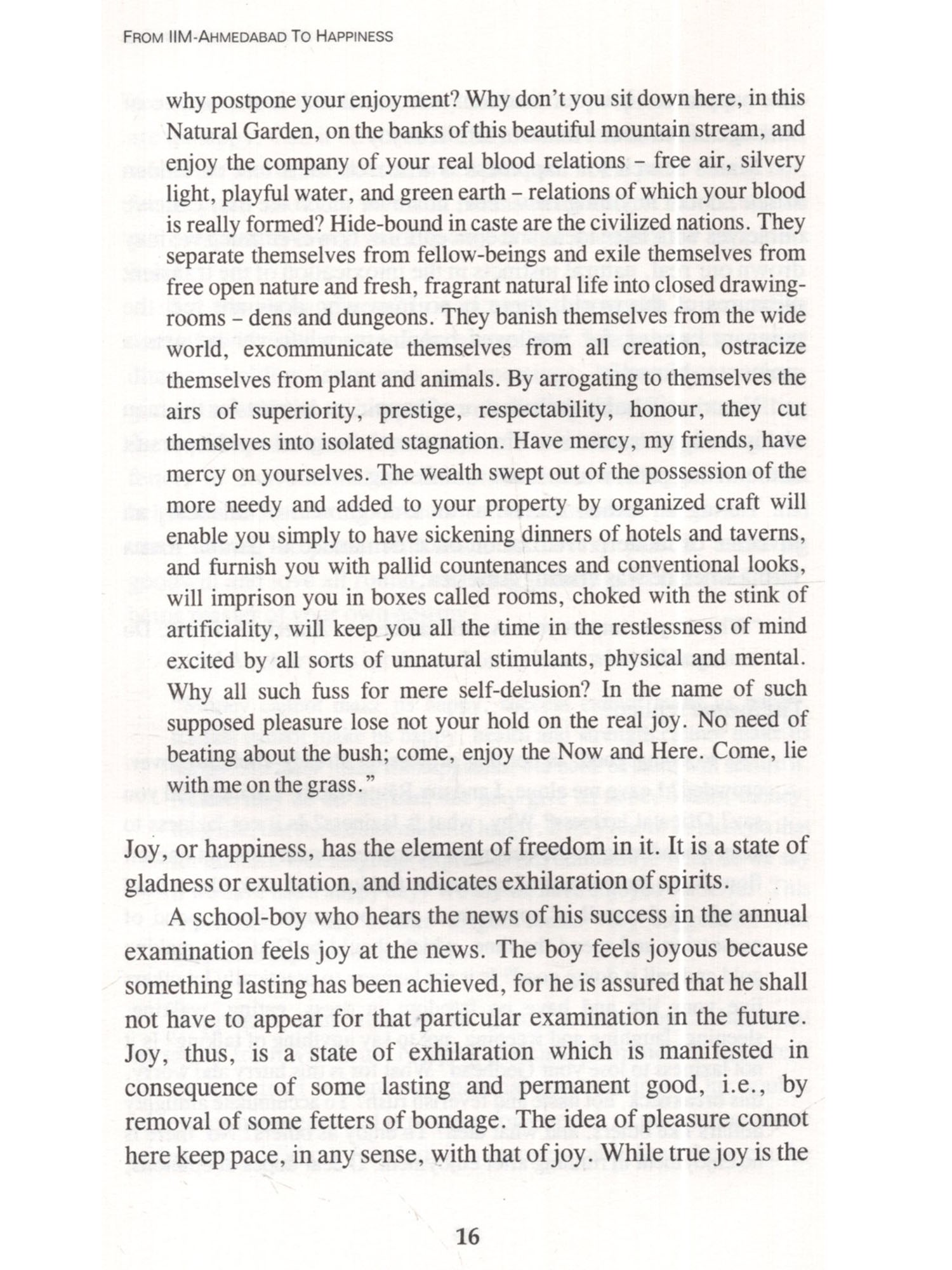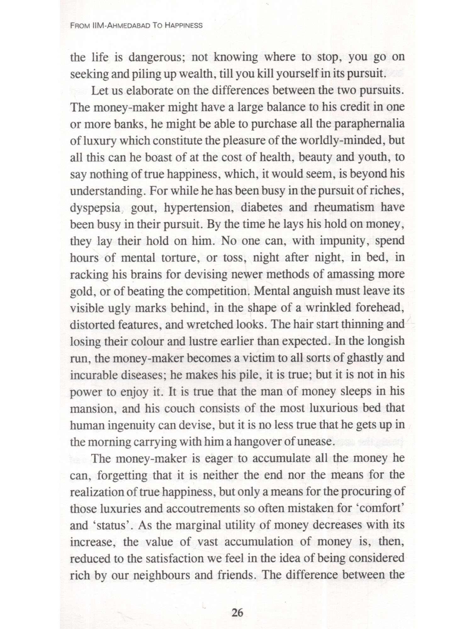 This book is not about academics, not even about success; it is about happiness which we all, in the ultimate analysis, are striving for. The book is for those who have achieved success in their worldly affairs but hold that their role in life is much bigger than just pushing figures, making strategies, and managing men. Happiness, the book suggests, resides not in any outside object, but must spring up from within. Man's search for happiness is a search for a lost or hidden article, not of anything new. Each one of us has the power to regain the lost health, vitality and happiness, provided one develops the right faith, attains knowledge and then follows the right path.