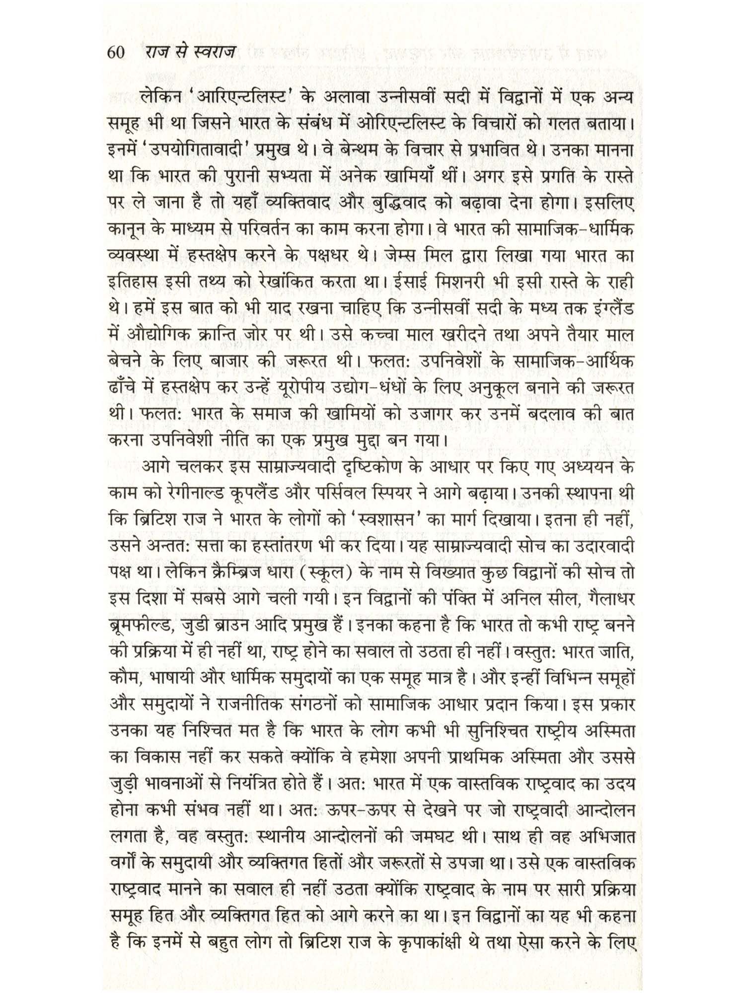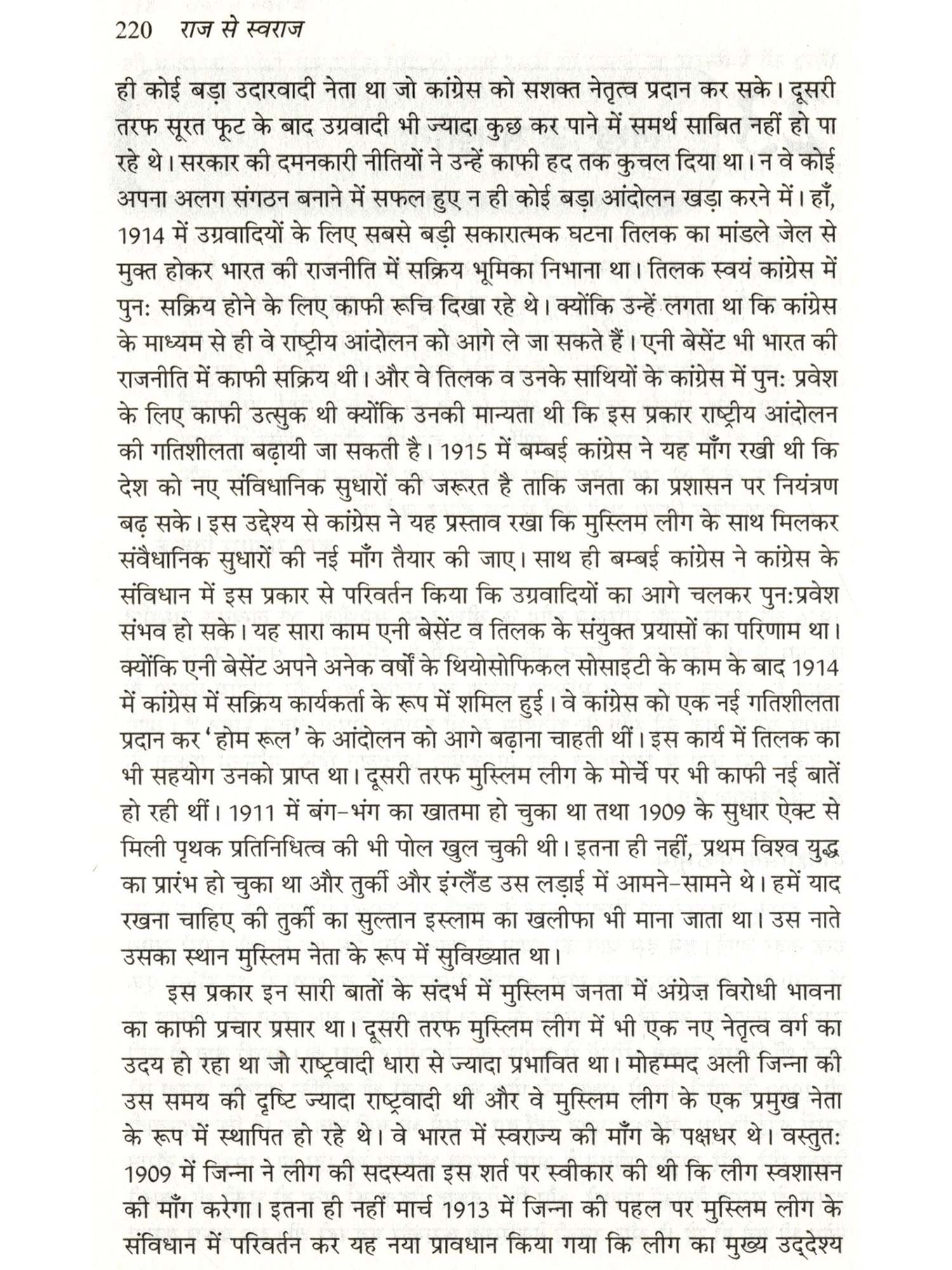 भारत में उपनिवेशवाद और राष्ट्रवाद के इतिहास को 'राज से स्वराज' में लिपिबद्ध किया गया है। साथ ही इस पुस्तक में कुछ सैद्धांतिक प्रश्नों पर भी विचार किया गया है। भारत की गुलामी की कहानी जितनी दर्दनाक और हृदय विदारक है, उतना ही रोमांचकारी है इसका स्वतंत्रता संग्राम। अपने अद्वितीय नेतृत्व क्षमता, गौरवमयी गाथा और अहिंसक वैचारिक आधार के चलते भारत की आजादी की लड़ाई इतिहासकारों का ध्यान बरबस आकर्षित करती रही है। यह पुस्तक मूलतः स्नातक और स्नातकोत्तर कक्षाओं के लिए उच्चस्तरीय और प्रामाणिक पाठ्यपुस्तक के रूप में प्रकाशित की गई है। यह लेखक के जीवनपर्यंत शोध, अध्ययन और अध्यापन की निष्पत्ति है। इस विषय पर उपलब्ध पुस्तकों से इसे कुछ अलग रखने का प्रयास किया गया है। इसमें घटनाक्रम के स्थान पर विषयानुकूल लेखन पद्धति को अपनाया गया है। साथ ही, इसमें आधुनिक भारत के इतिहास के हर पहलू और पक्ष पर गंभीरता से विचार किया गया है। अपनी रोचक शैली, संप्रेषण की सहजता और भाषा प्रवाह के चलते यह पुस्तक पठनीय-माननीय बन गई है। अंग्रेजी में इस पुस्तक के अनेक संस्करण प्रकाशित हो चुके हैं। पाठकों की माँग पर इसका हिंदी का यह संवर्द्धित-परिवर्द्धित संस्करण प्रकाशित किया जा रहा है। यह पुस्तक राजनीति विज्ञान तथा आधुनिक भारत के इतिहास के छात्रों के साथ-साथ सामान्य पाठकों के लिए भी समान रूप से उपयोगी साबित होगी।