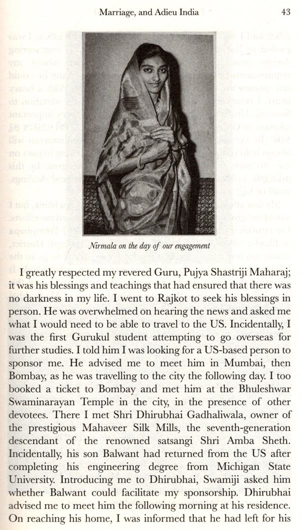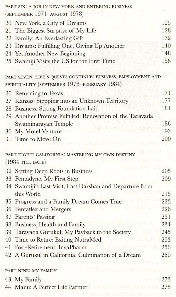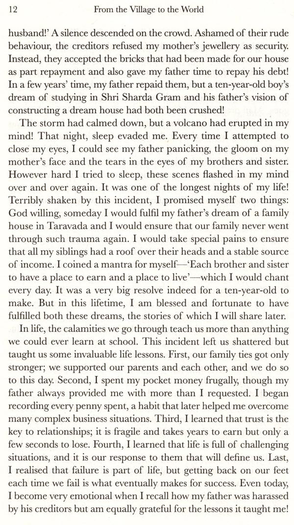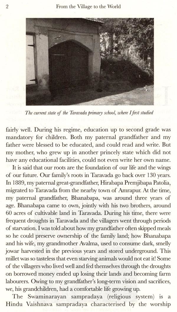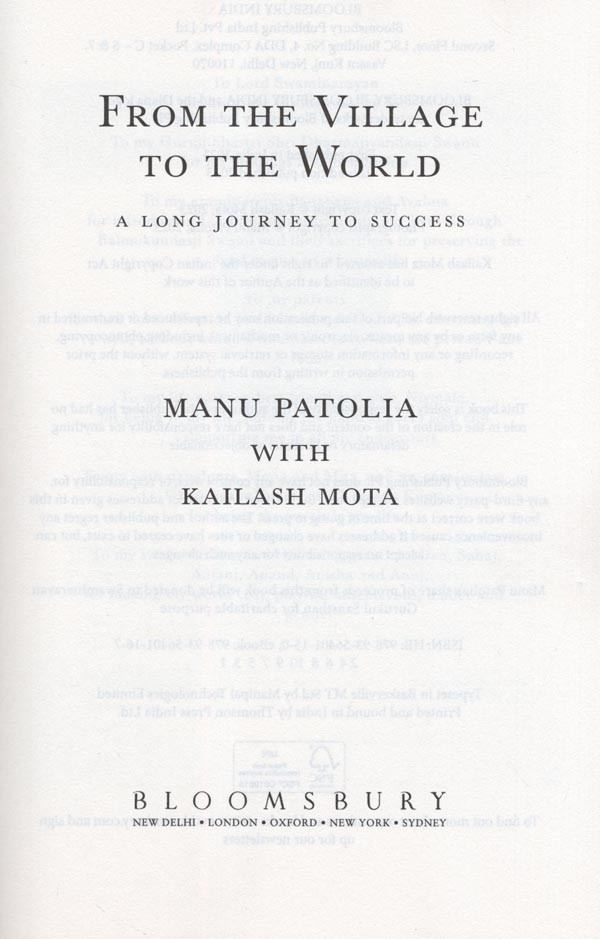 From the Village to the World is the inspiring story of Manu Patolia whose journey began in the village of Taravada in Gujarat. It traces five decades in the life of Manu Patolia, from when he landed in San Francisco in 1969 with only 75 cents in his pocket. He fulfilled his dream of graduating as a civil engineer and through sheer entrepreneurial chutzpah built an empire in excess of US$250 million. All the while, he continued to support his entire family and the Swaminarayan Gurukul and contributed to the rise and welfare of the Swaminarayan Sampradaya in India and the USA. This stirring account encourages the young and ambitious to dream big, work hard and believe in themselves in order to fulfil their goals.