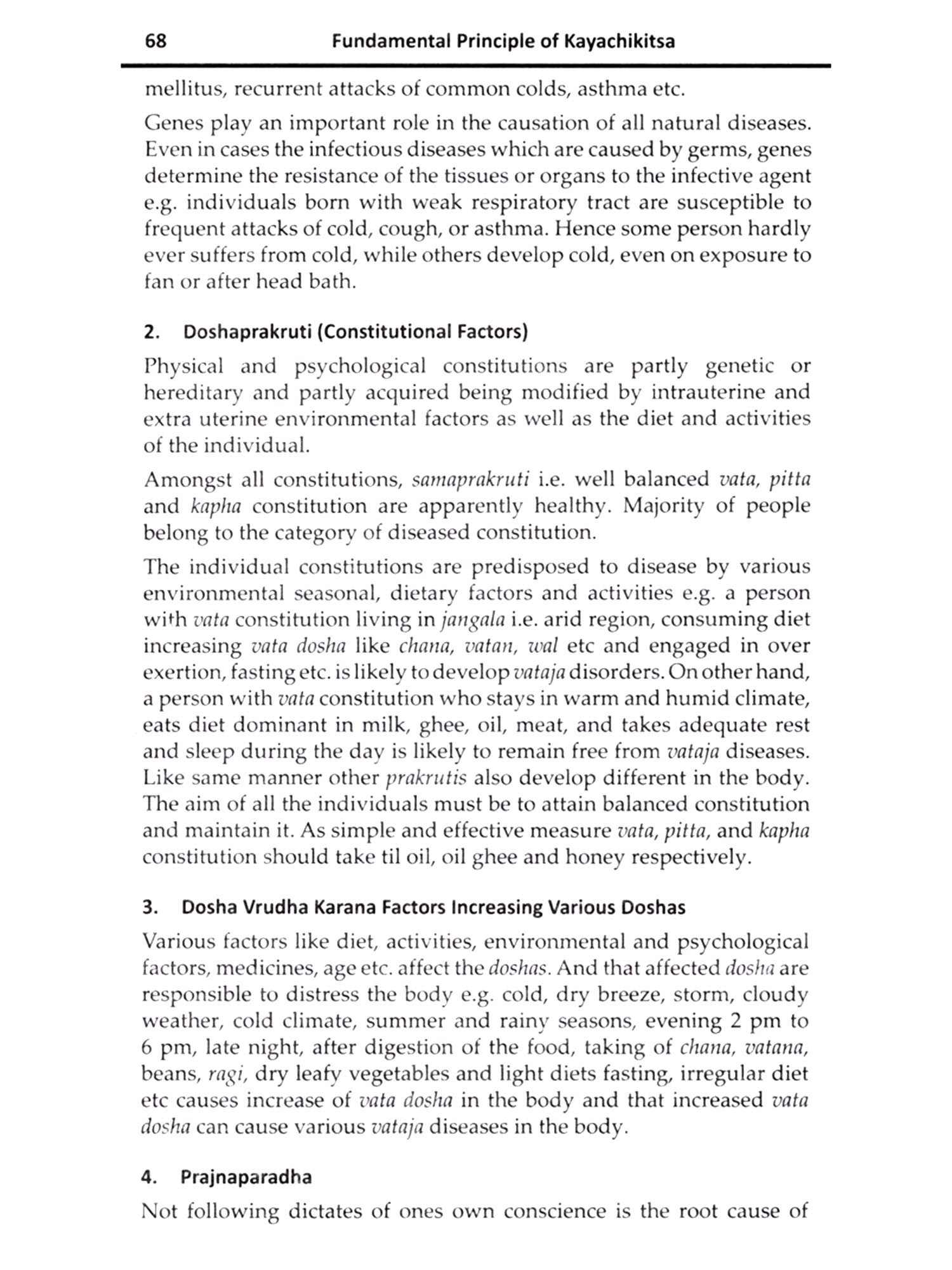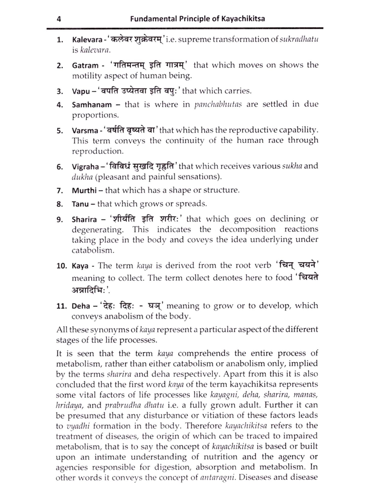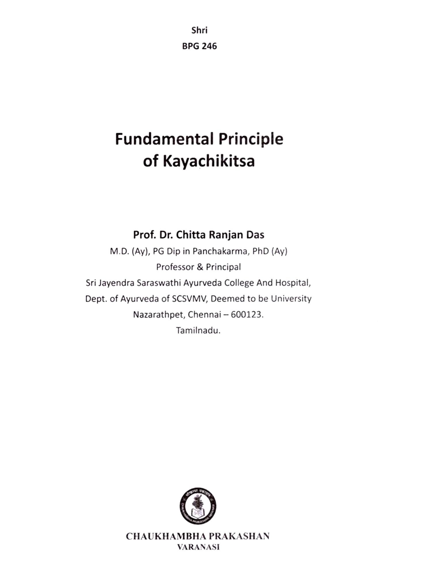 Ayurveda, the eternal science of life, surpassing all imaginations regarding its origin, having been taught to mortals by Lord Brahma, the god of creation himself, has divided in eight branches for clear and critical understanding as well as practical therapeutic application. Kayachikitsa is one of these eight branches of Ayurveda. The main aim of Ayurveda is to keep the human beings healthy and to provide long life. This is only possible by different types of chikitsa mentioned in kayachikitsa. The book "Fundamental Principles of Kayachikitsa" in English is written for the students of B.A.M.S. and M.D. (Ay). The subject matter has been gathered from different samhita granthas, granthas and modern textbooks for this compilation work. In addition to this other essential matters and modern descriptions are also incorporated to make the work most updated with compressive one.