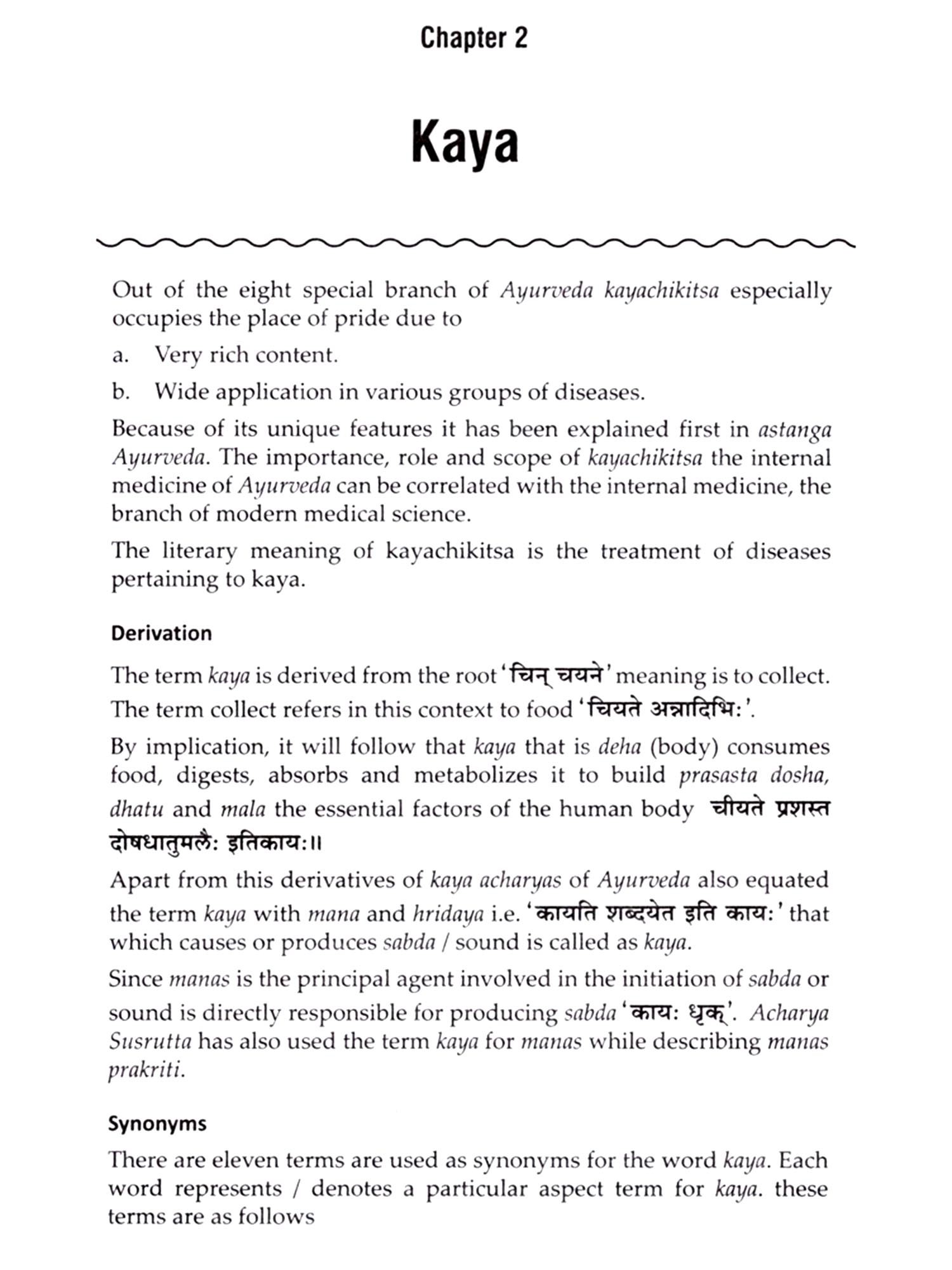 As per the modern systems of medicine, where the subject internal medicine deals with the major study, so also in Ayurveda kayachikitsa proclaims a major part of the ancient medicinal system. Actually no other branch of Ayurveda has claimed as much importance and attention as kayachikitsa has given. The term kaya is derived from the root verb "चिन् चयने" meaning to collect. The term collect denotes here to food "चियते अन्नादिभिः". By implication it refers that kaya i.e. body takes in food, digests, absorbs and metabolizes it. In brief the term kaya means the building up the body with food. The term kayachikitsa refers to the treatment of diseases, the origin of which can be traced to impaired metabolism, that is to say, the concept of kayachikitsa is based upon an intimate understanding of nutrition and the agency responsible for digestion, absorption and metabolism. To clucidate more clearly kayachikitsa is based on the concept of antaragni (internal agent responsible for digestion, absorption and metabolism). Diseases and disease syndromes which arise in the wake of the disturbed functioning of "antaragni" and the treatment for the same, is dealt with kayachikitsa. Therefore kayachikitsa is mainly concerned with the principles and methods of treatment of diseases primarily of endogenous origin engendered by the impairment of nutrition and metabolism. It embraces the entire body. Defining the kayachikitsa acharya Susrutta has stated that kayachikitsa is the branch of Ayurveda which deals with the cure of the disease like Fever, Rakta pitta (Haemophillia), Sosha (consumption), Unmada (insanity), Apasmara (epilepsy), Kustha (Leprosy), Prameha (Abnormal excretion of different essential elements of the body with urine including diabetes), Atisara diarrhoea) etc embracing the entire body.