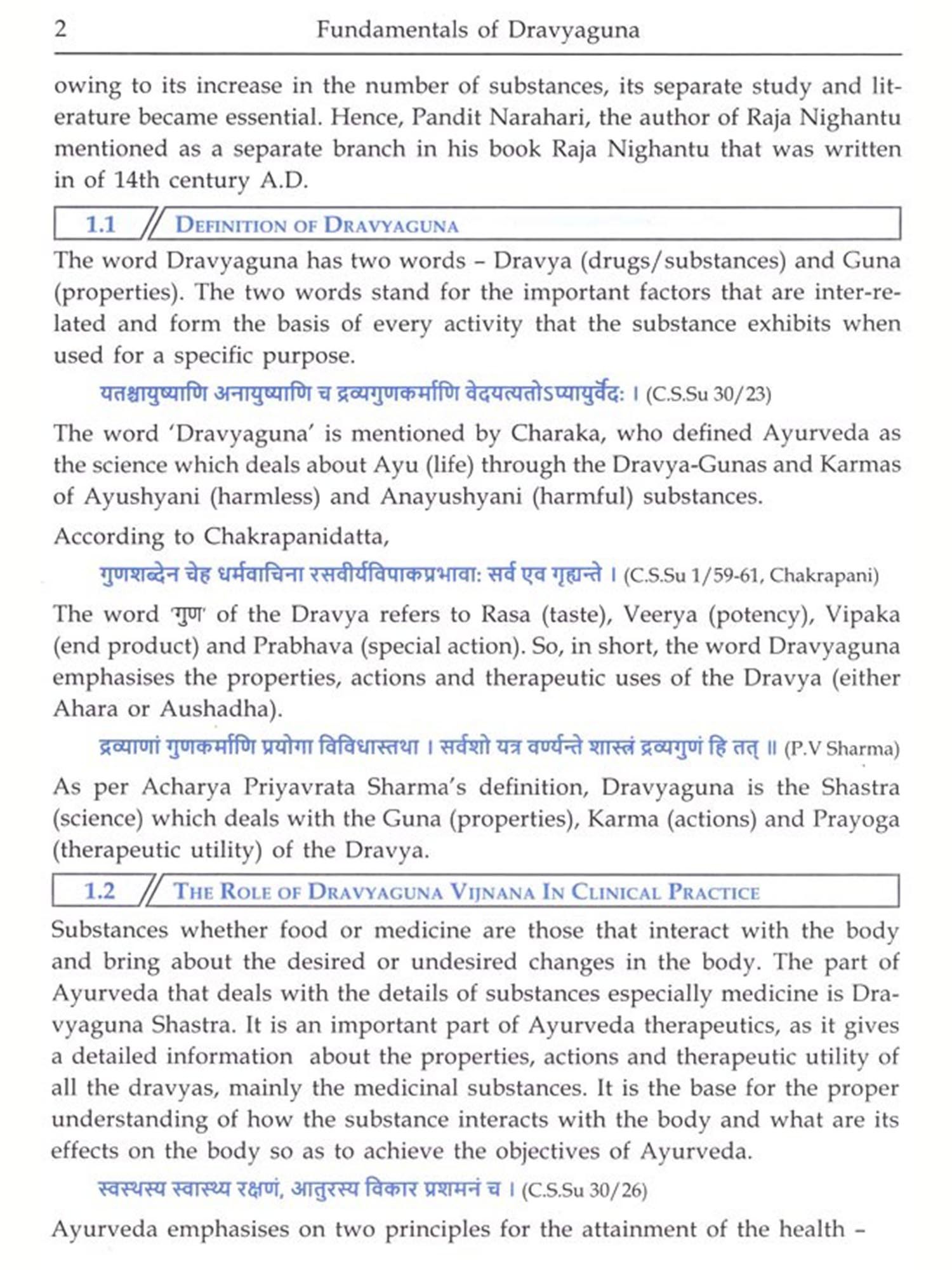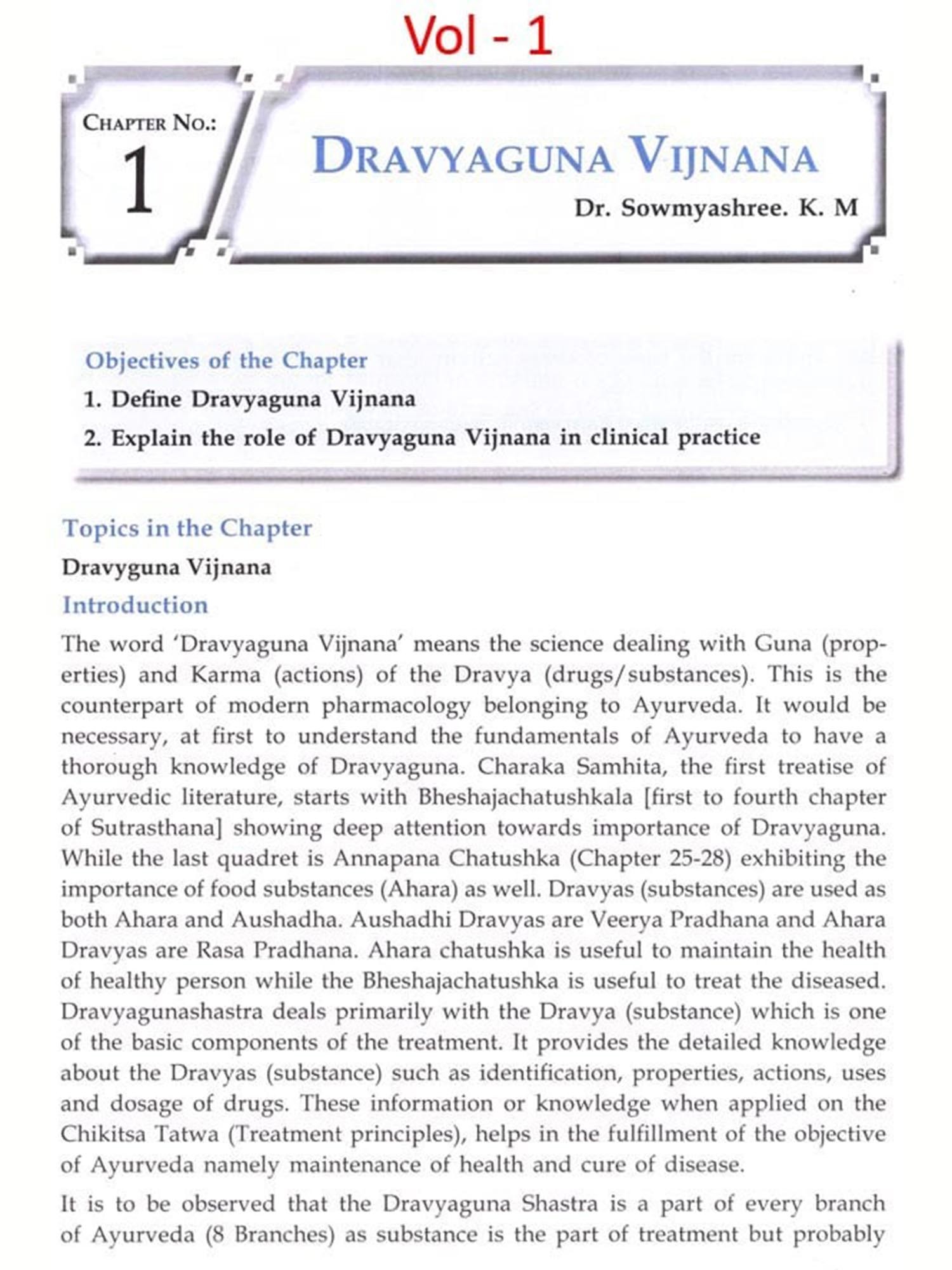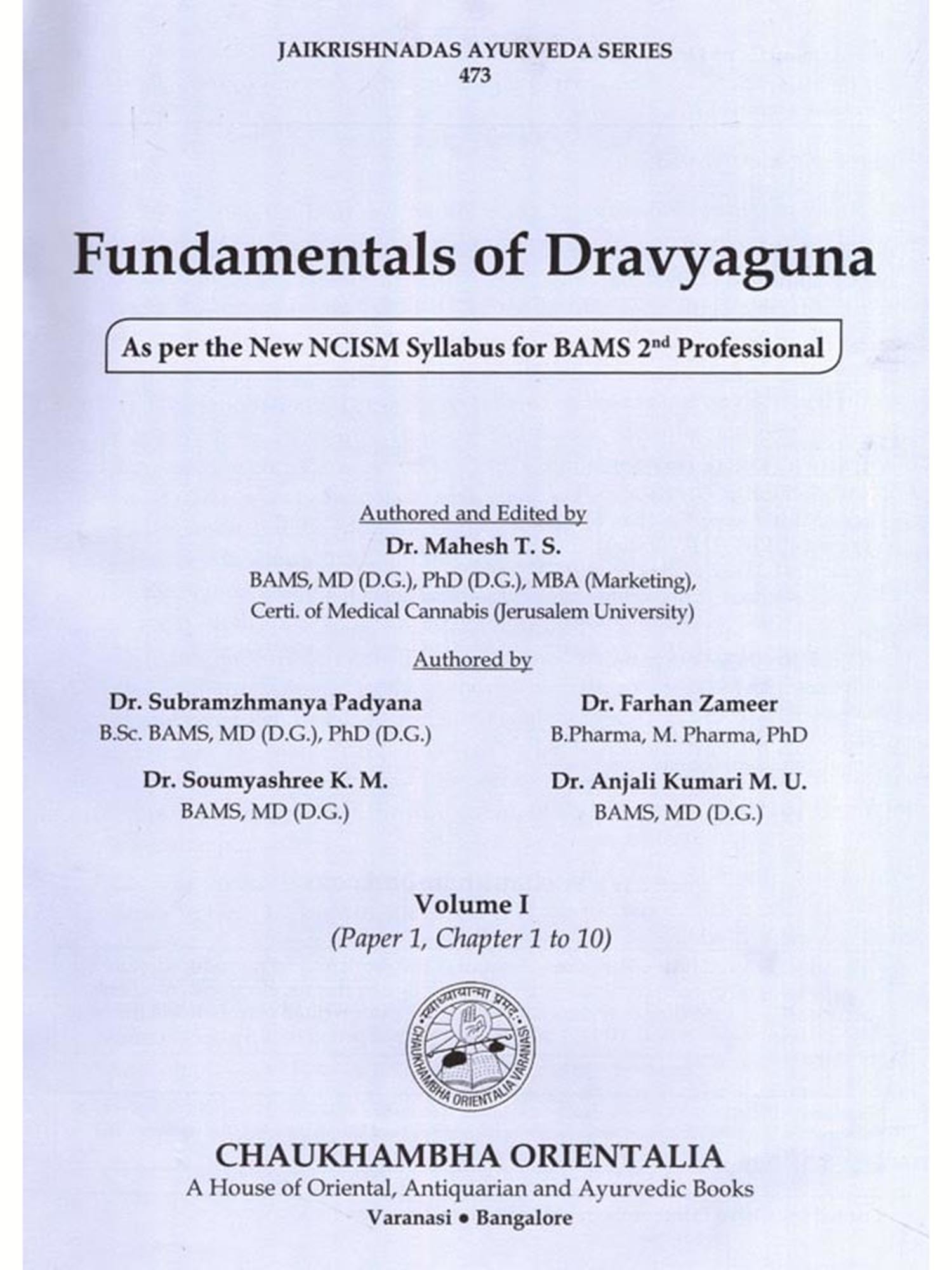 The present paper titled "Fundamentals of Dravyaguna" is divided into 2 volumes. Volume 1 deals with the first 10 chapters mentioned in the syllabus, while the remaining 12 Chapters of to Dravyaguna Paper 1 are will be explained in Volume 2. These chapters contain the basic concepts and principles of Dravyaguna which are obtained from the Ayurvedic literature. The relevant research contents and references are also being highlighted in the text by the authors. The authors have also emphasized the importance of Dravyaguna along with the possible modern correlations to make it more compatible with the requirements of the syllabus.