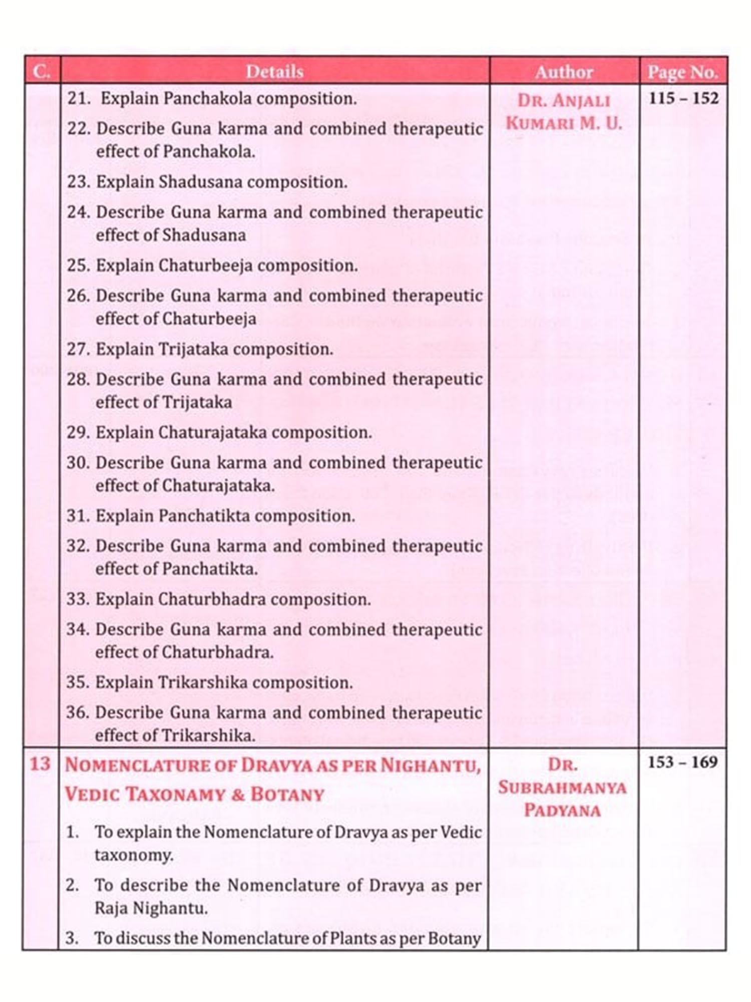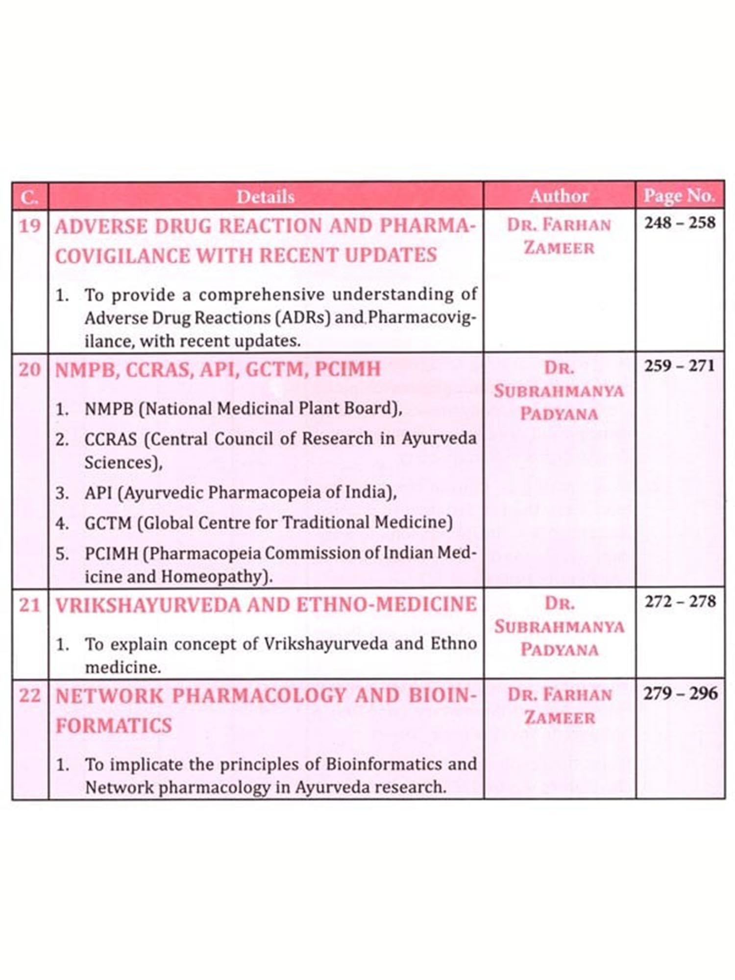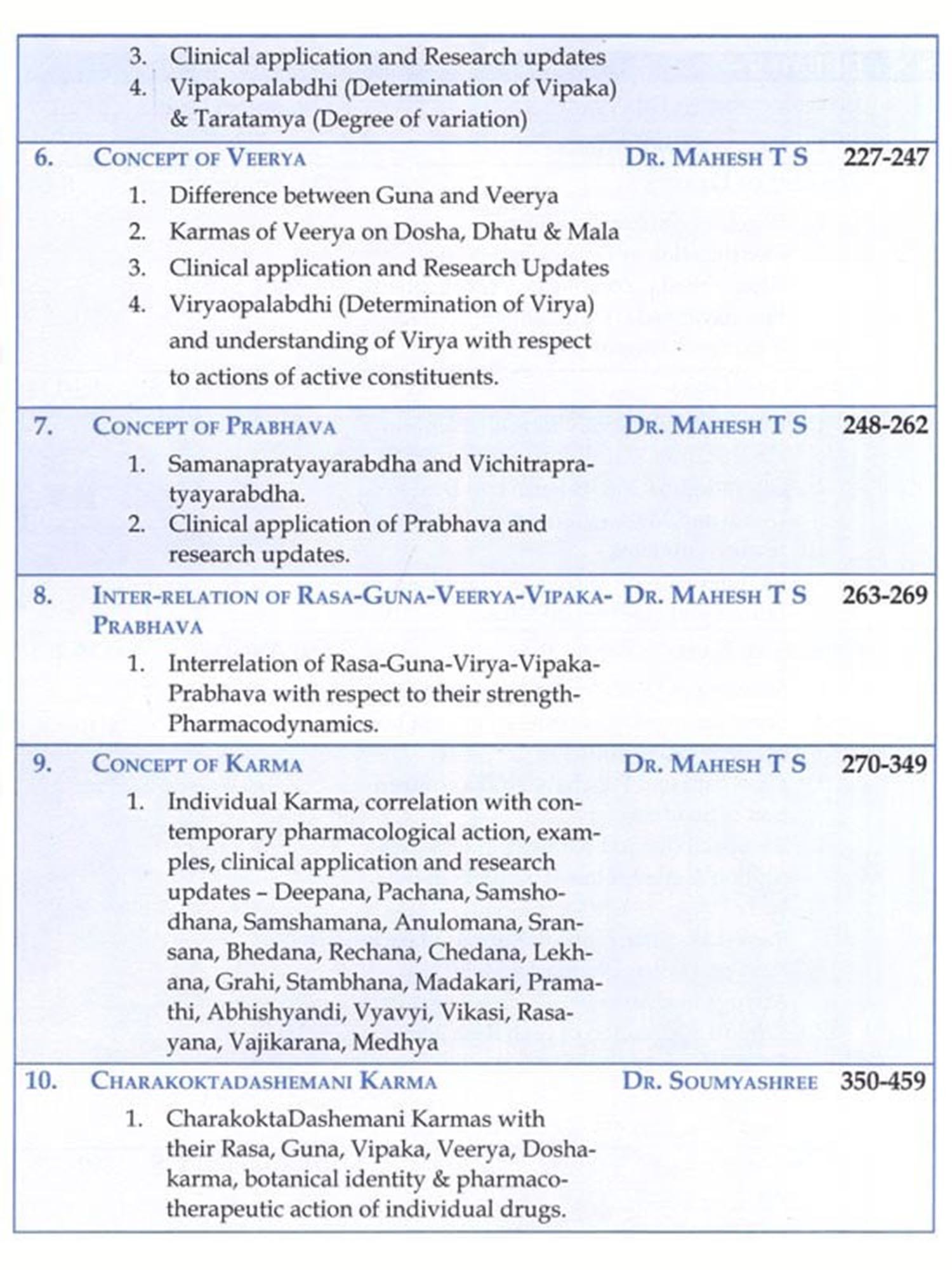 In the present era, where new substances are being studied and incorporated into the system, needs a very comprehensive knowledge of the concepts that are necessary to evaluate it. Hence, the present governing body of Ayurveda, NCISM has devised a syllabus that have emphasized the objective of giving more depth into the concept and also ways to evaluate them. Thus, in view of the syllabus being mentioned by NCISM, the book systematically covers it and presents in front of the stakeholders accordingly.