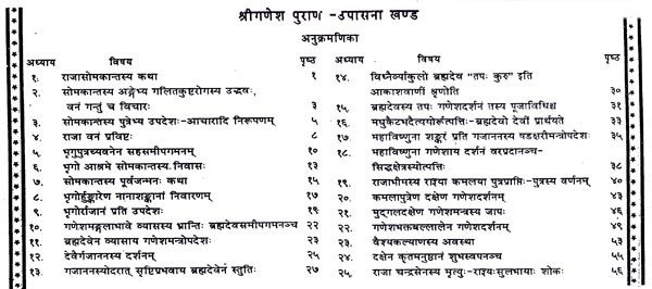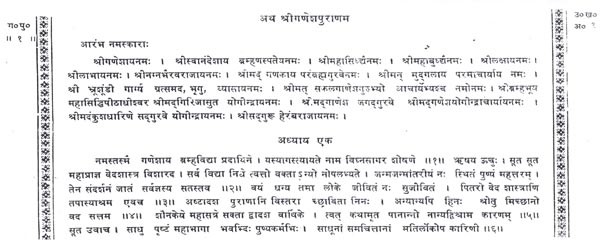 As usual, Ganesa Purana is also recited by Suta in the naimisaranya in the course of the twelve-year sacrifice performed by Saunaka. The sages have already grasped the eighteen Puranas. Now they request Suta to recite other Puranas (anyany api). So Suta prefers to recite the first upapurana dealing with Ganesa. The order of transmission of this Ganesapurana is mentioned as Brahma-Vyasa-Bhrgu.